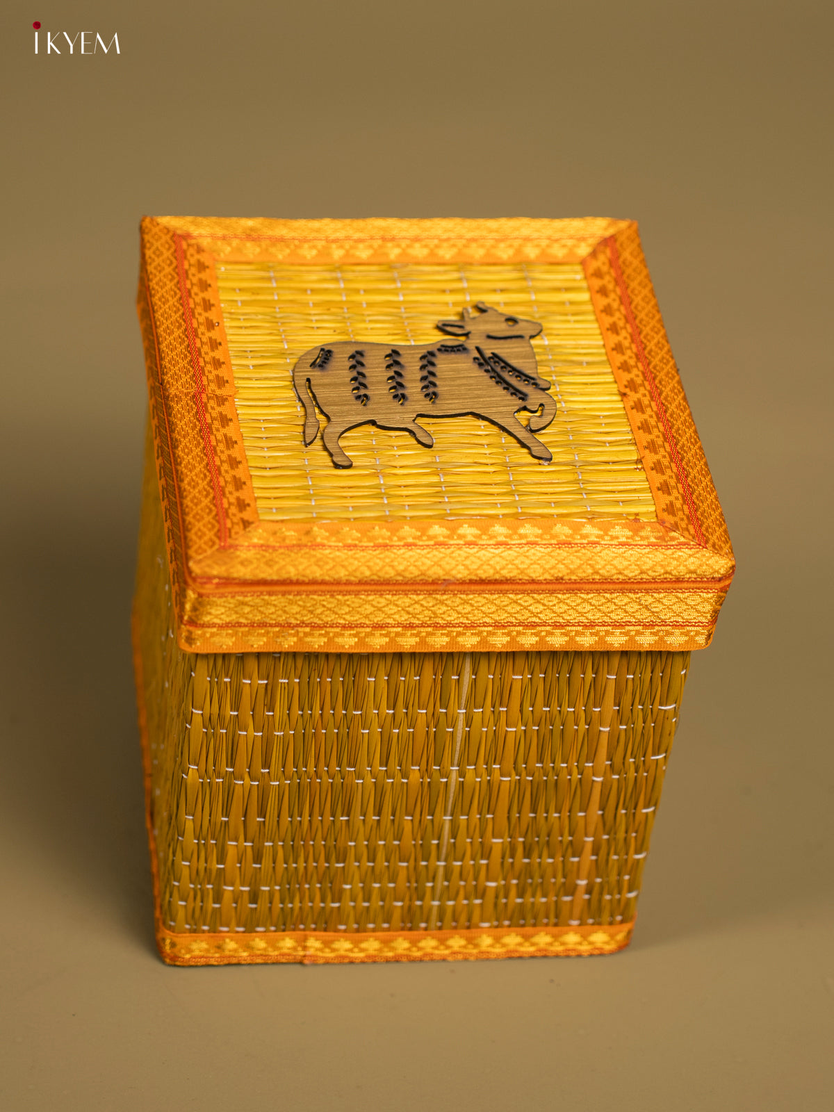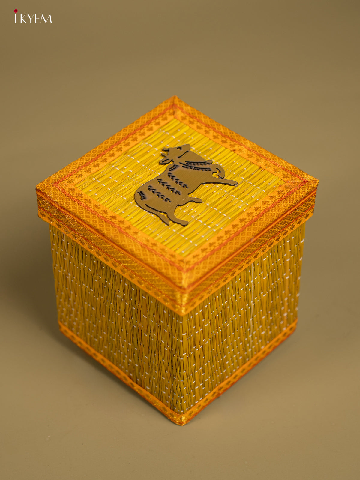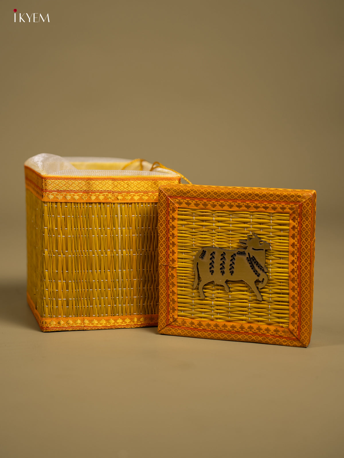 Yellow Korai Gift Box with Net Potli & Cow Motif - KF25162