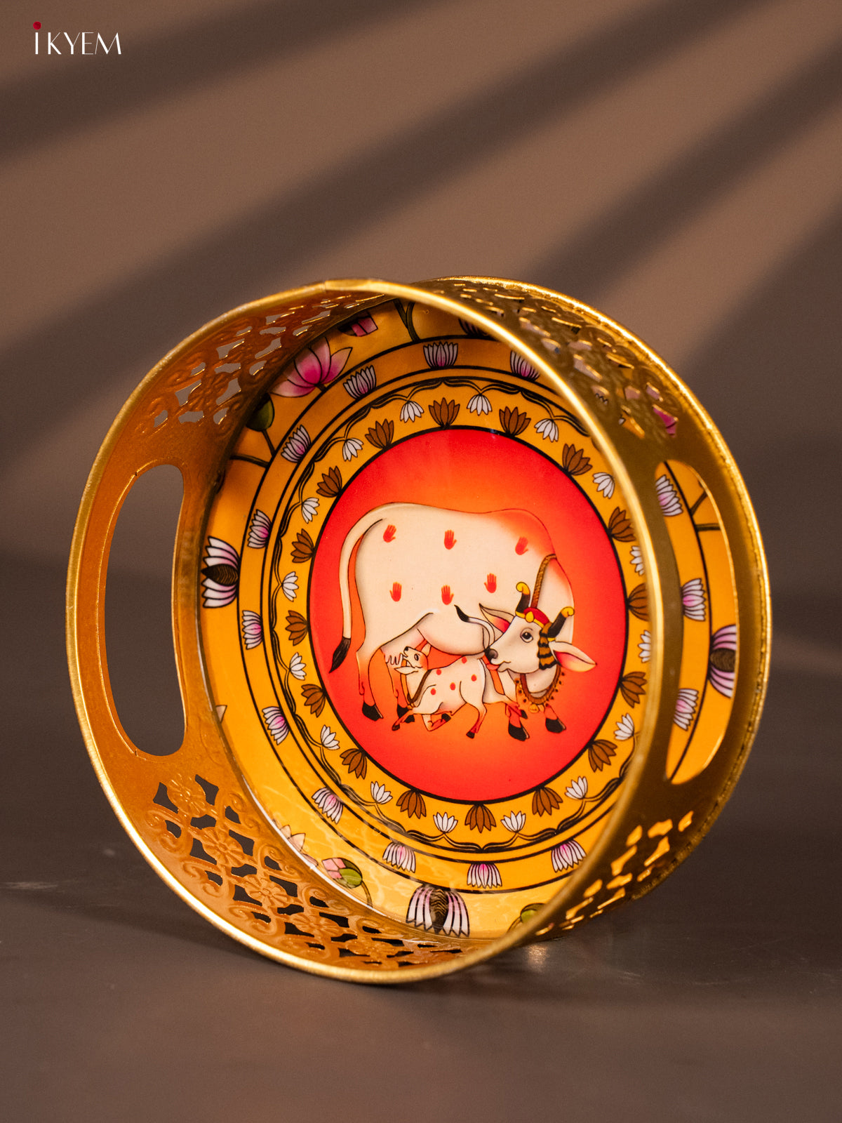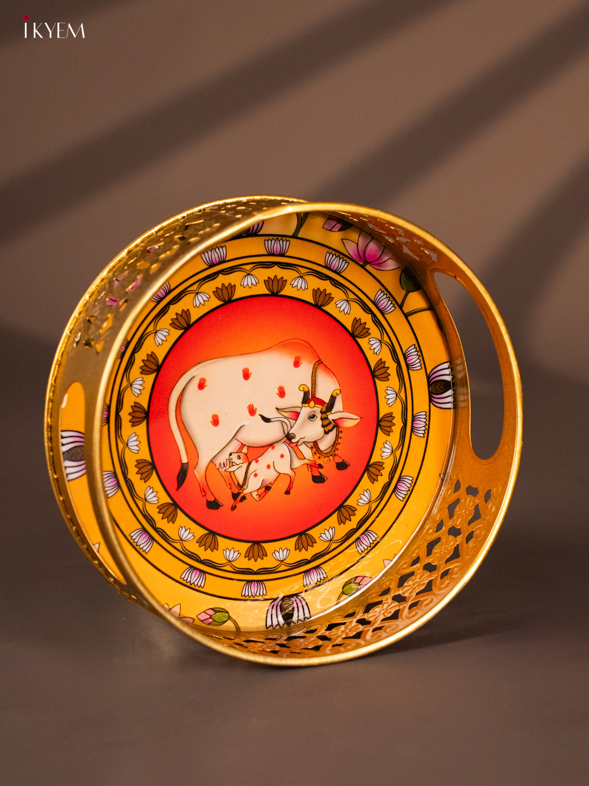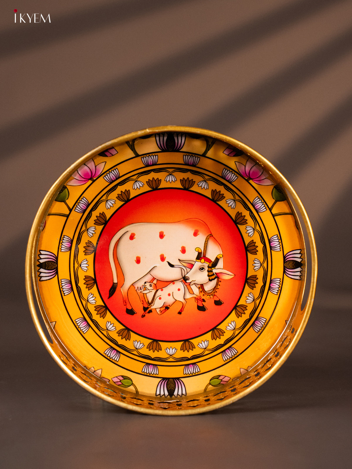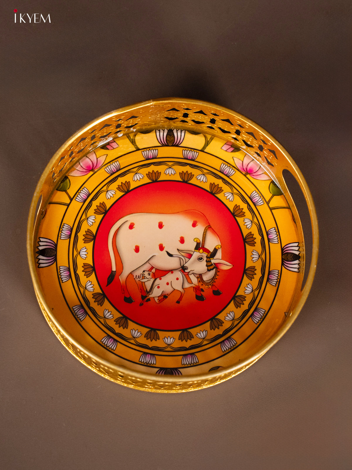 Yellow & Red Decorative Round Tray with Cow & Calf Digital Print - KH22123