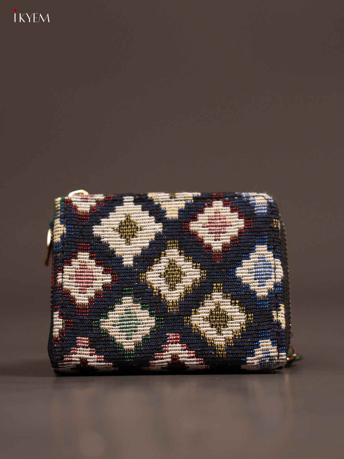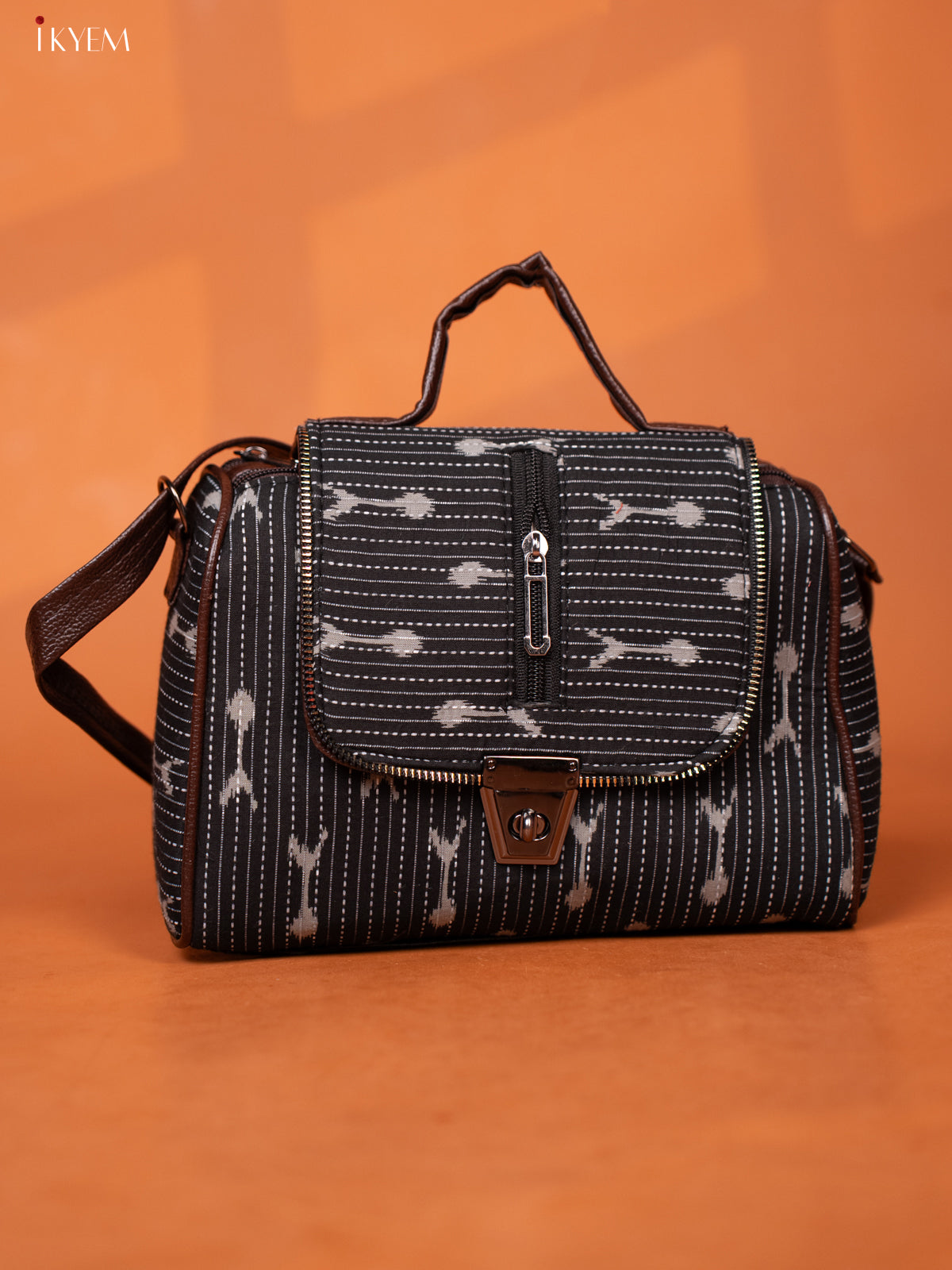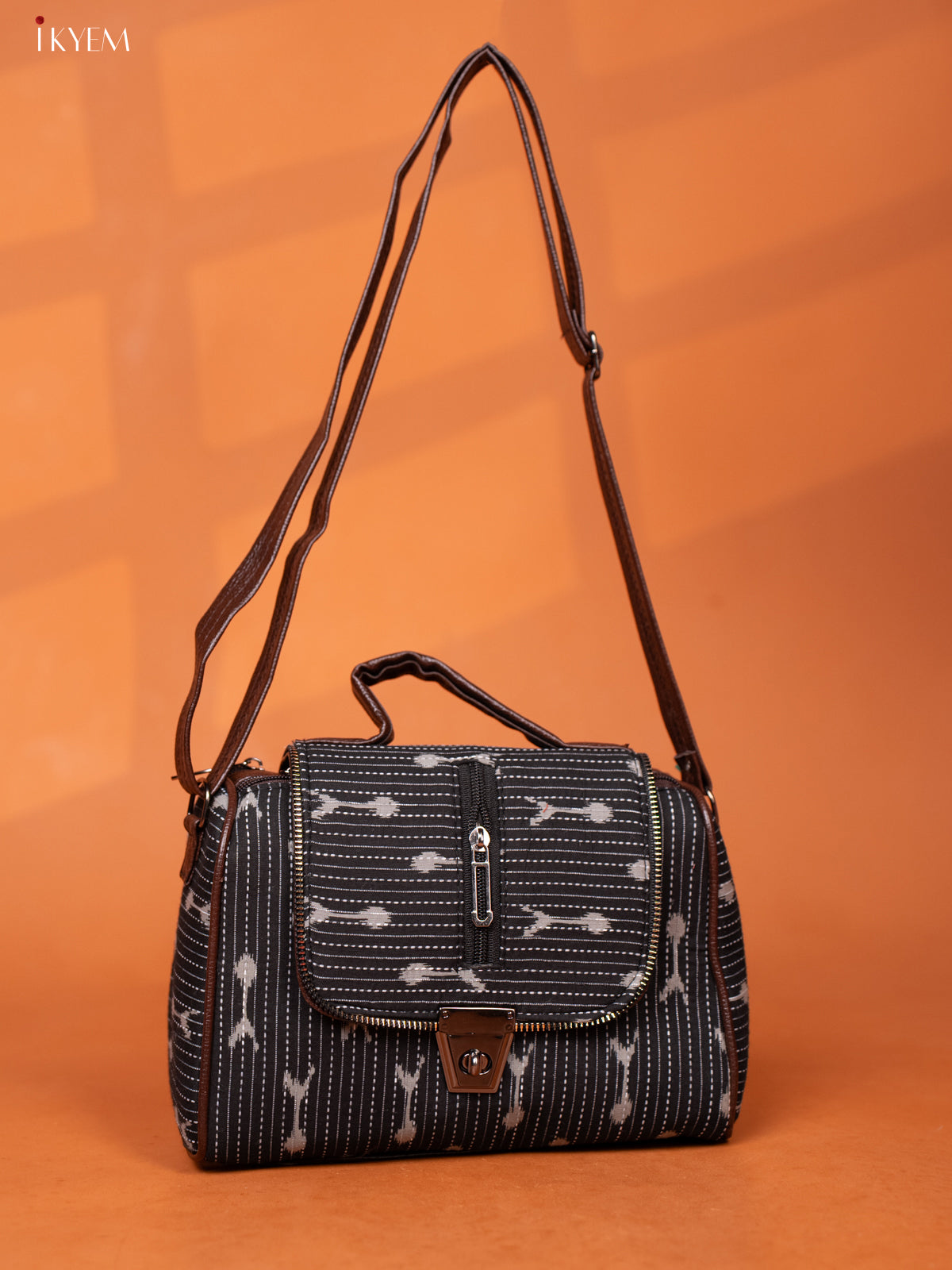 Ikkat Printed Leather Sling bag with Gusset & Flap - Black - KD26937