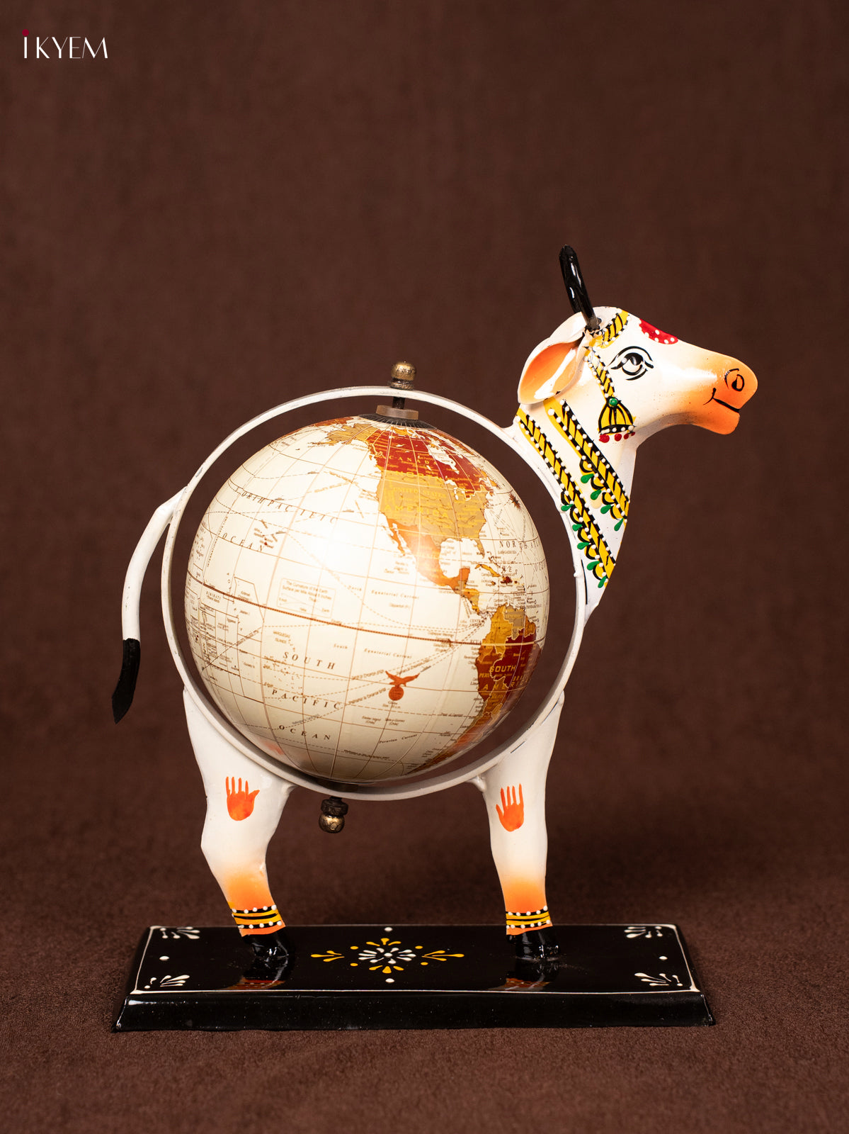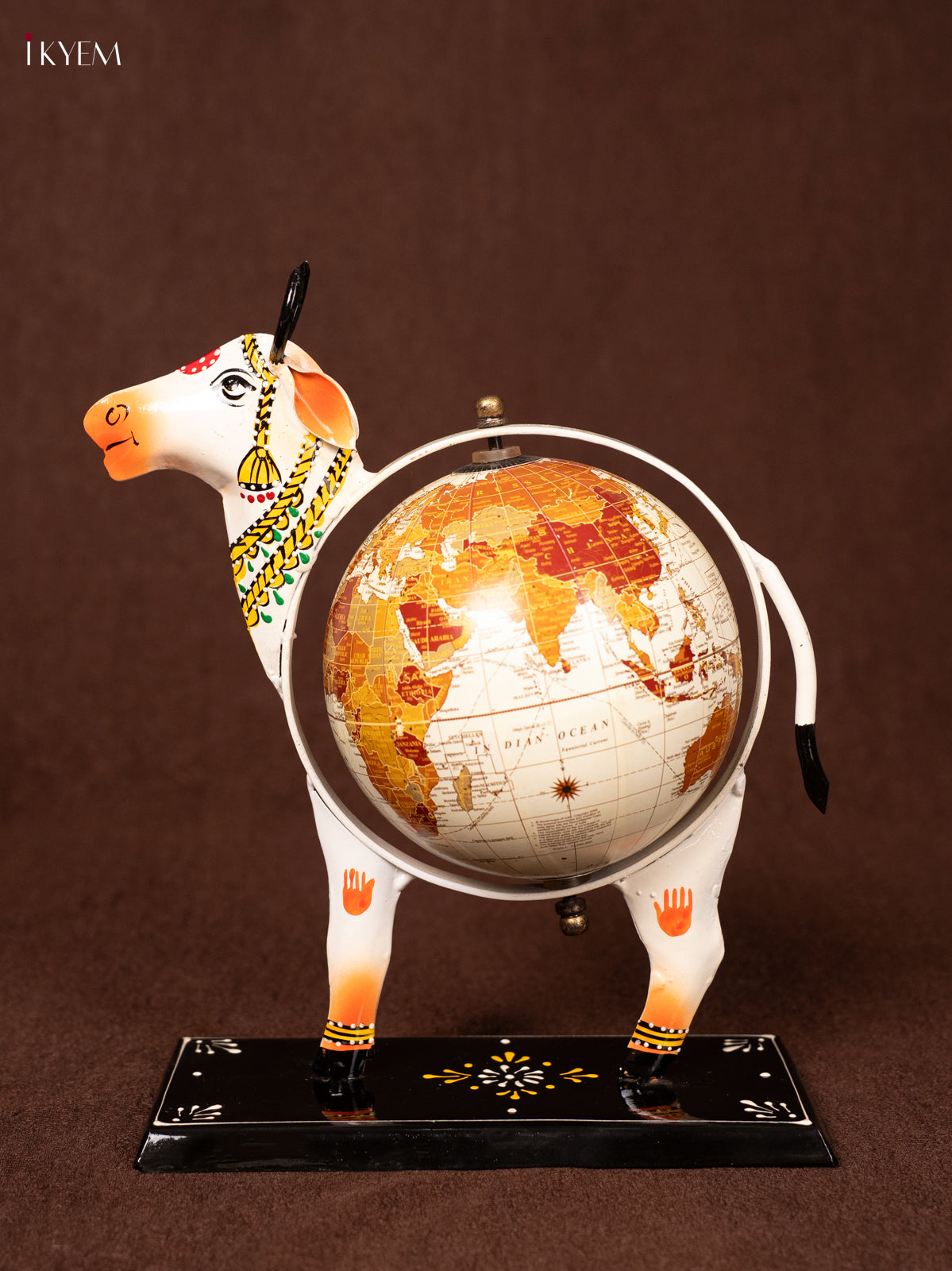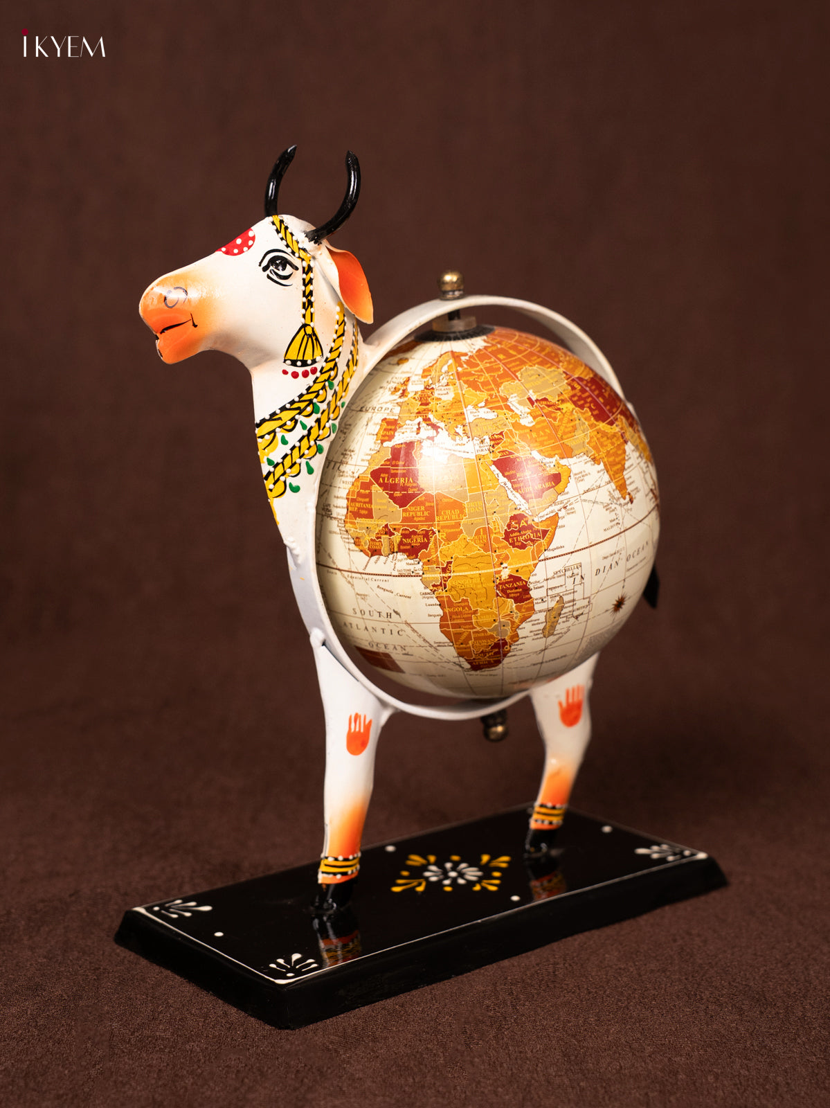 - A unique fusion of a world globe with a handcrafted metal cow, creating an eye-catching and meaningful decor accent