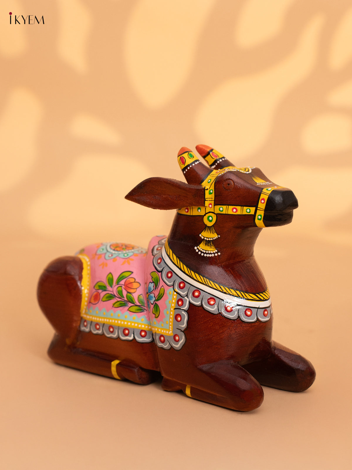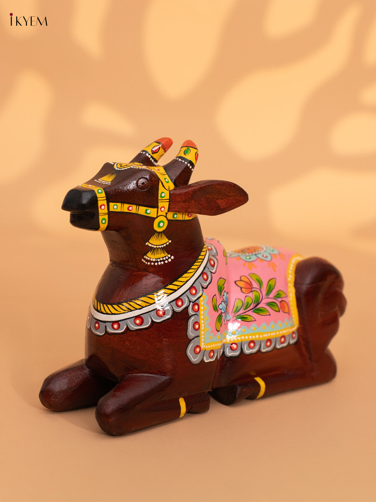 This beautifully handcrafted wooden Nandhi figurine features intricate pink hand‑painted detailing, ideal for living rooms, mandirs, entryways, or festive decor. With 7(In) height, 9(In) breadth, and 3.5(In) depth and weighing 675 g, it blends artisan craftsmanship with timeless cultural appeal.