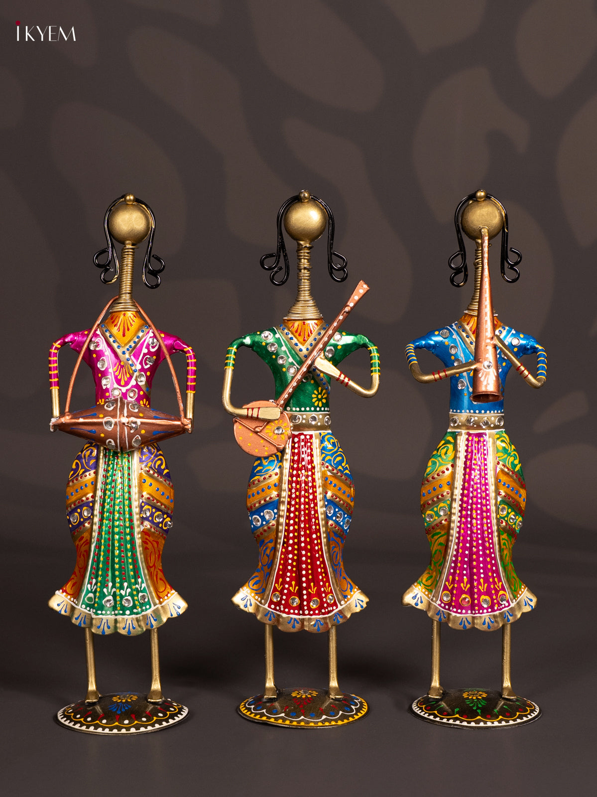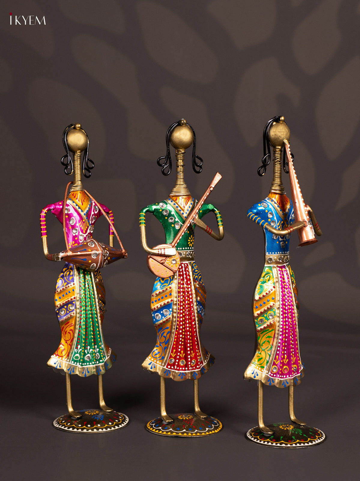 • The Metal Painted Musical Women (Set of 3) image is to showcase a decorative handcrafted figurine set intended for aesthetic and cultural