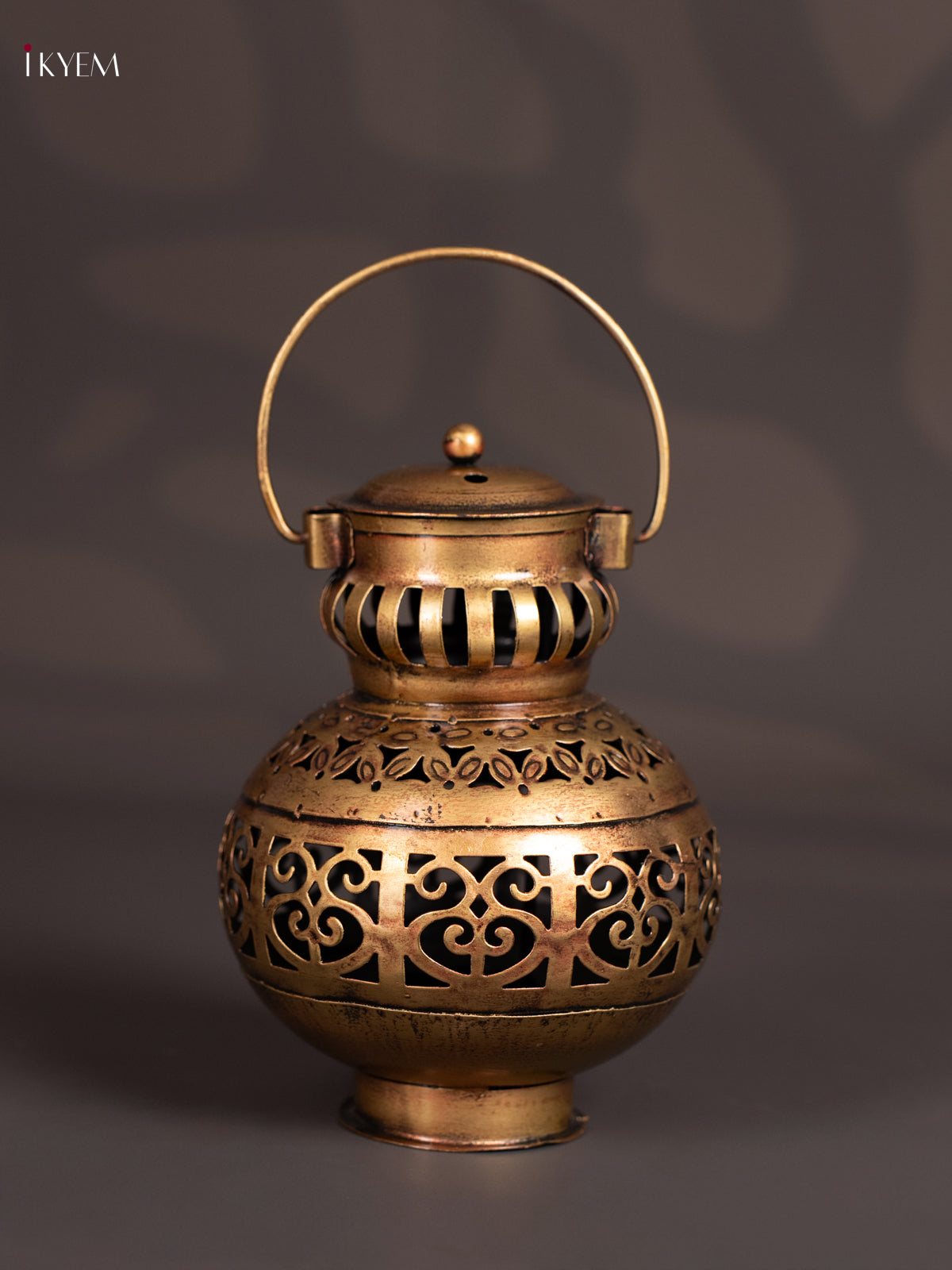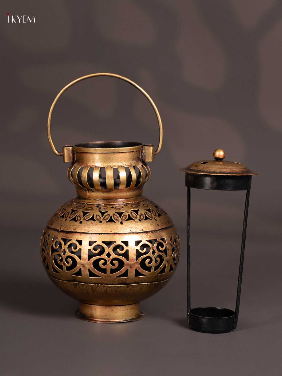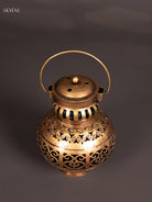 - Designed to hold a tea light candle inside, the perforated metalwork allows warm light to glow through the cut patterns, creating a soft and inviting ambience