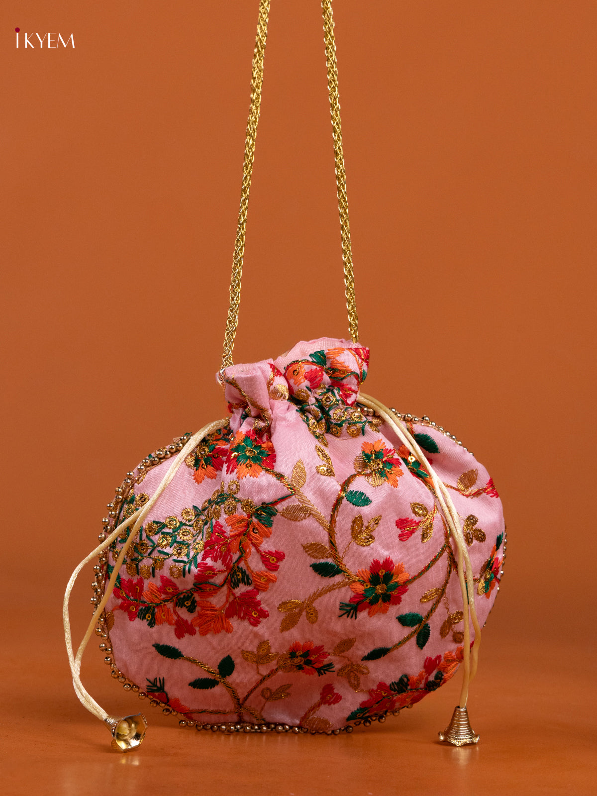 - The Embroidered Floral Design Potli Bag Baby Pink is a traditional yet elegant accessory created to combine functionality with rich ethnic aesthetics