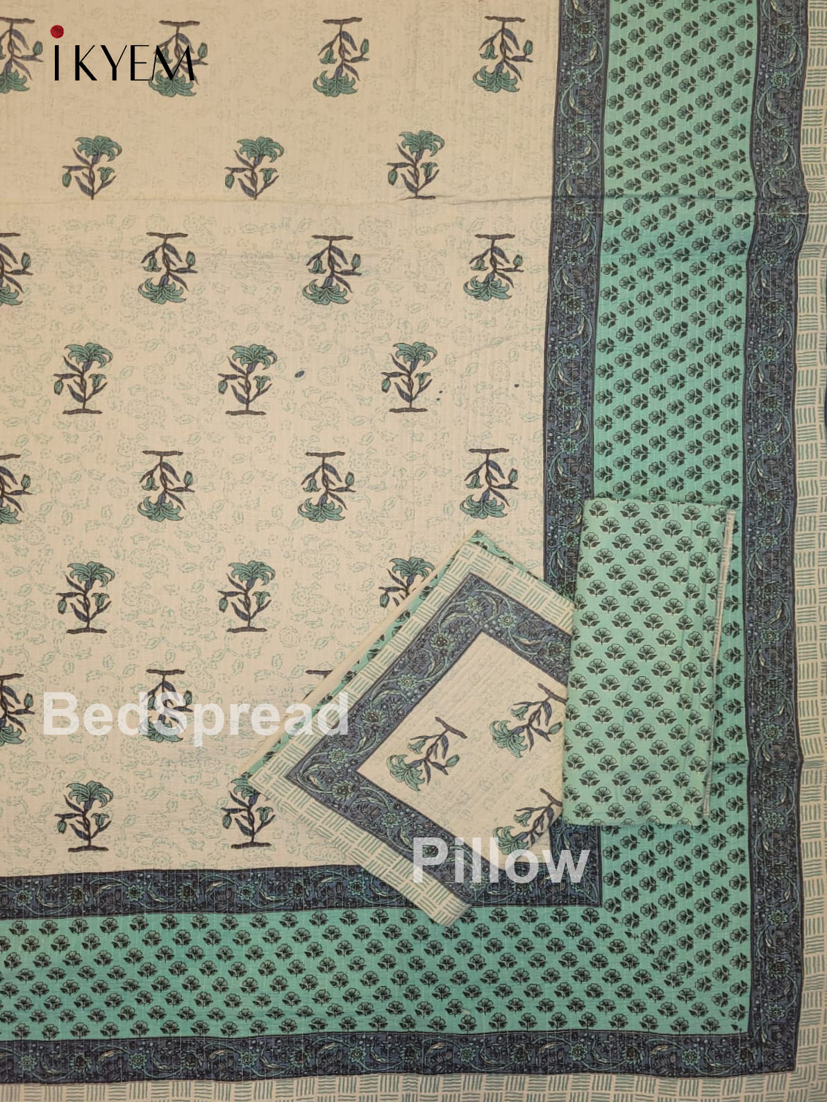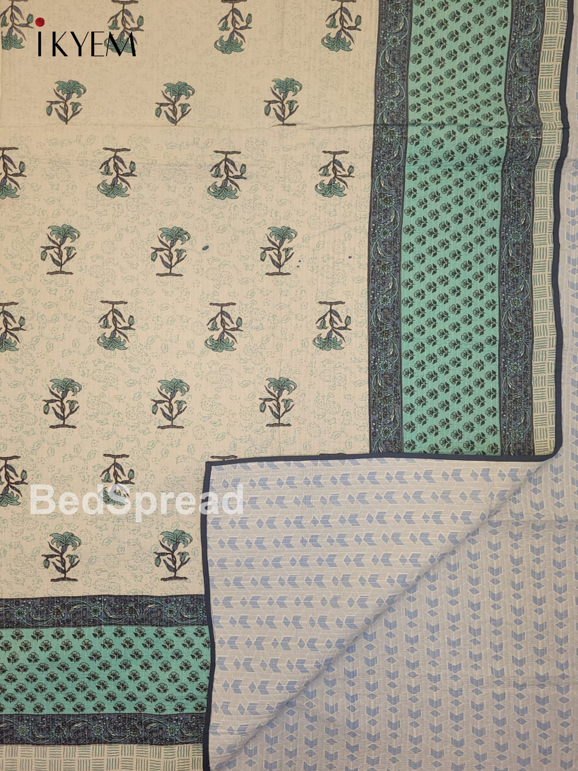 Elegant Cream & Blue Printed Bedspread, complete with two matching pillow covers. Adorned with stunning floral designs and vibrant hues, this bedspread is crafted from high-quality cotton for the ultimate combination of style and coziness