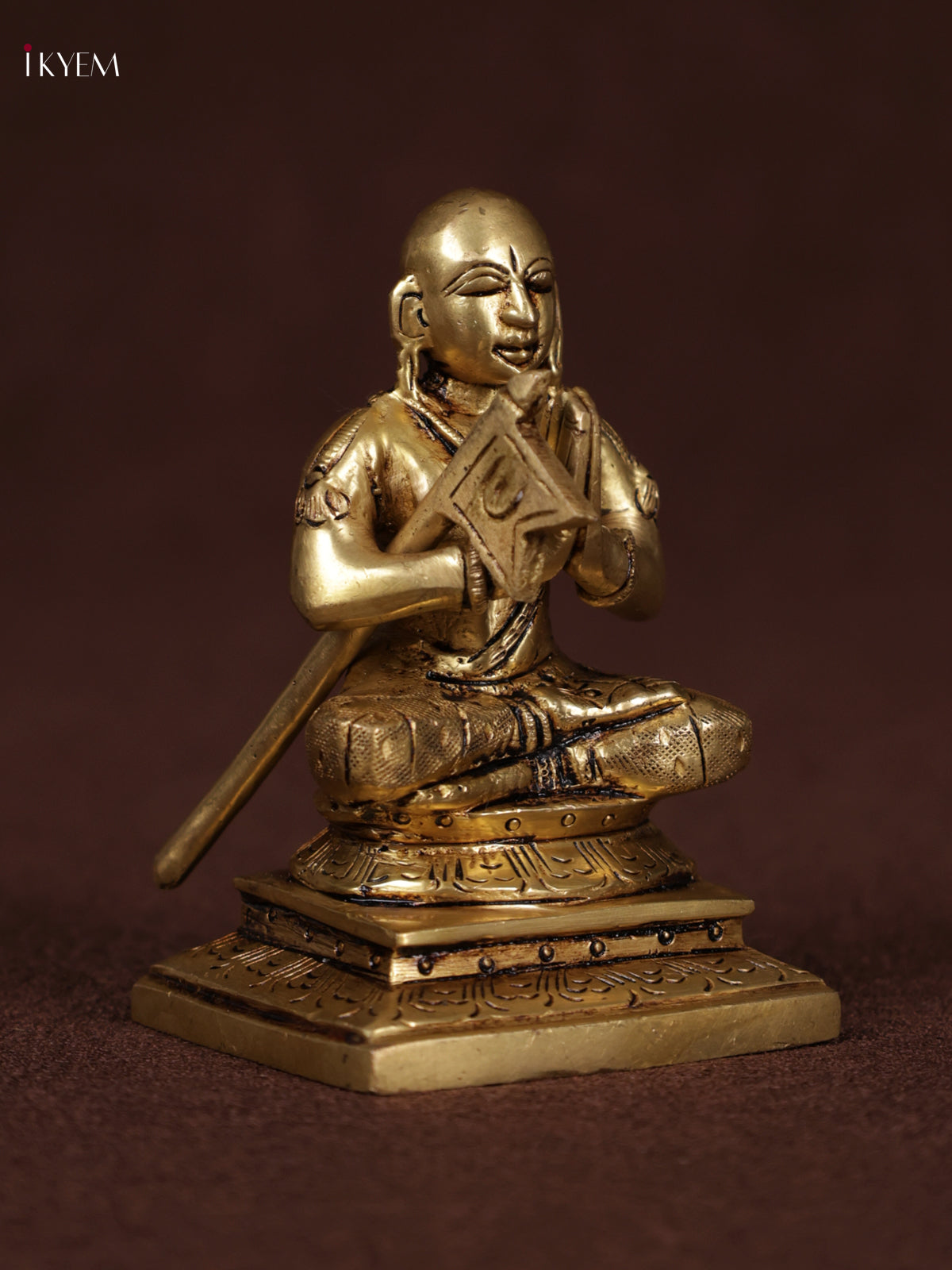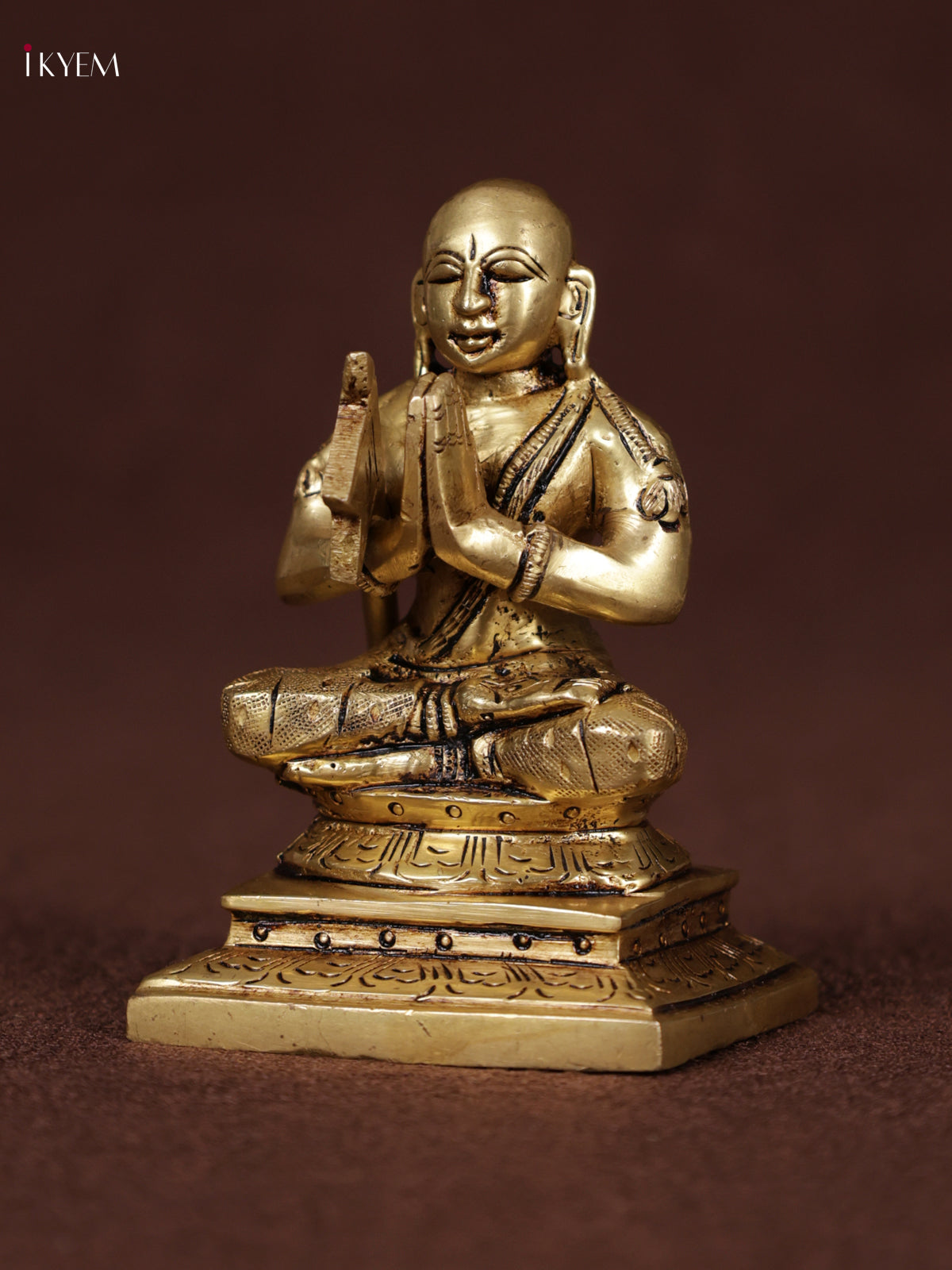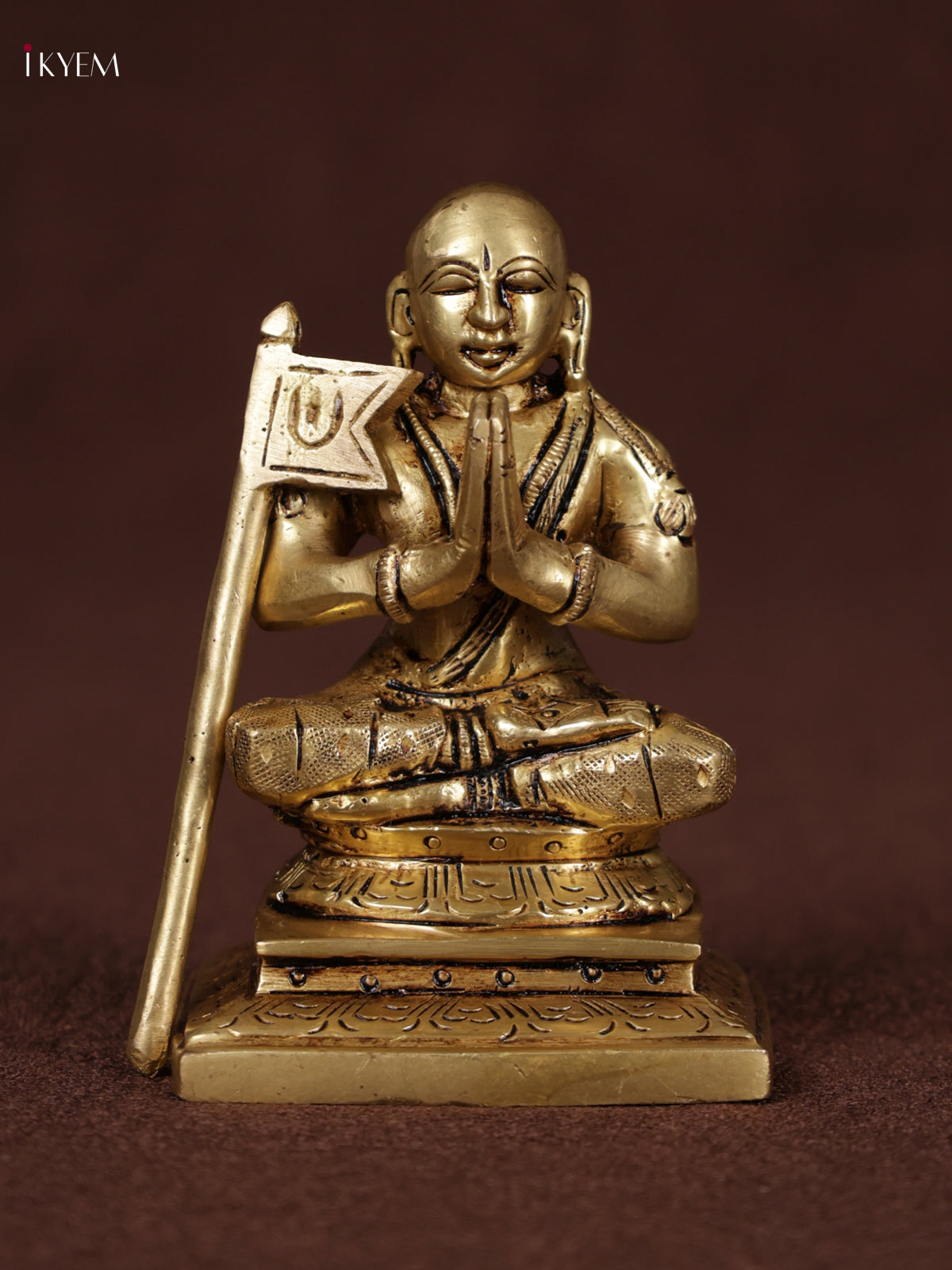 Symbolic Meaning: Anjali mudra (folded hands) → humility, surrender, and devotion Seated posture → calm wisdom and spiritual authority Danda (staff) → renunciation and discipline Sacred insignia (Urdhva Pundra) → devotion to Vishnu - The brass material is valued for its durability, traditional significance, and ability to retain spiritual energy, making it suitable for long-term worship