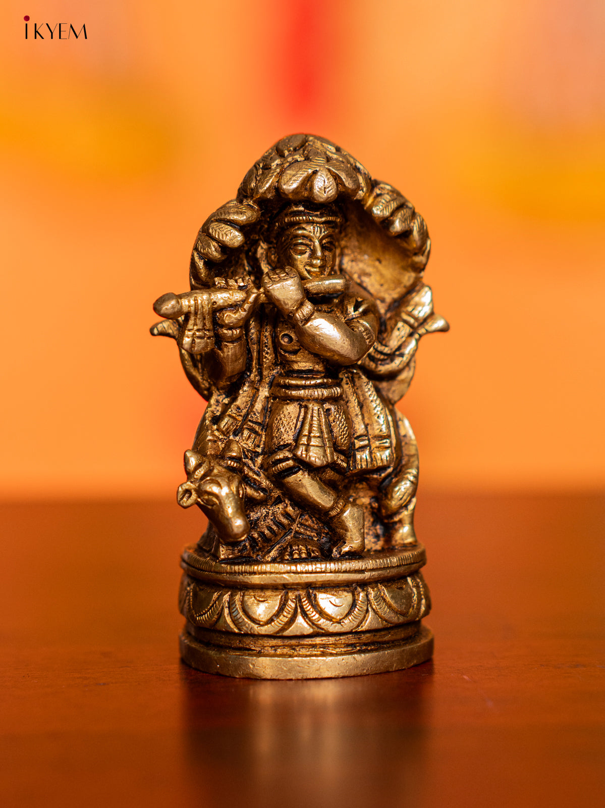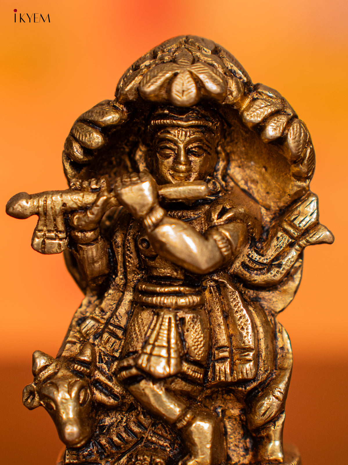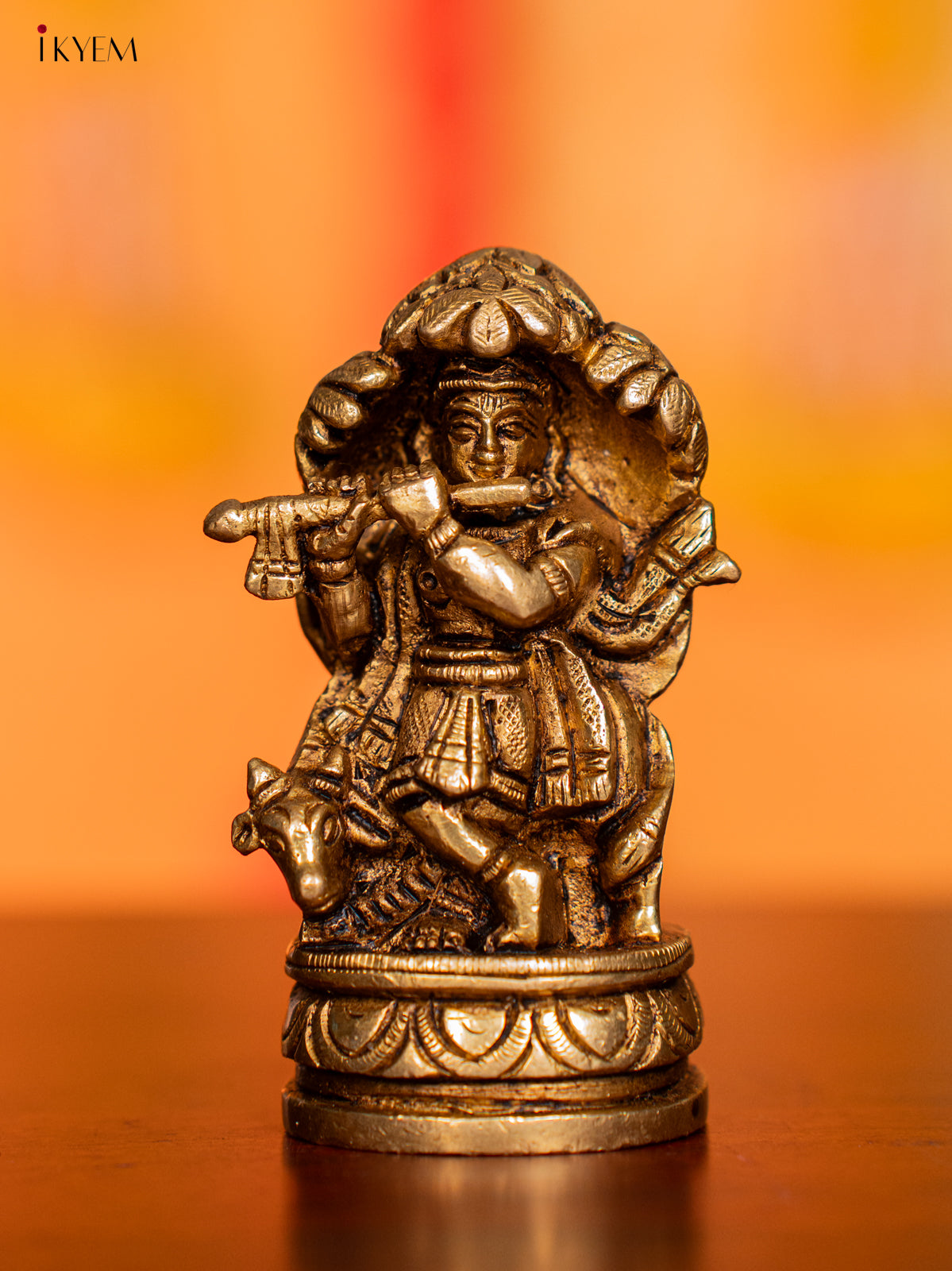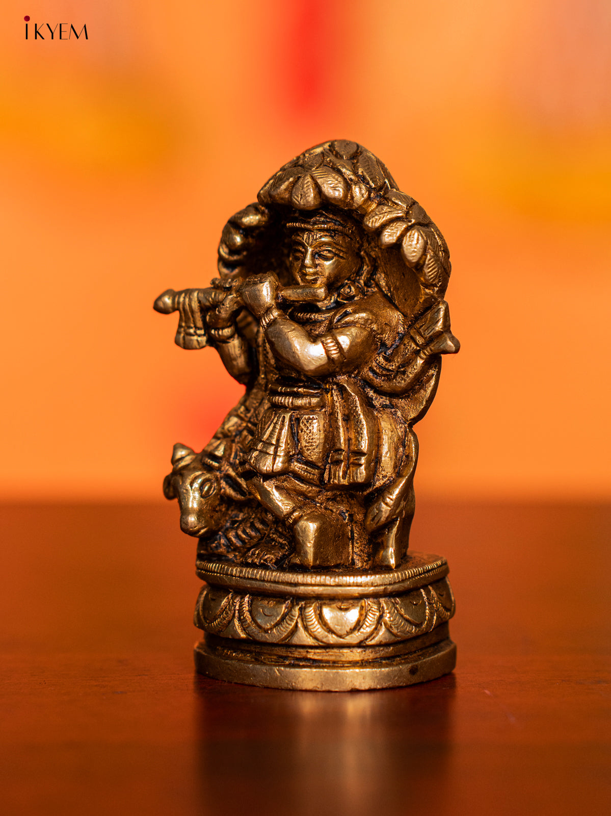 - This finely crafted Brass Krishna with Cow and Kalpavriksha idol serves as a sophisticated decorative piece and a meaningful gift.