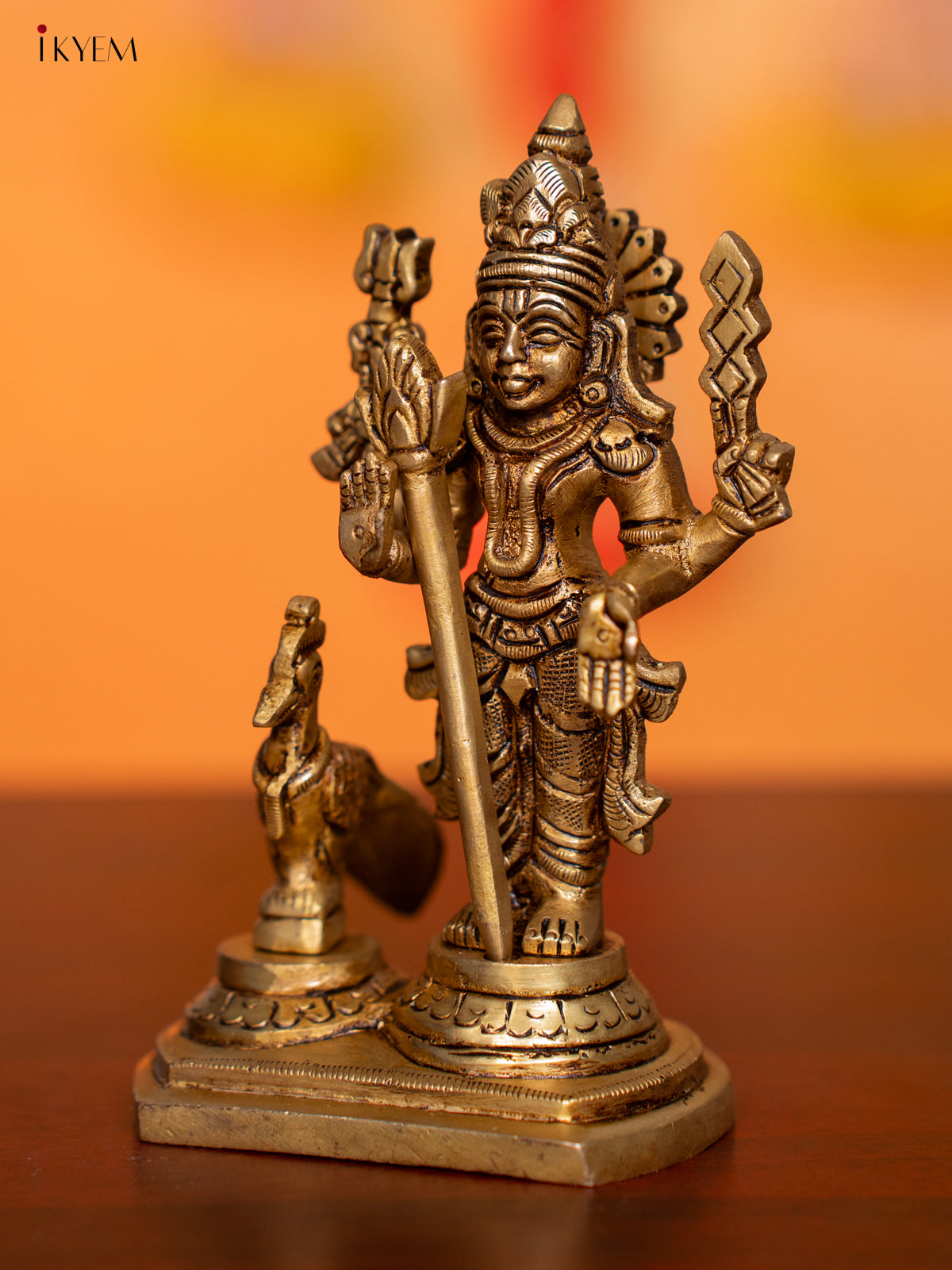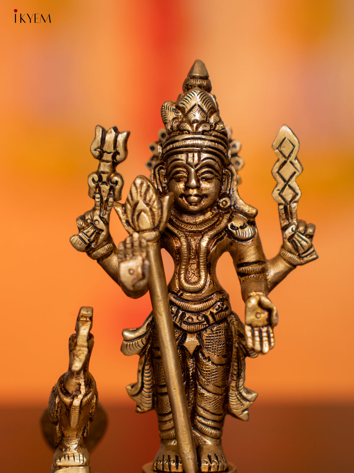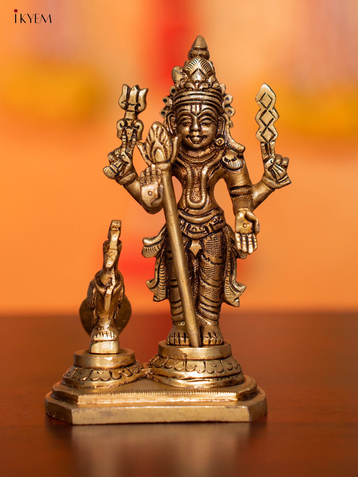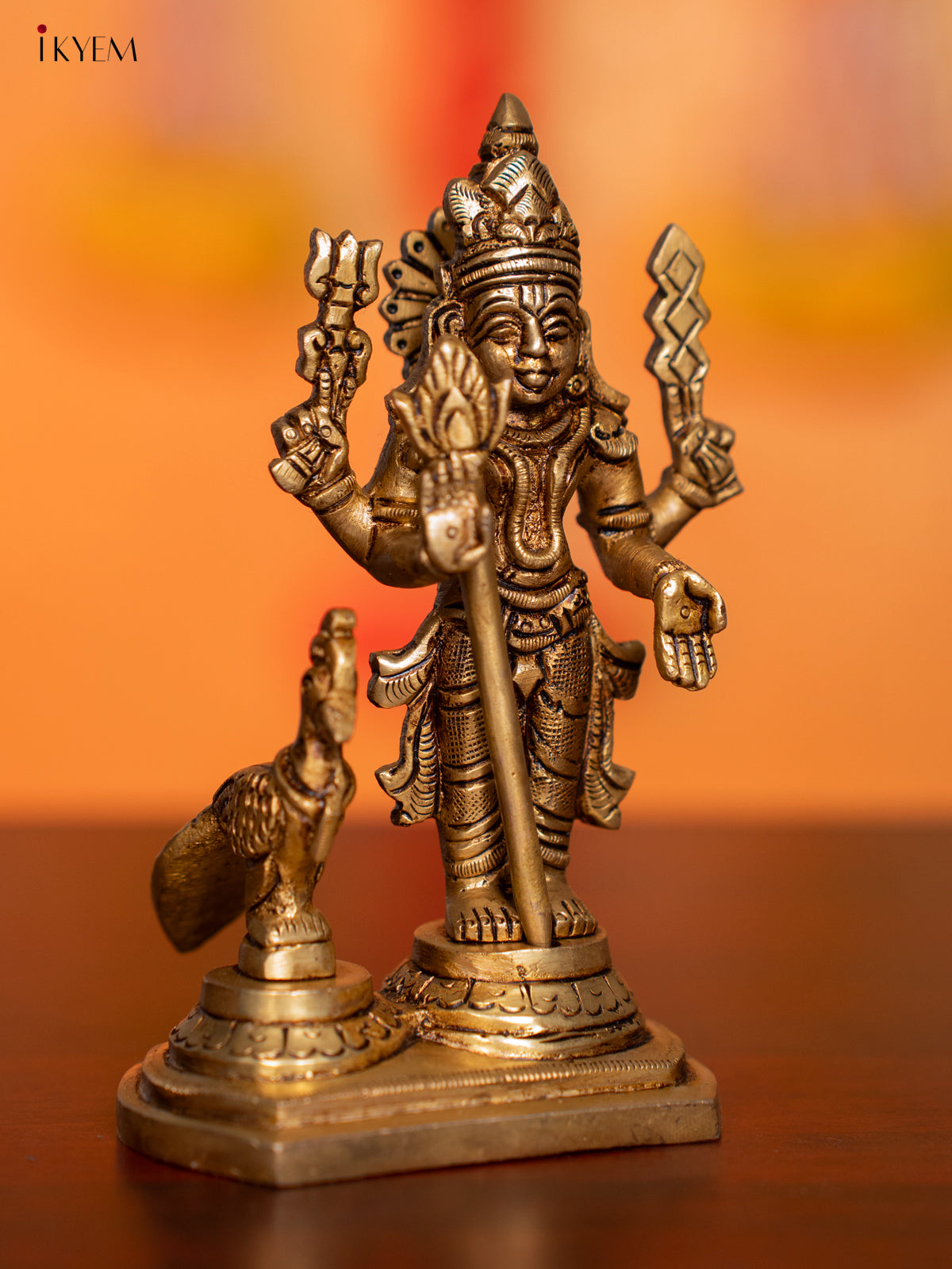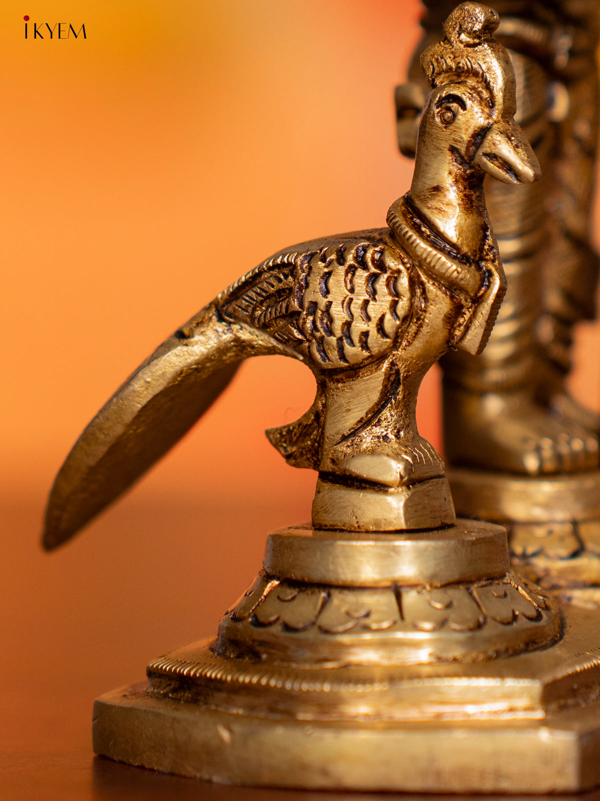 - Made from durable brass, it presents a detailed and elegant depiction of Lord Murugan alongside his traditional vehicle, the peacock.