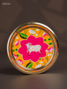 Discover the charming Cow Digital Printed Brass Plate in Yellow Pink – a compact brass decor piece measuring 6″ (L) × 6″ (W) × 0.5″ (H), weighing 45 g. Ideal for gifting or home display. Vibrant print with durable brass construction make it ideal for festive gifting or personal decor.