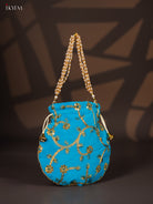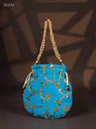 - This Potli Bag showcases a beautifully embroidered floral pattern with gold zari accents on a bright blue fabric.