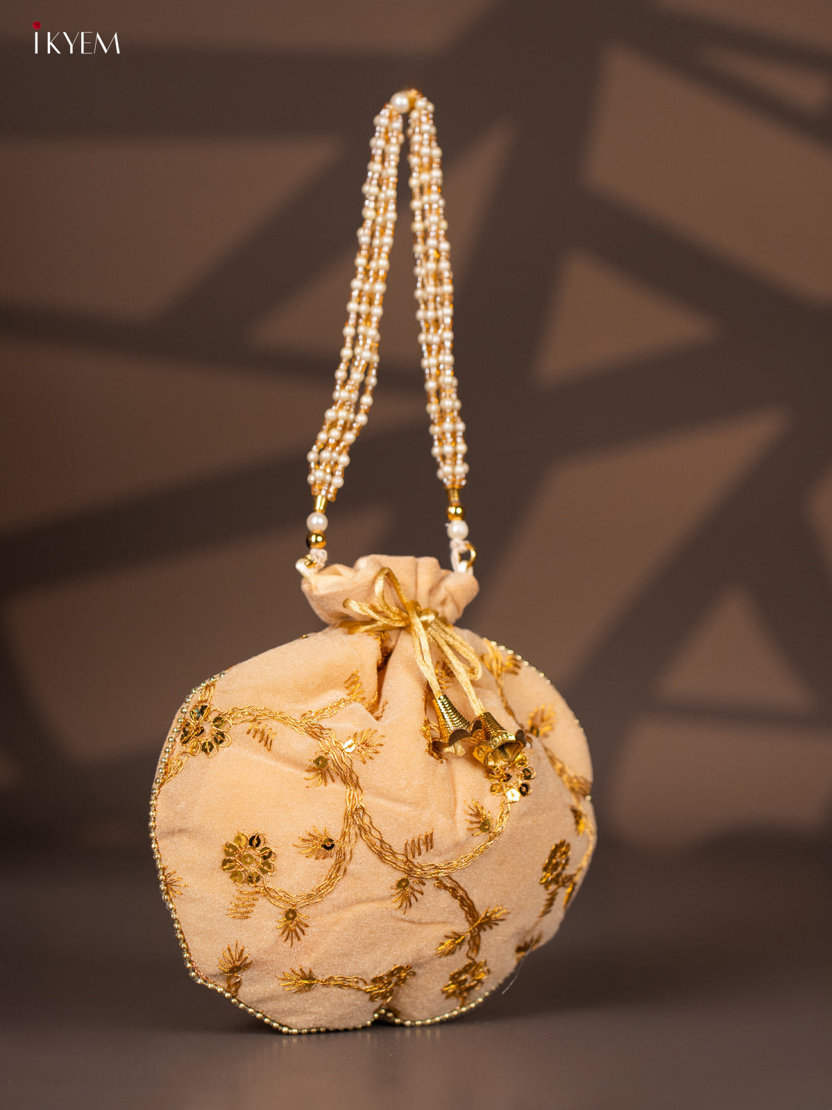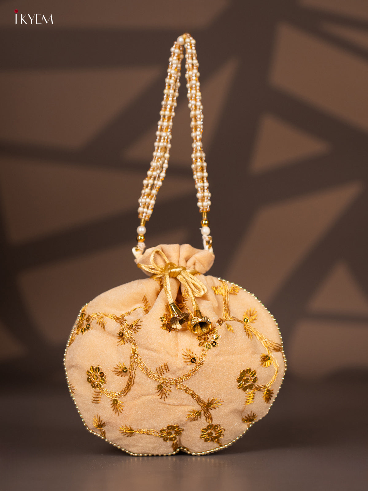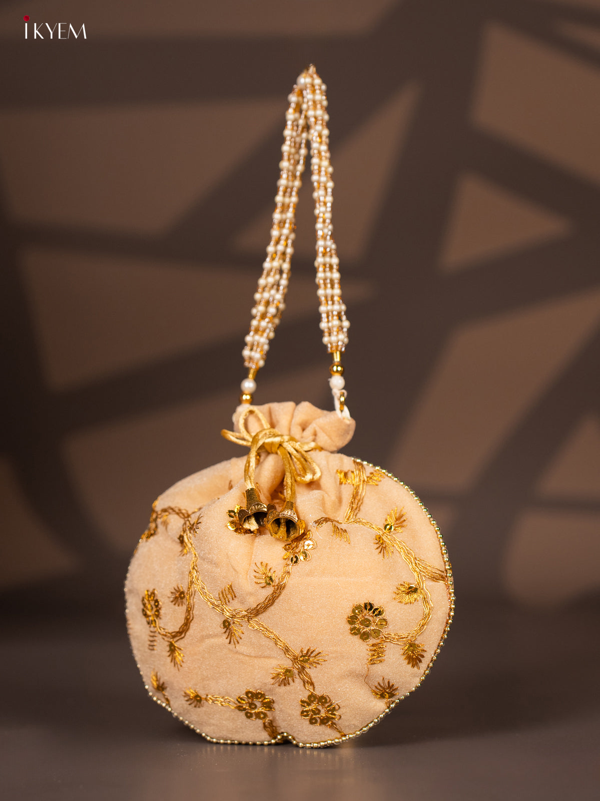 - This Sandal Gold Zari Potli Bag exemplifies technical mastery through its precisely rendered floral embroidery.