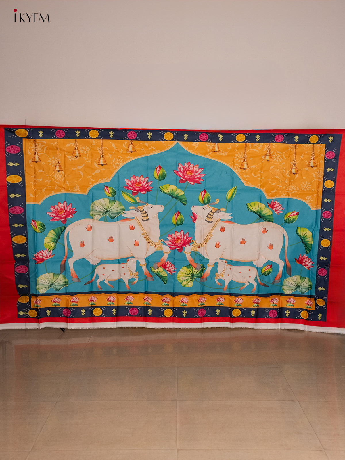 - This 5×8 feet Pichwai backdrop features a traditional cow and calf design in blue and yellow, ideal for pooja ceremonies, celebrations, and decorative purposes.