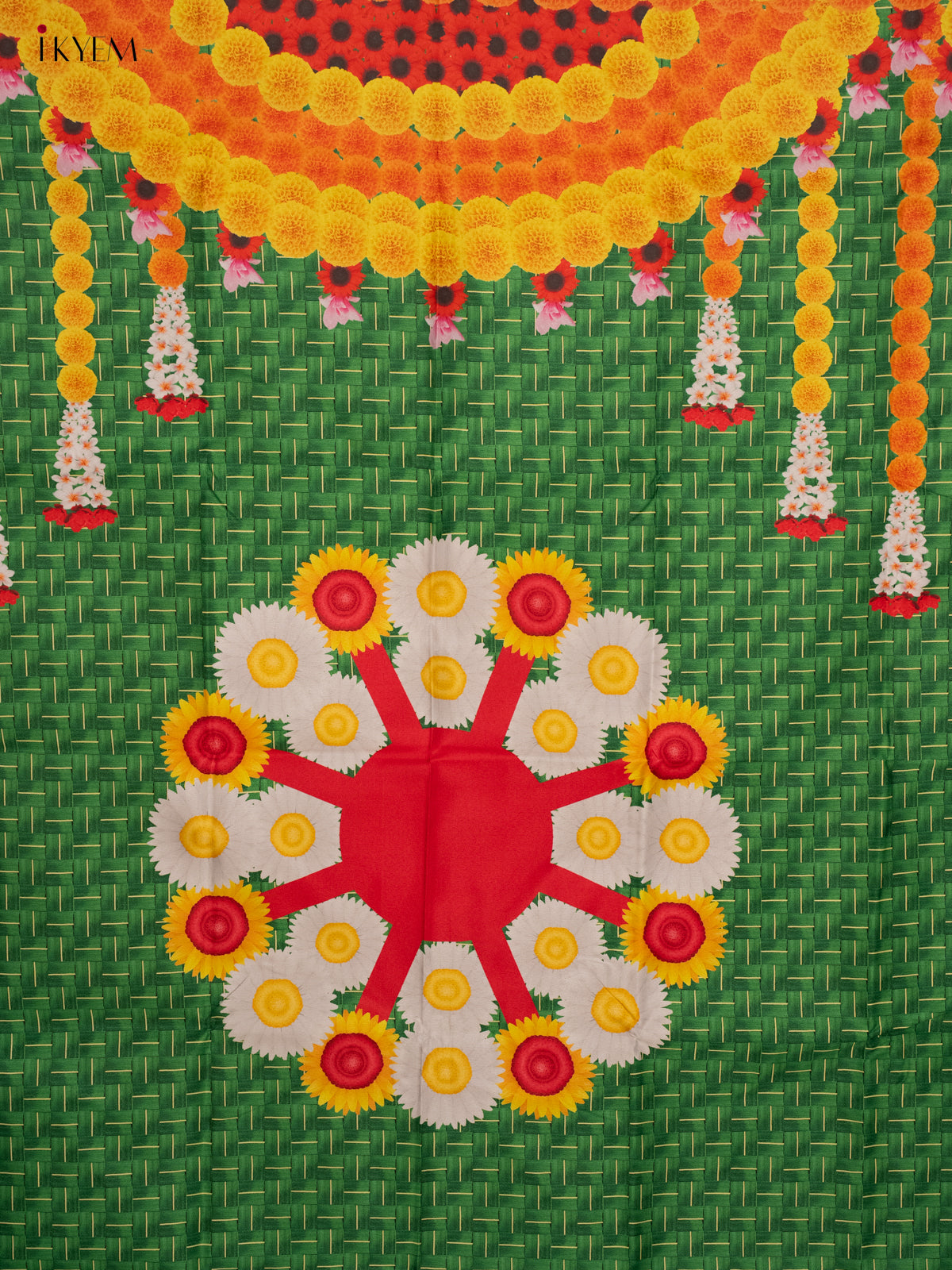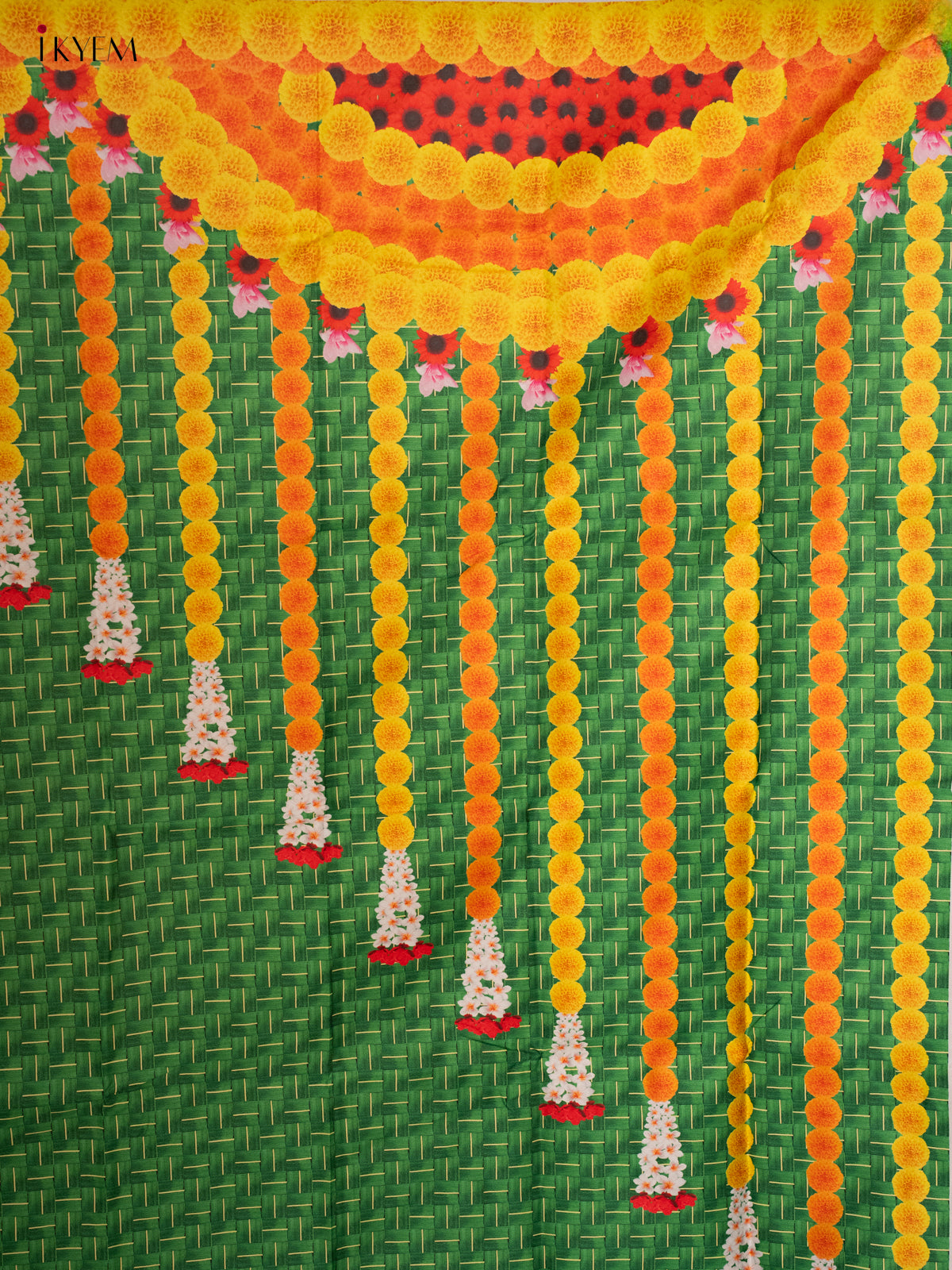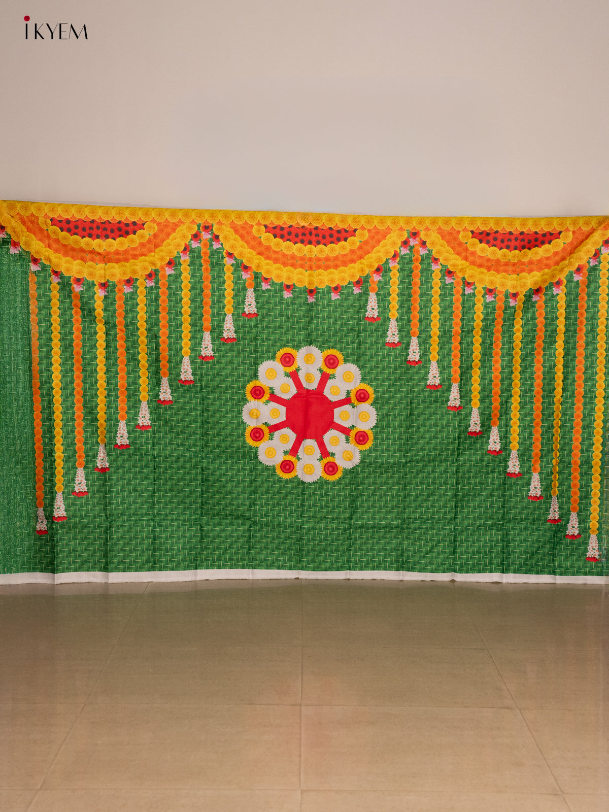 - Enhance your pooja and celebration spaces with this elegant Rangoli Backdrop featuring a vibrant green base accented by striking red floral designs.
