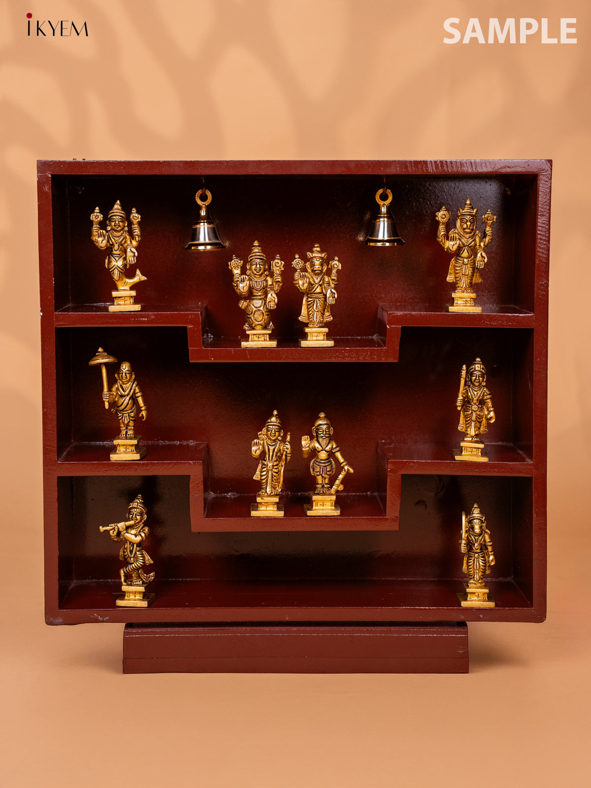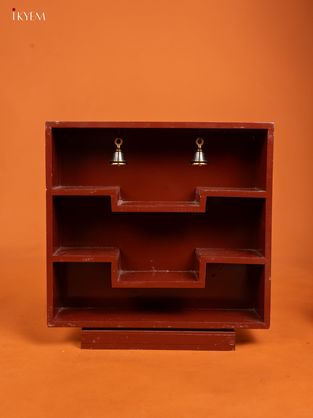 - Elegant square-shaped wooden shelf in rich maroon finish with provision for hanging bells and placing miniature idols.