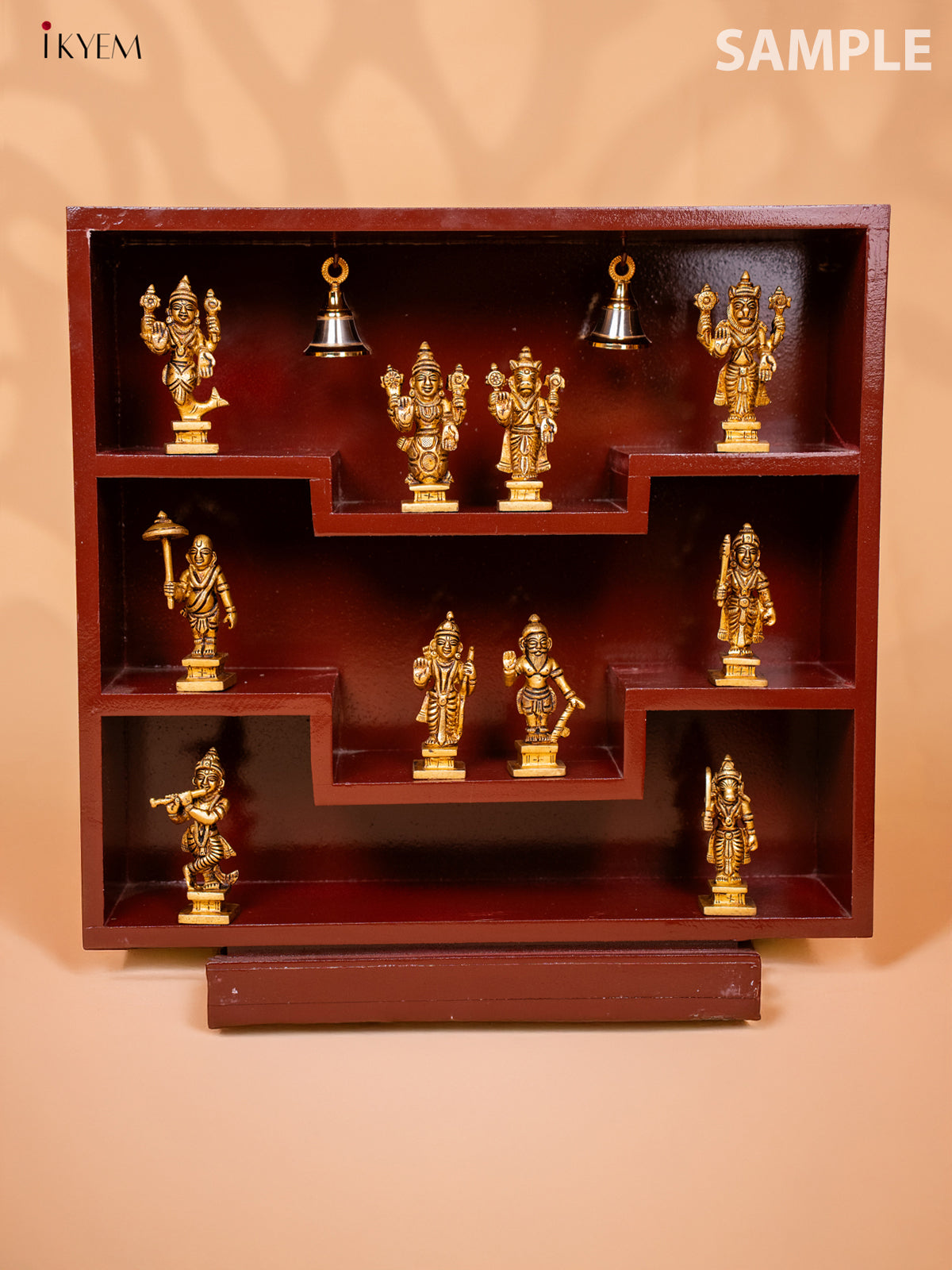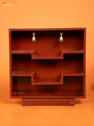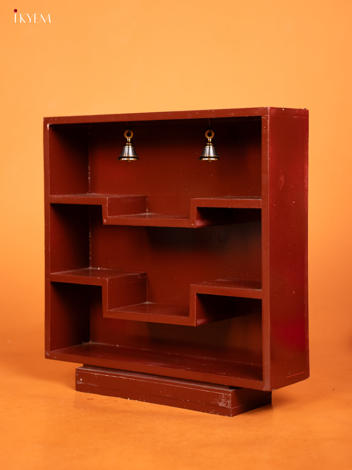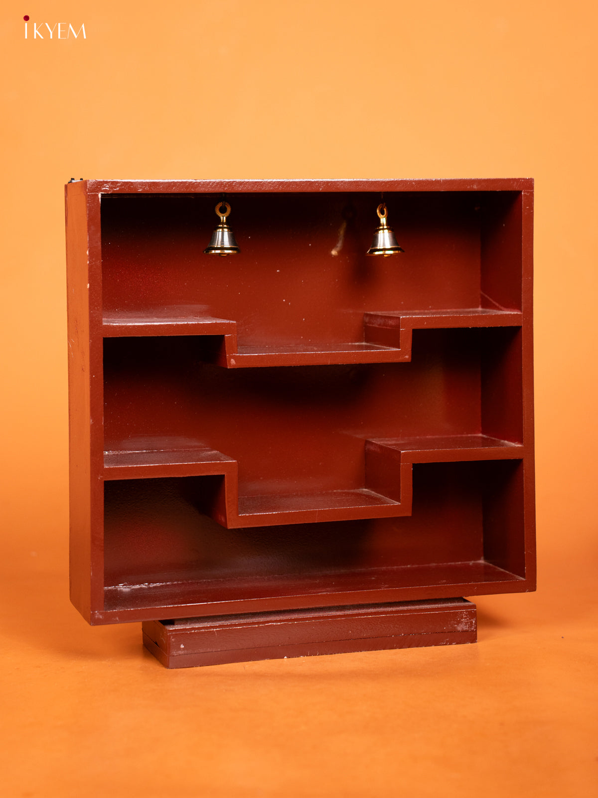 - Elegant square-shaped wooden shelf in rich brown finish with provision for hanging bells and placing miniature idols.