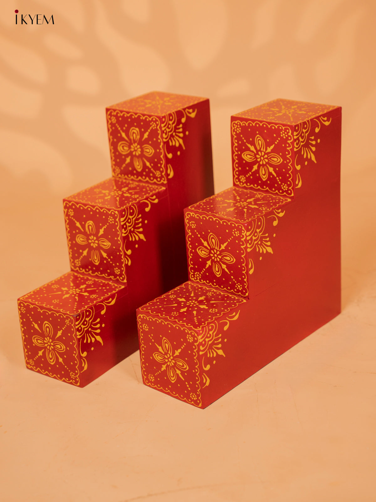 WOODEN HANDPAINTED 3-STEP DIYA PADI (set of 2) - RED - KD18173