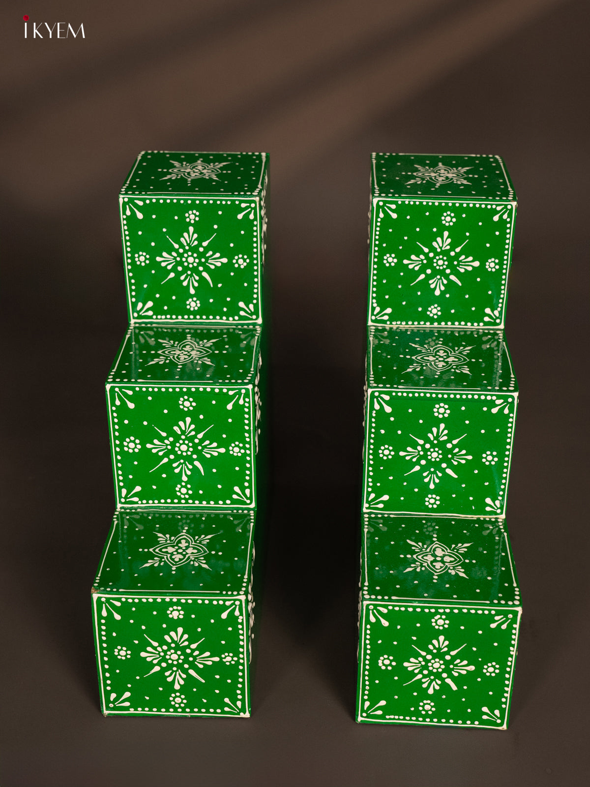 • This set includes two wooden hand-painted 3-step Diya Padis, each measuring 12 inches and featuring an elegant green flower design.