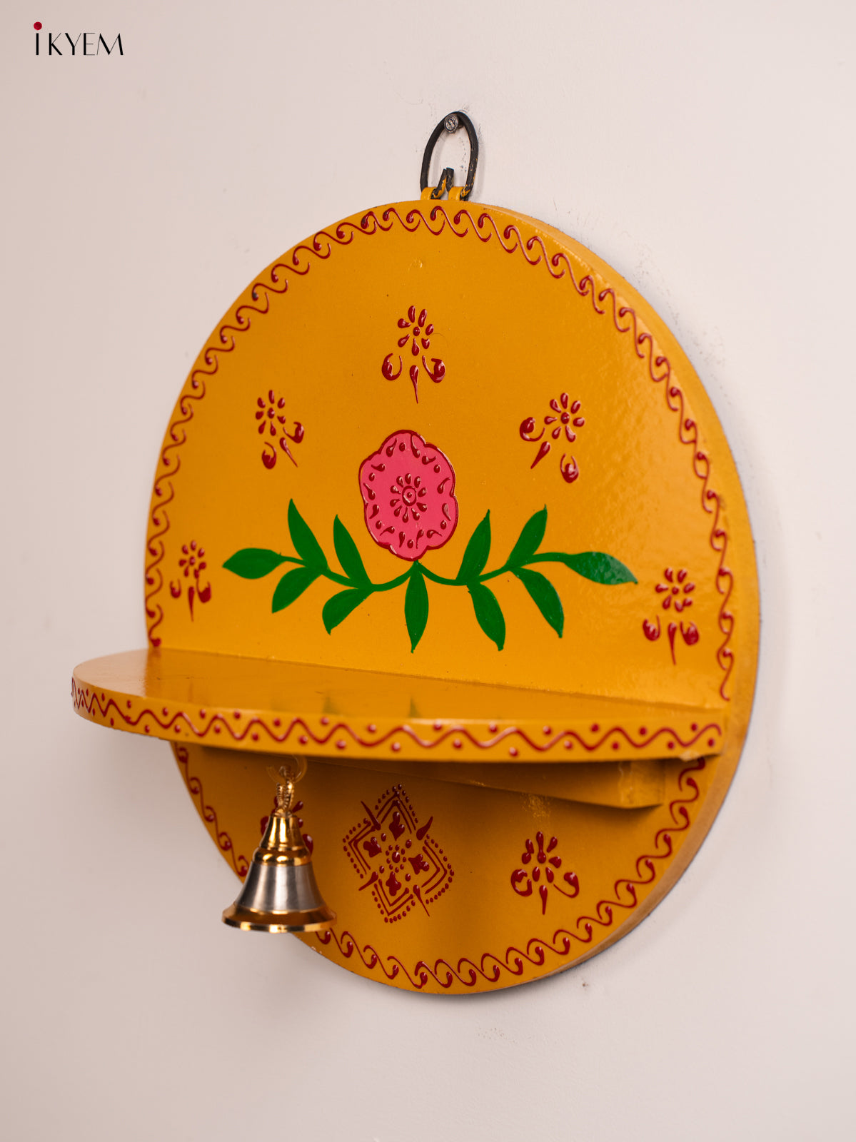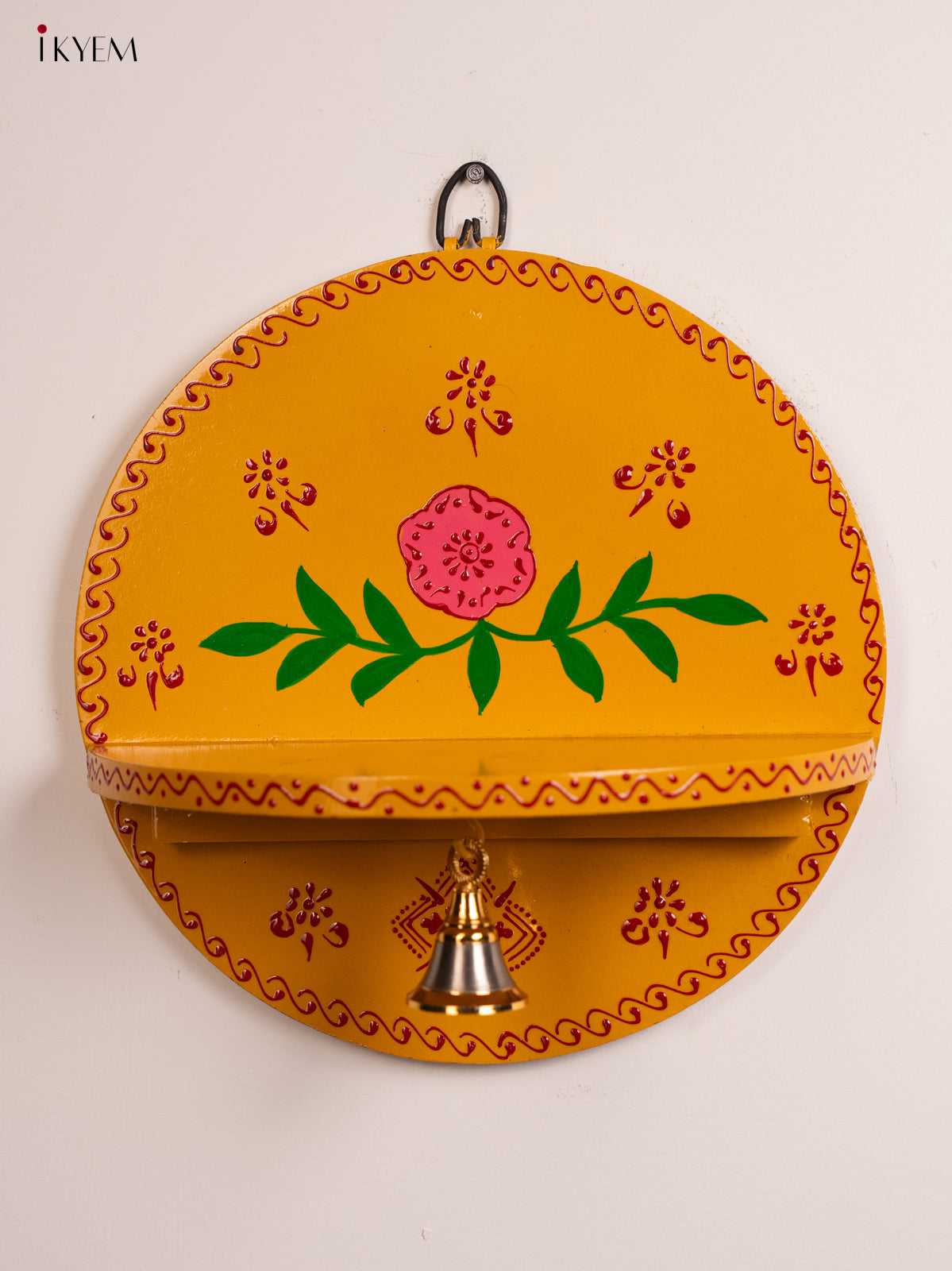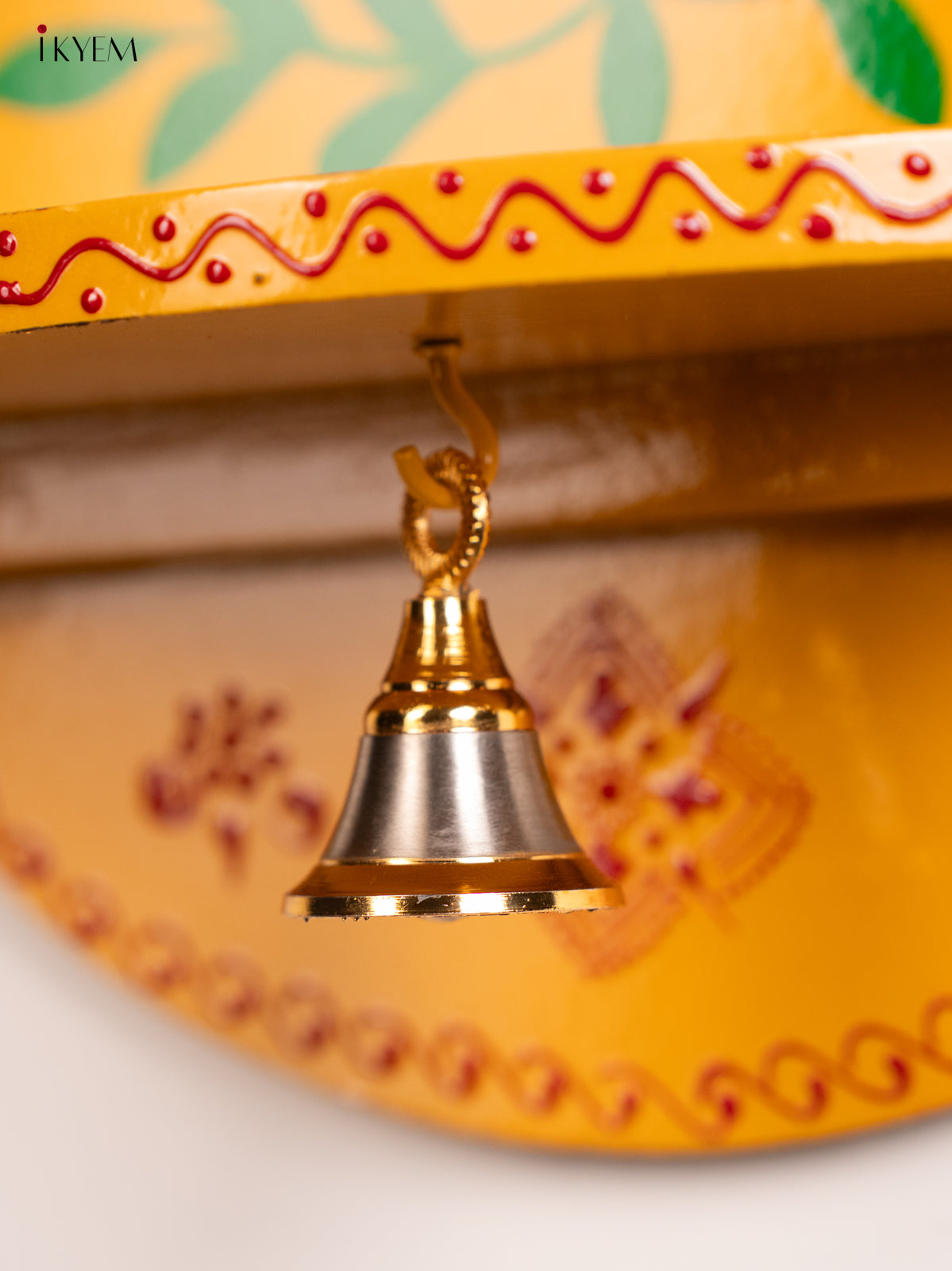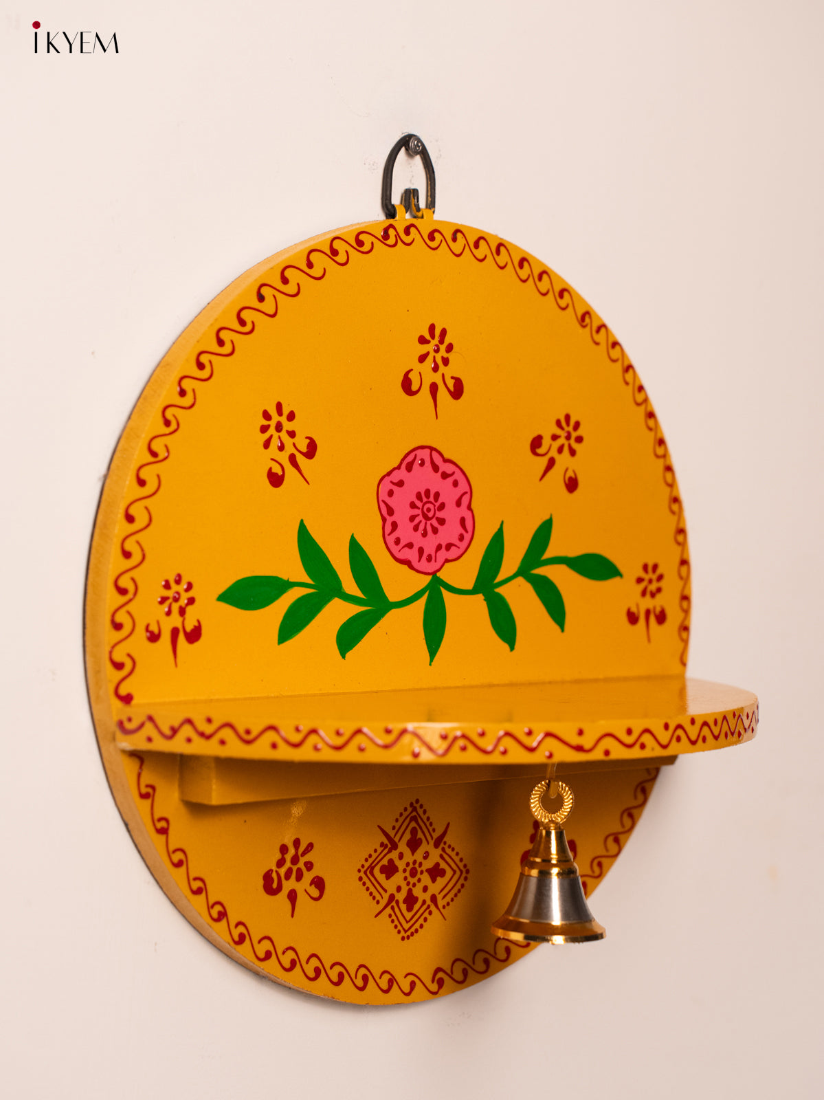 Wooden Hand Painted Pooja Wall Self/Jharokha with Bell - Yellow - KH12120