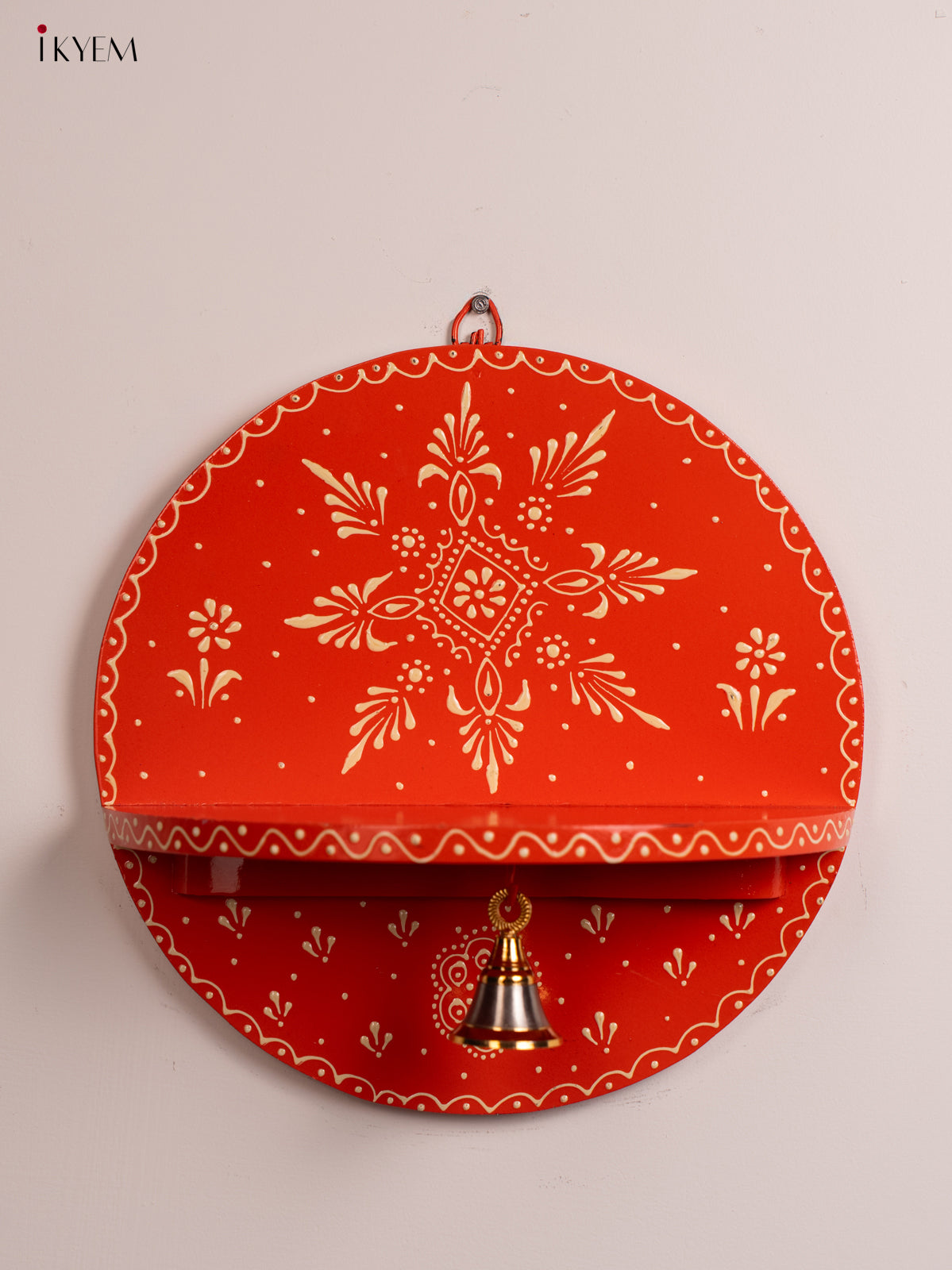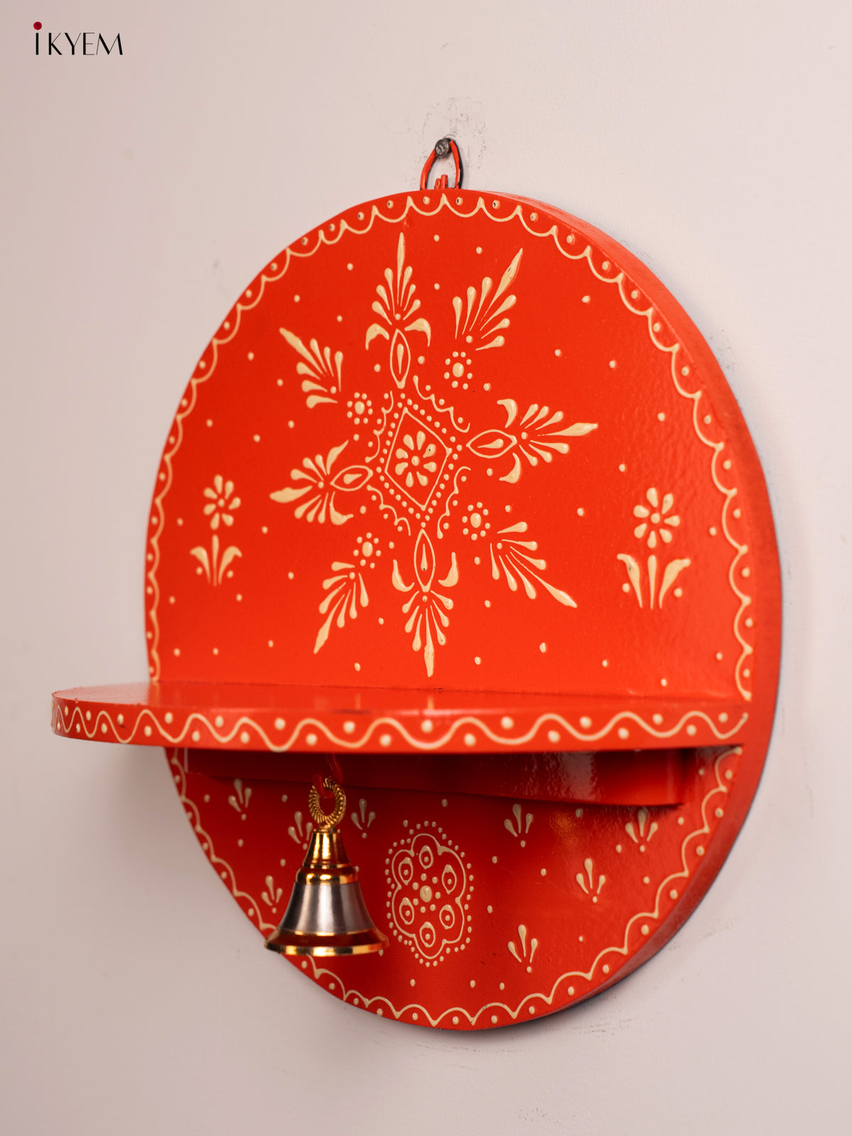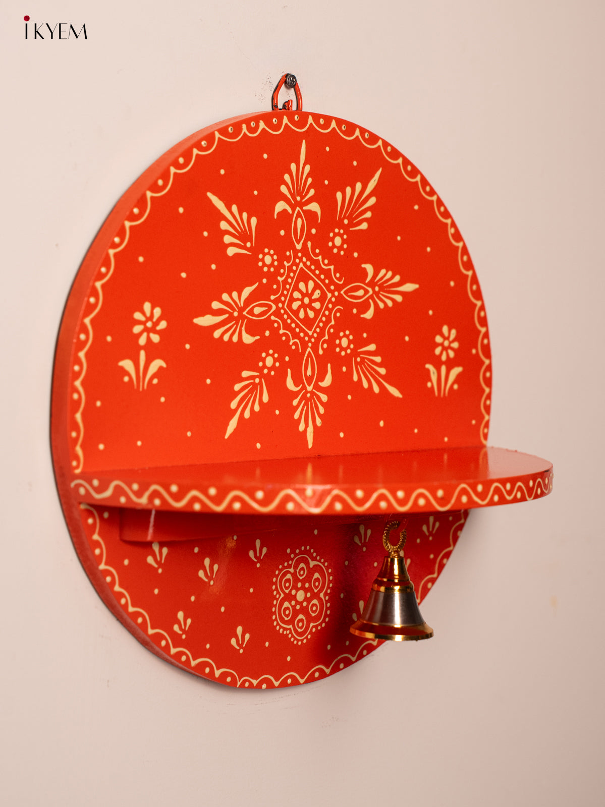 Wooden Hand Painted Pooja Wall Self/Jharokha with Bell - Orange - KH12121