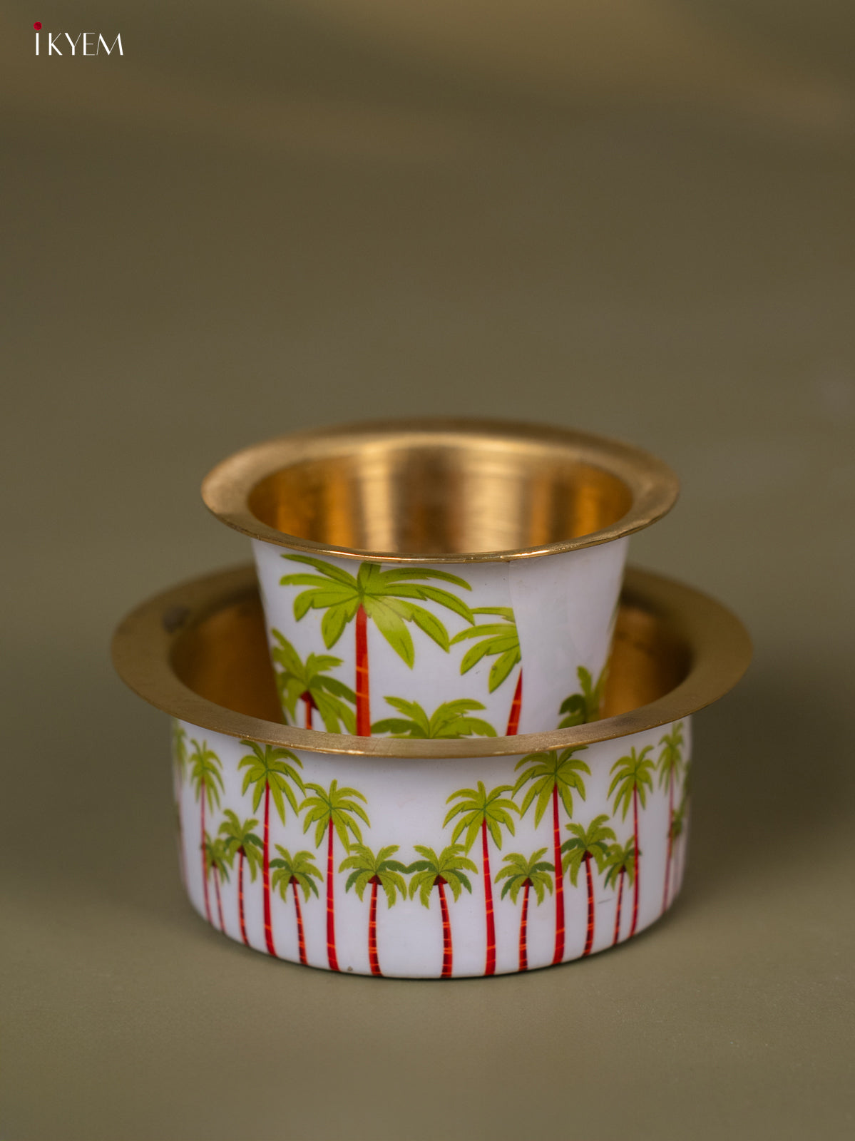 - The Coconut Tree Digital Printed Brass Coffee Dabara Set in white features a stylish and unique design, perfect for coffee enthusiasts.