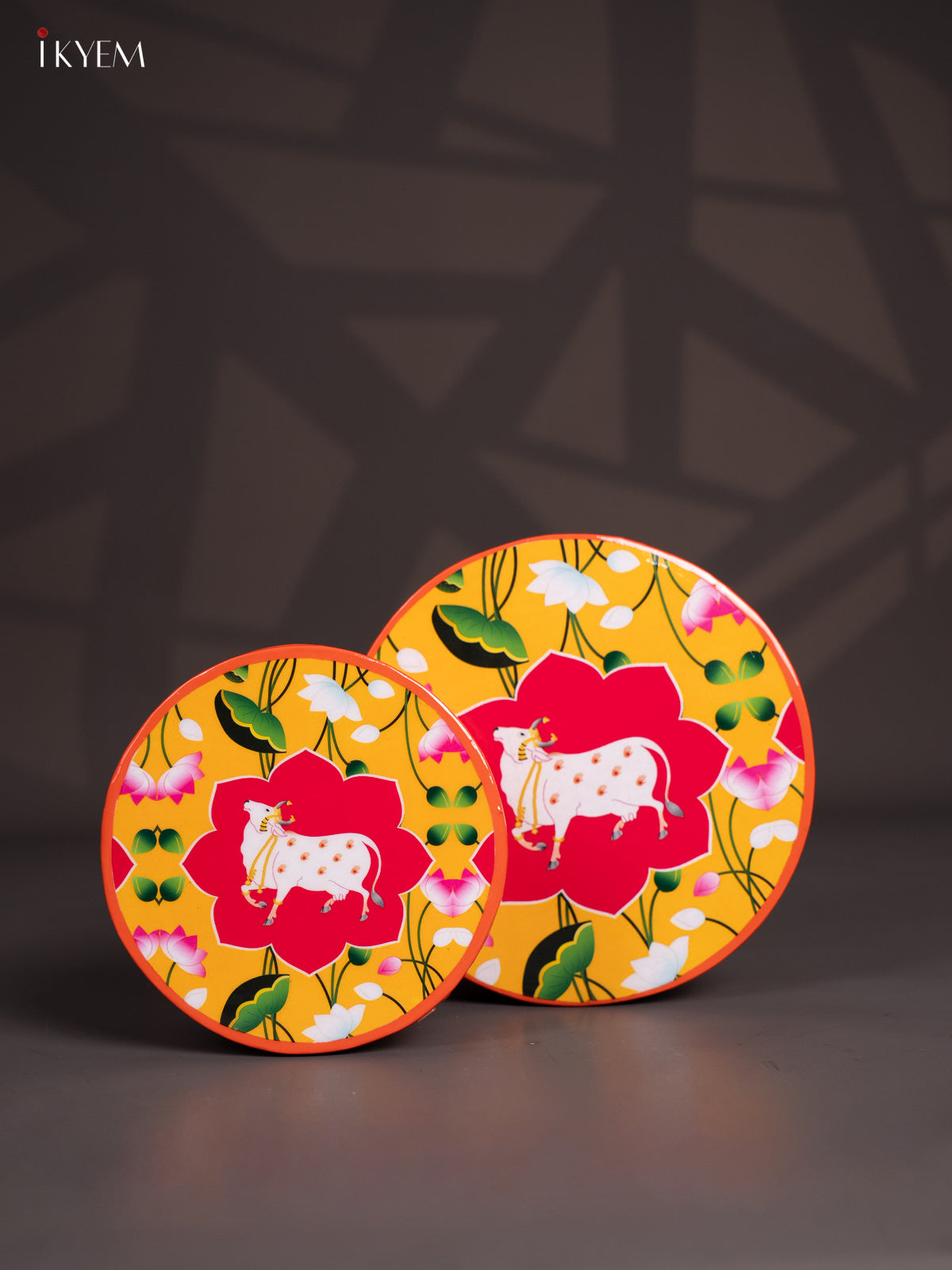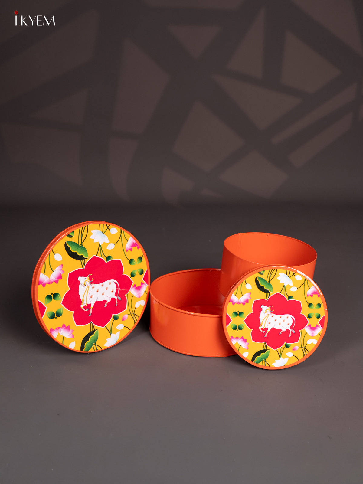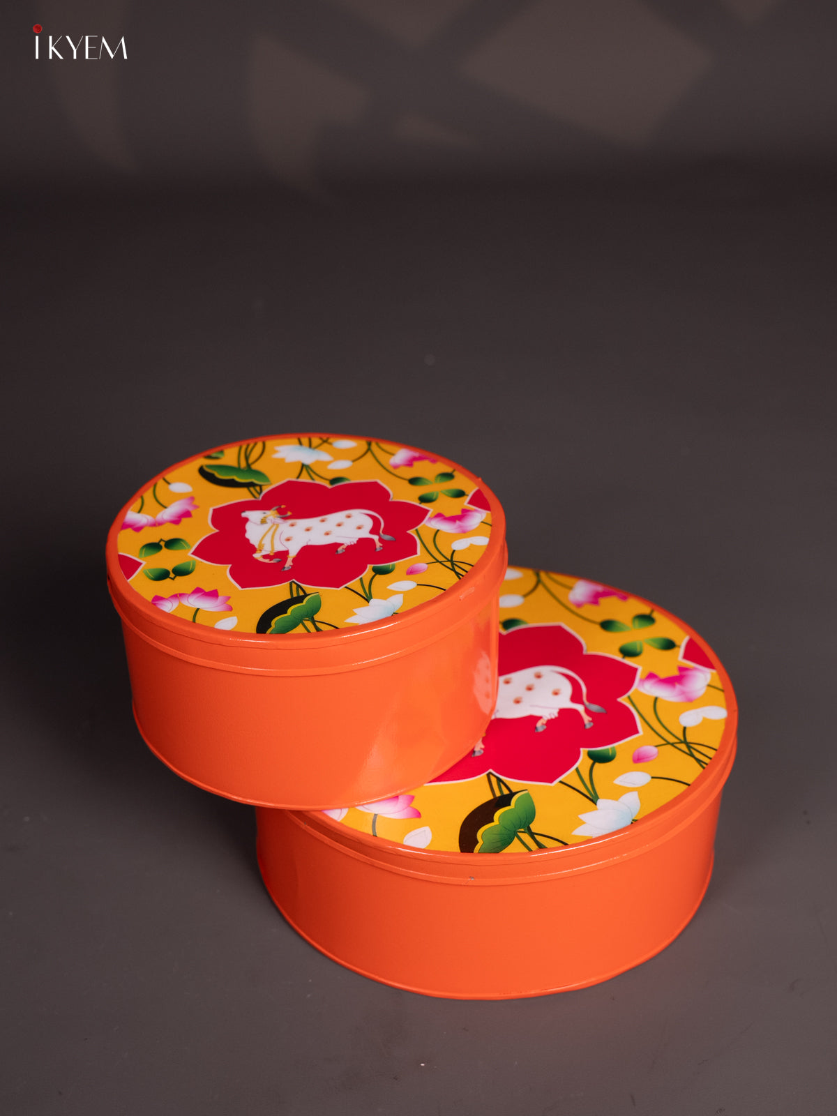 Metal Cow Printed Storage Box - set of 2 - Orange with yellow - (8x8) Inches - KI15141