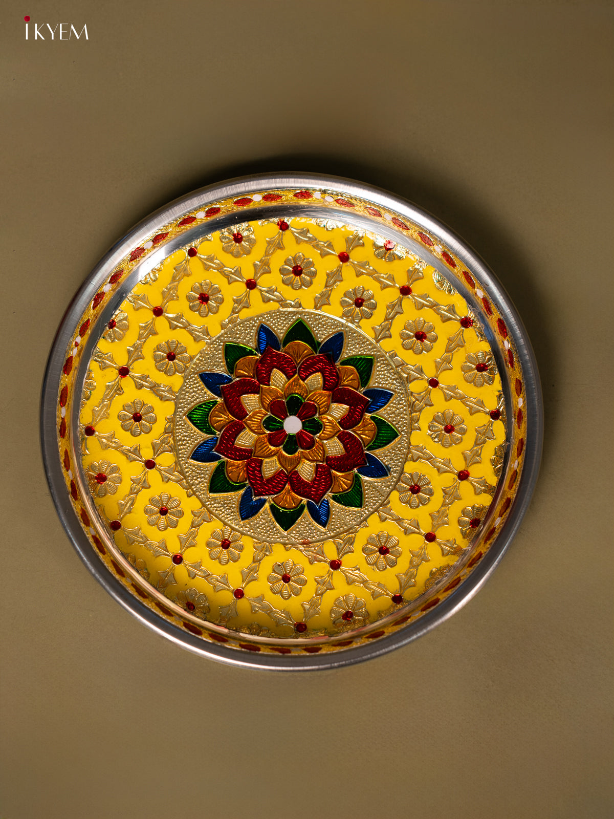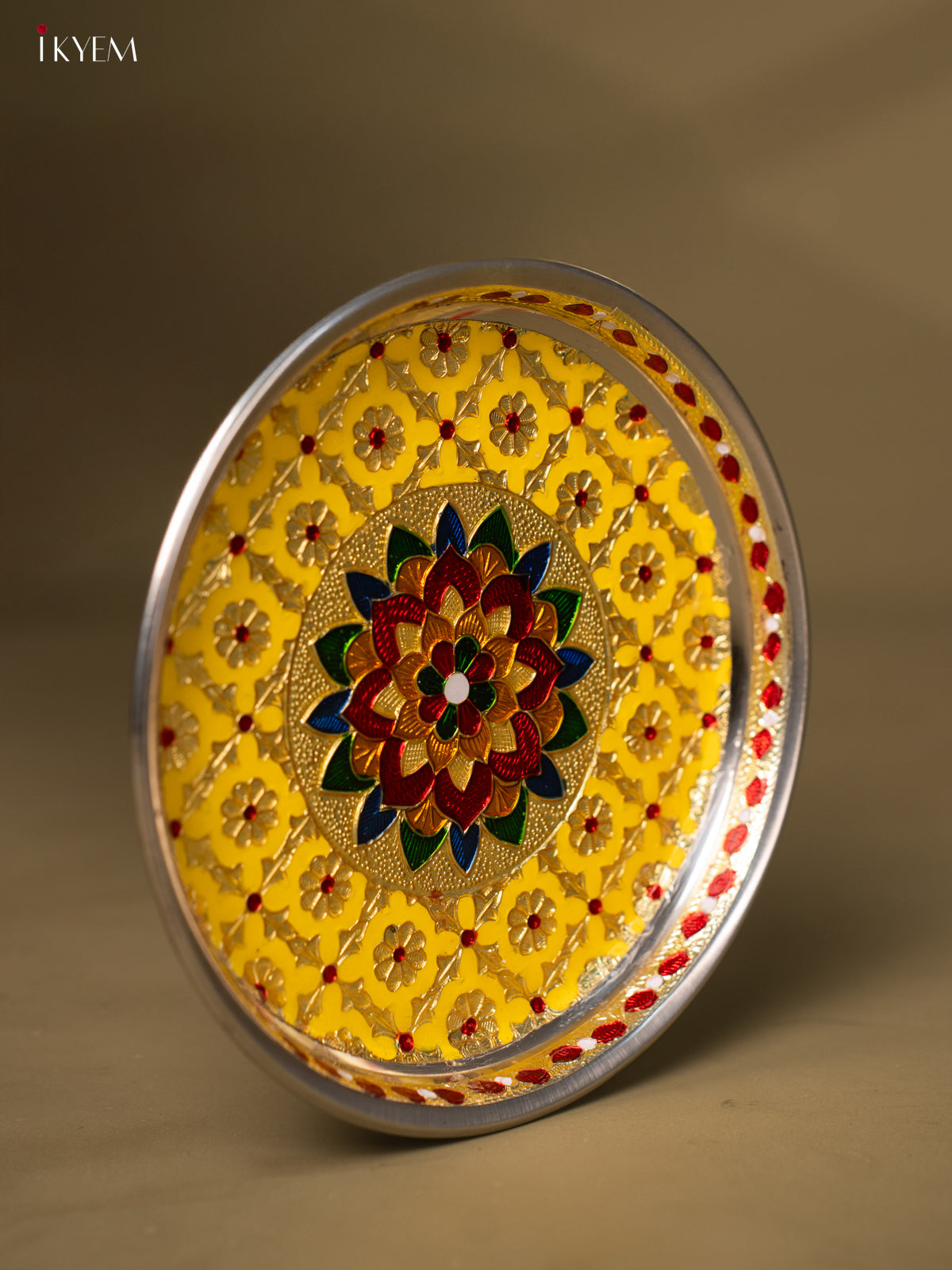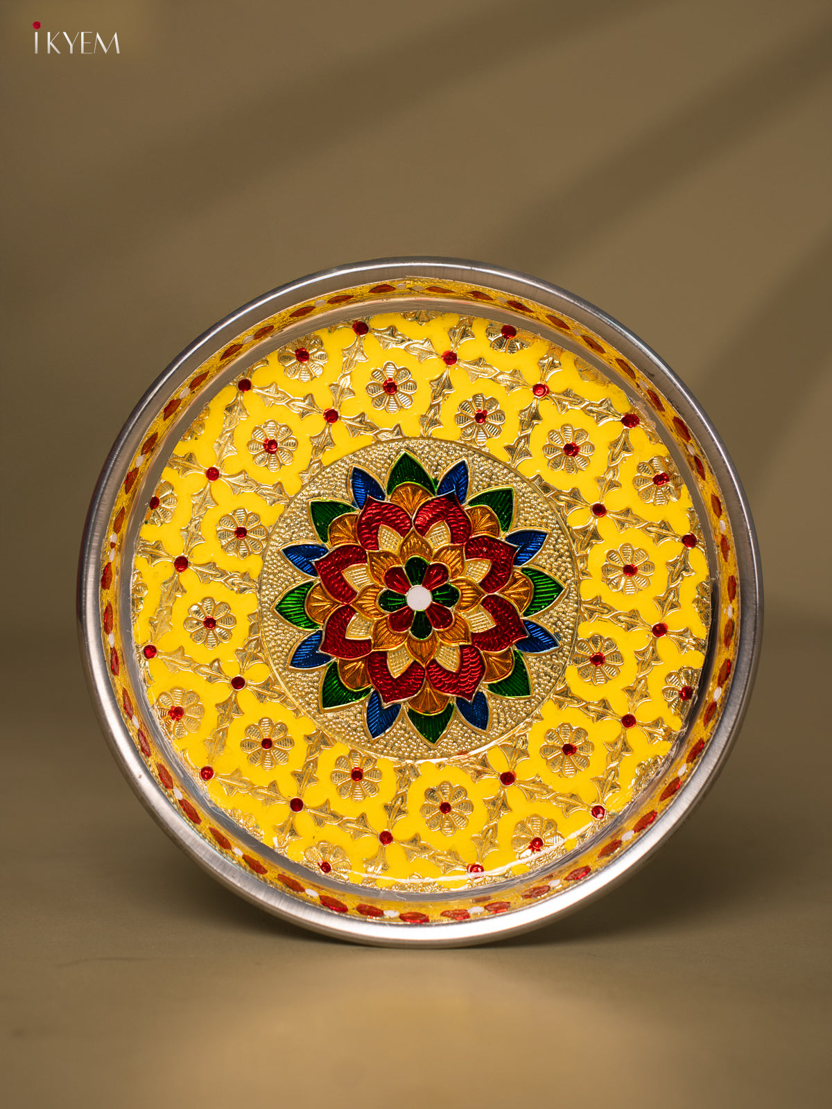 - The 7×7-inch round Meenakari plate in yellow is an elegant choice for traditional pooja ceremonies, home decoration, or as a meaningful return gift.