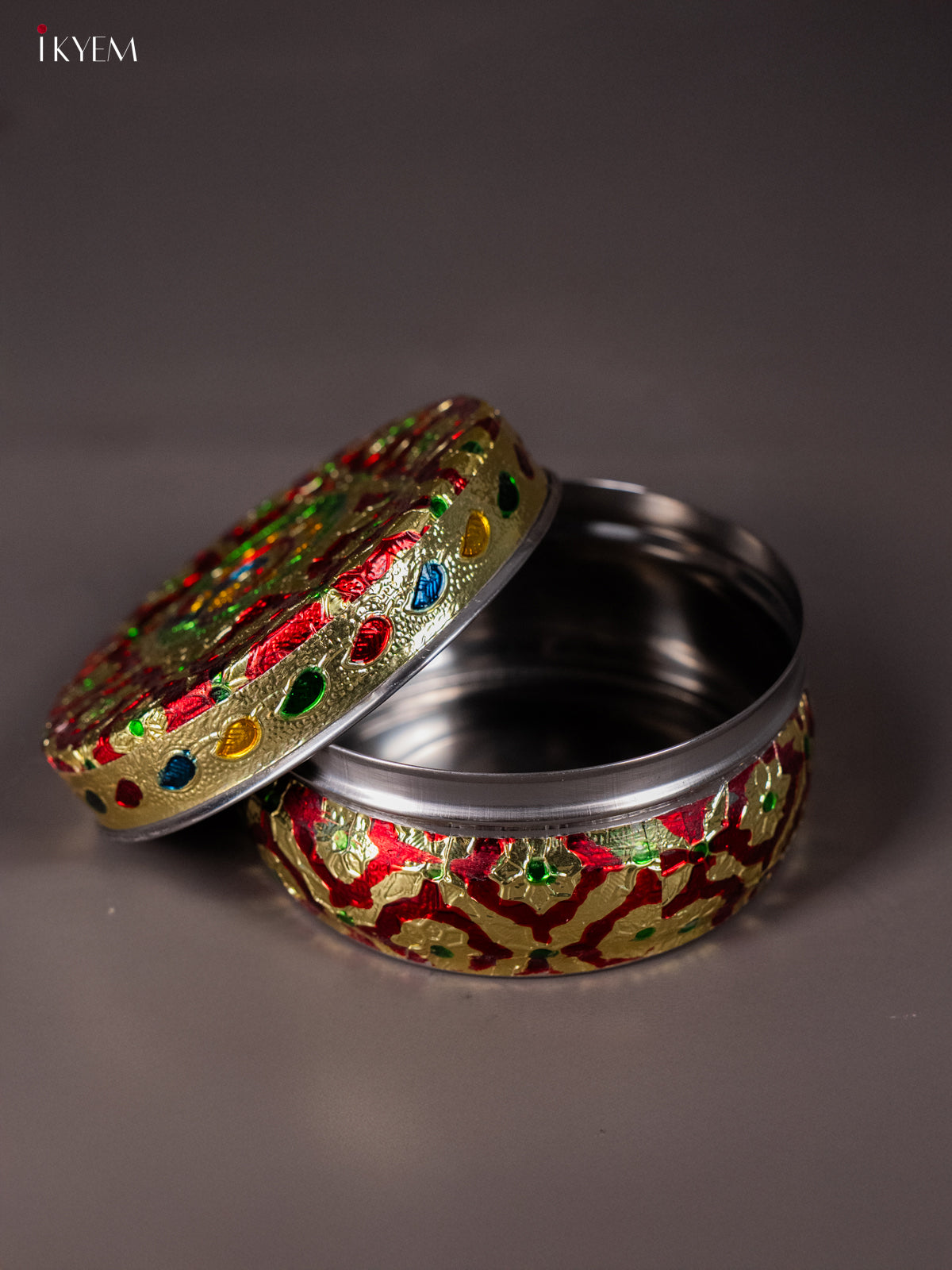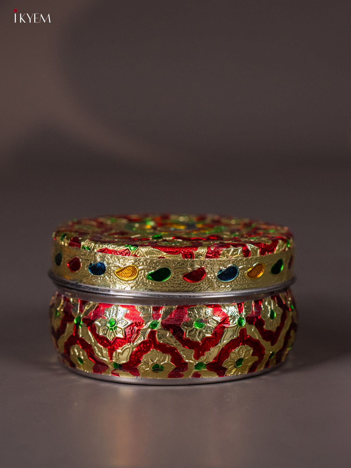 - This 4-inch Red Meenakari Storage Box features an intricate peacock design, combining traditional artistry with practical use.