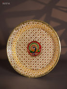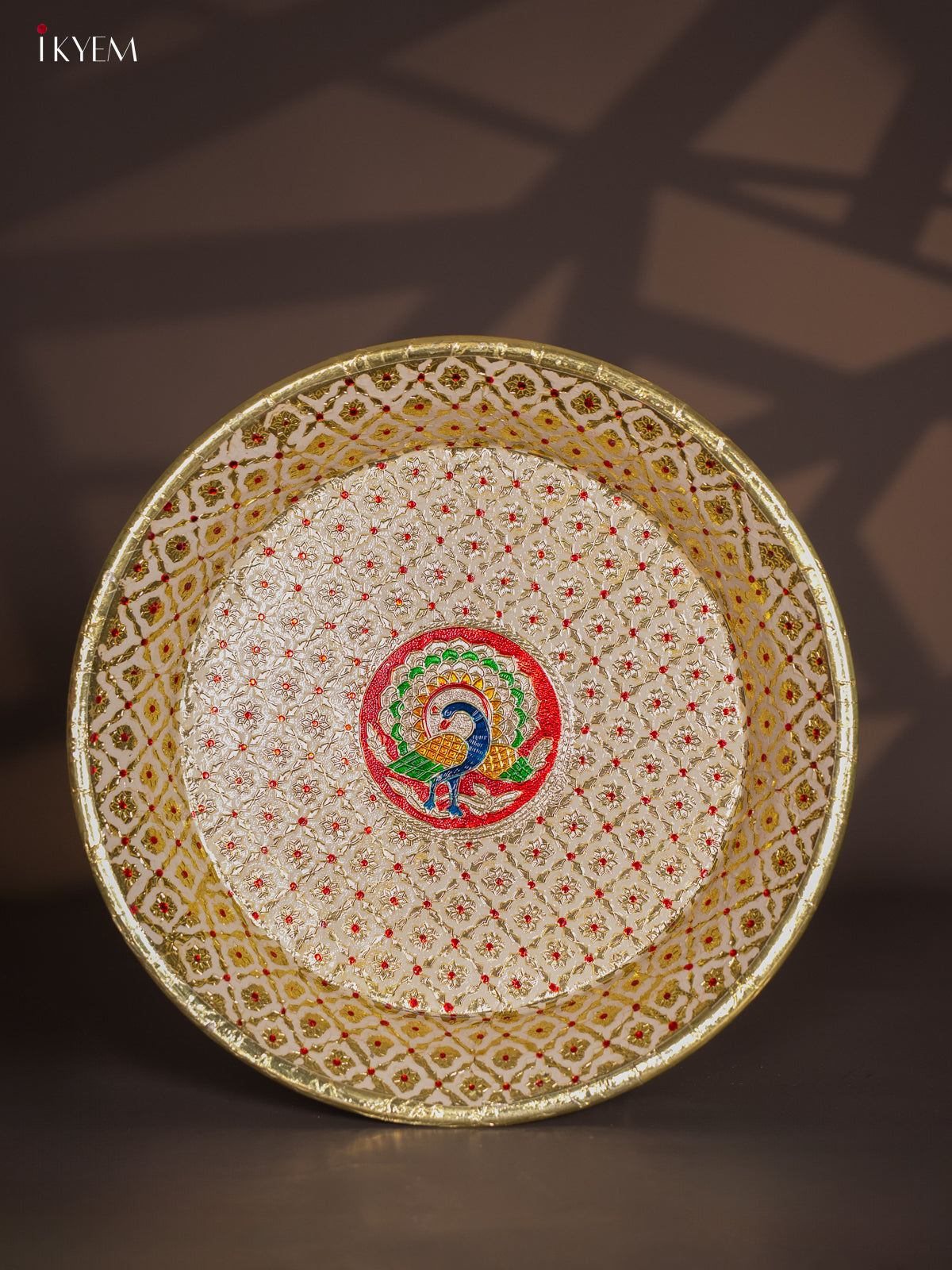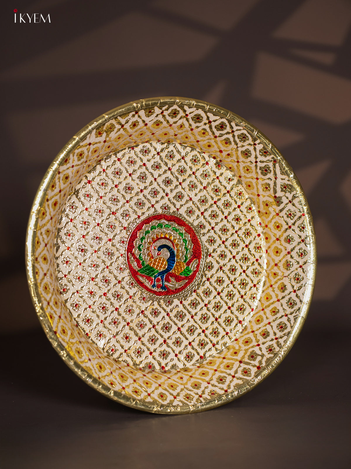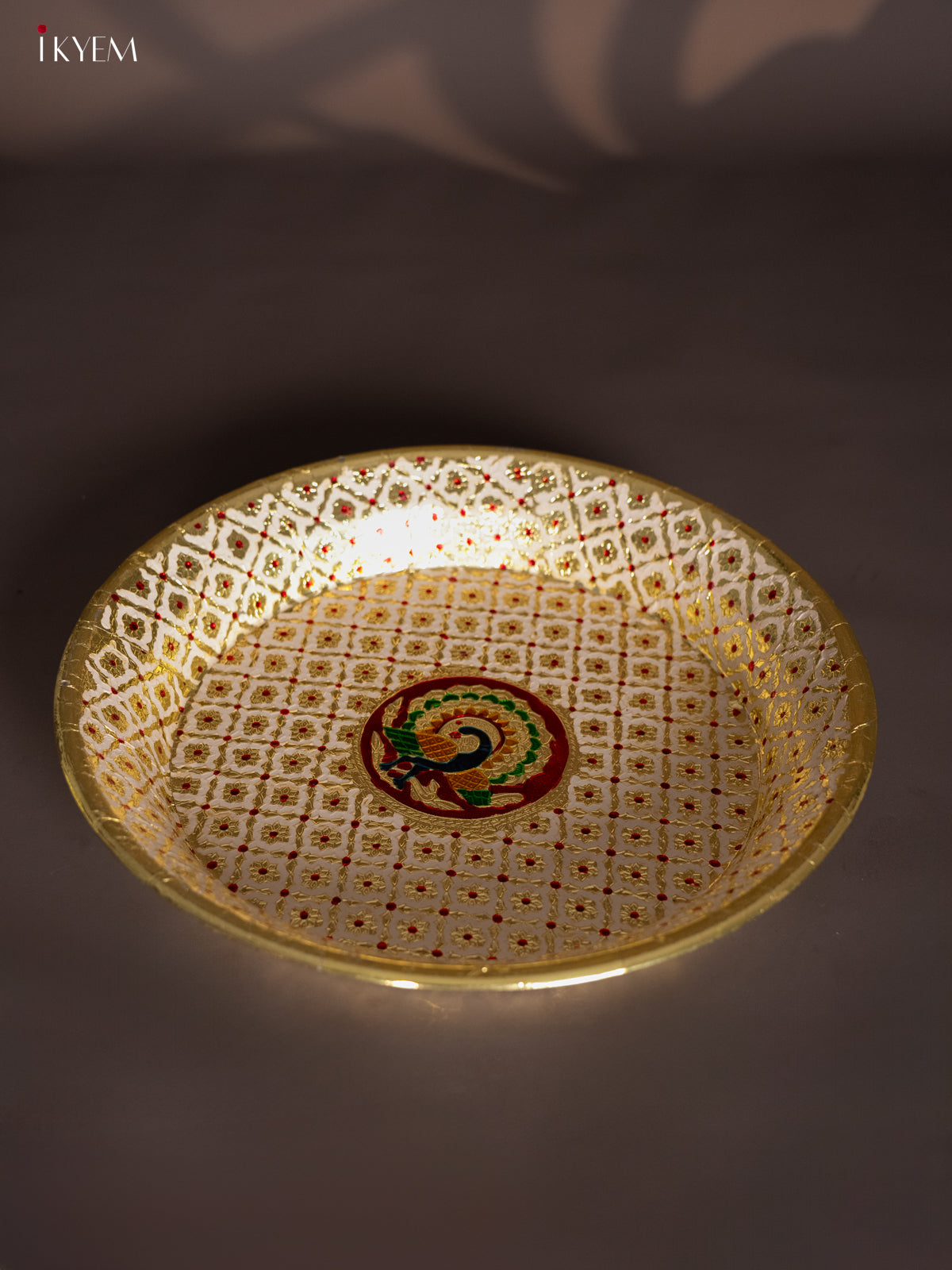- The Meenakari Round Plate, measuring 15.5x15.5 inches in white, is an ideal choice for traditional pooja ceremonies and thoughtful return gifts.