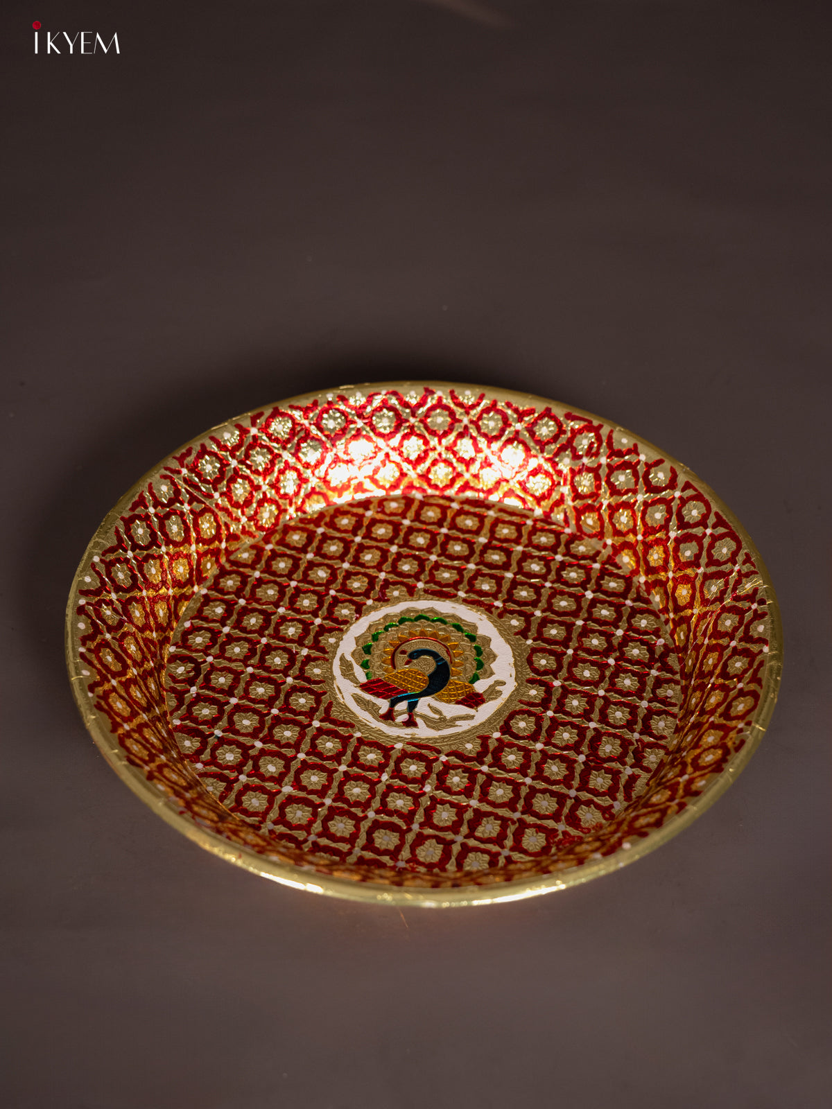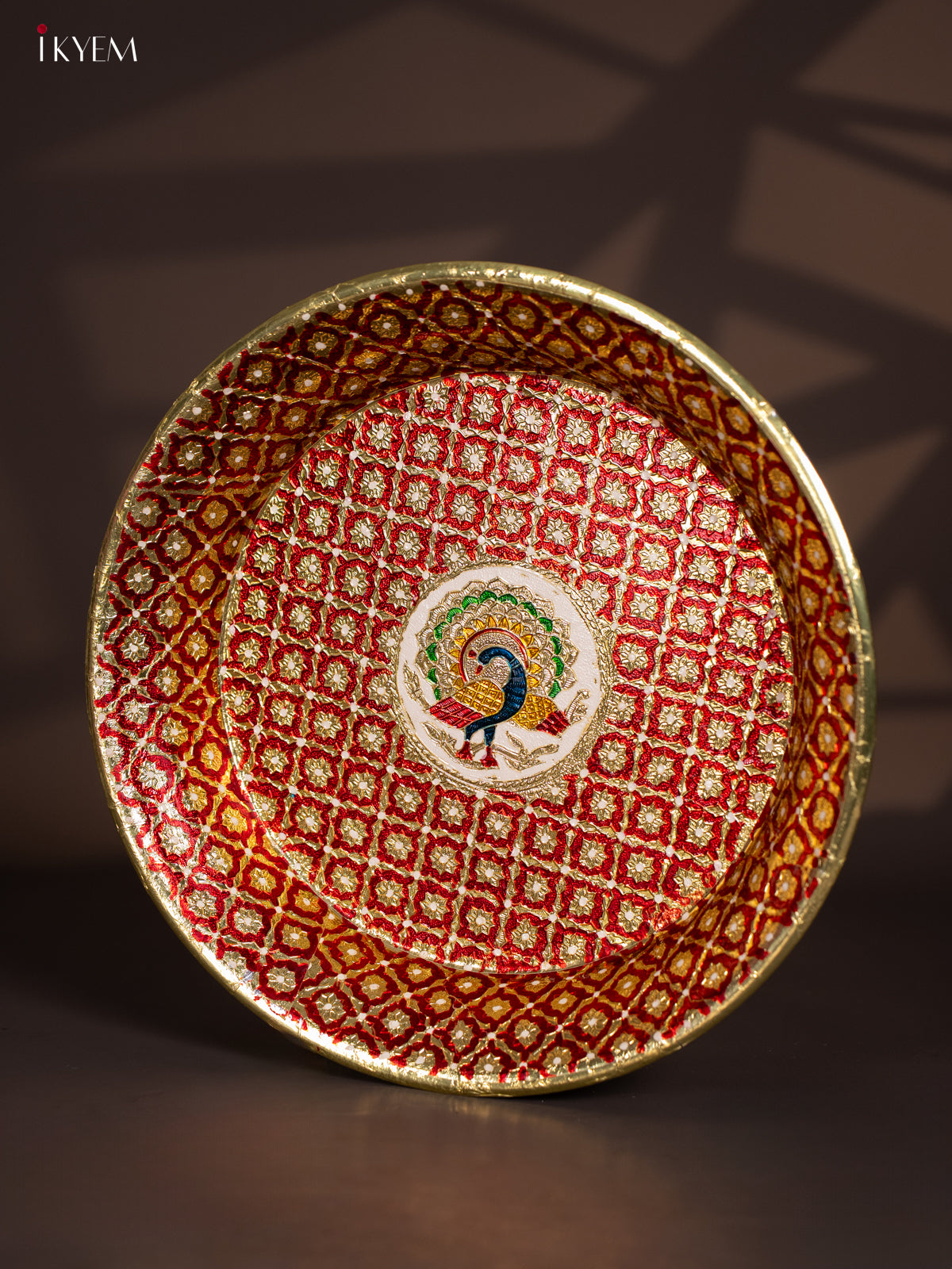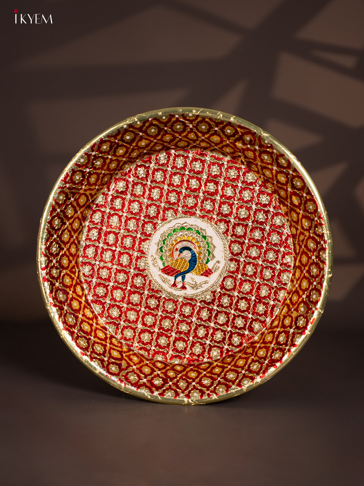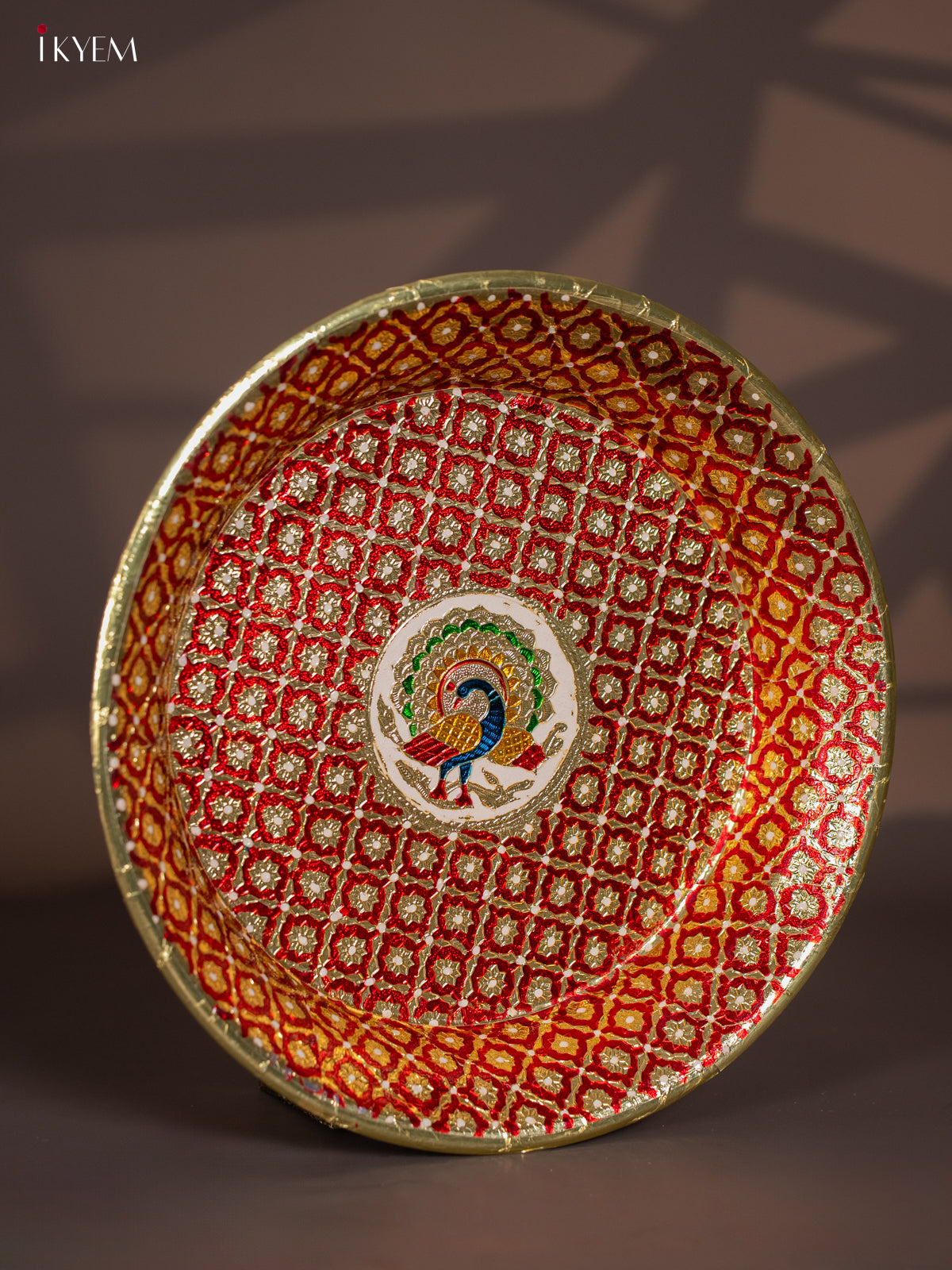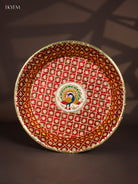 - Enhance your pooja rituals with the Meenakari Round Plate in red, measuring 15.5 by 15.5 inches.