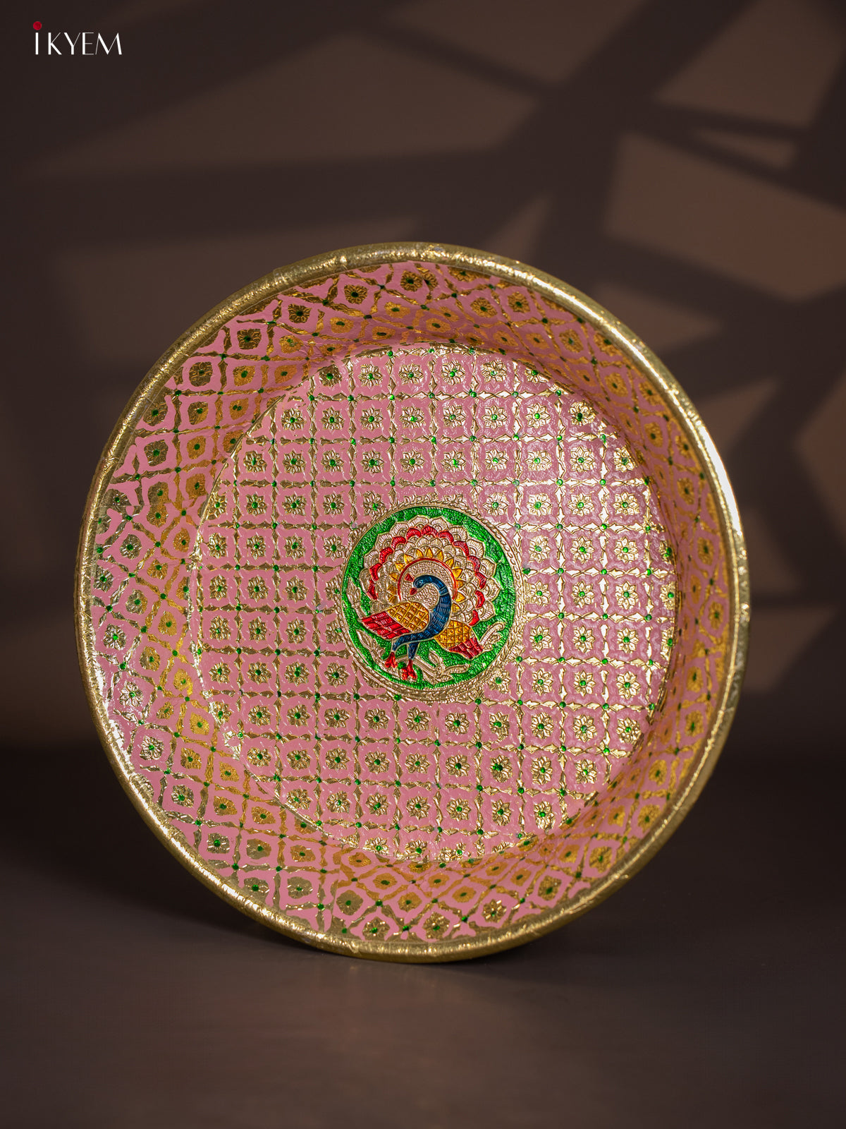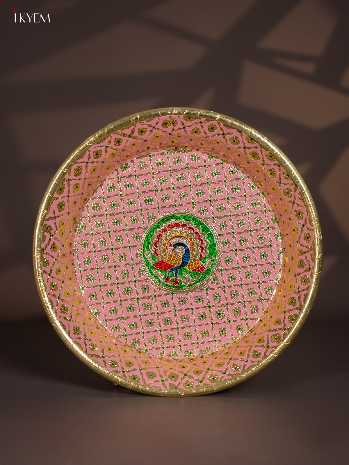 - The Meenakari Round Plate in pink, measuring 15.5 x 15.5 inches, is designed for pooja ceremonies, stylish decor, and thoughtful return gifts.