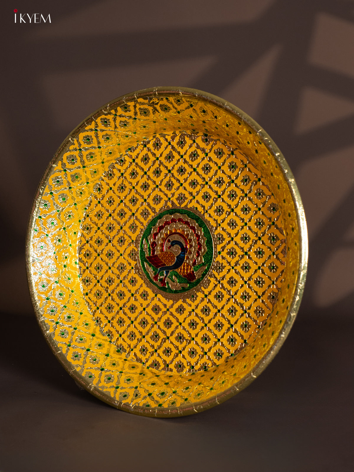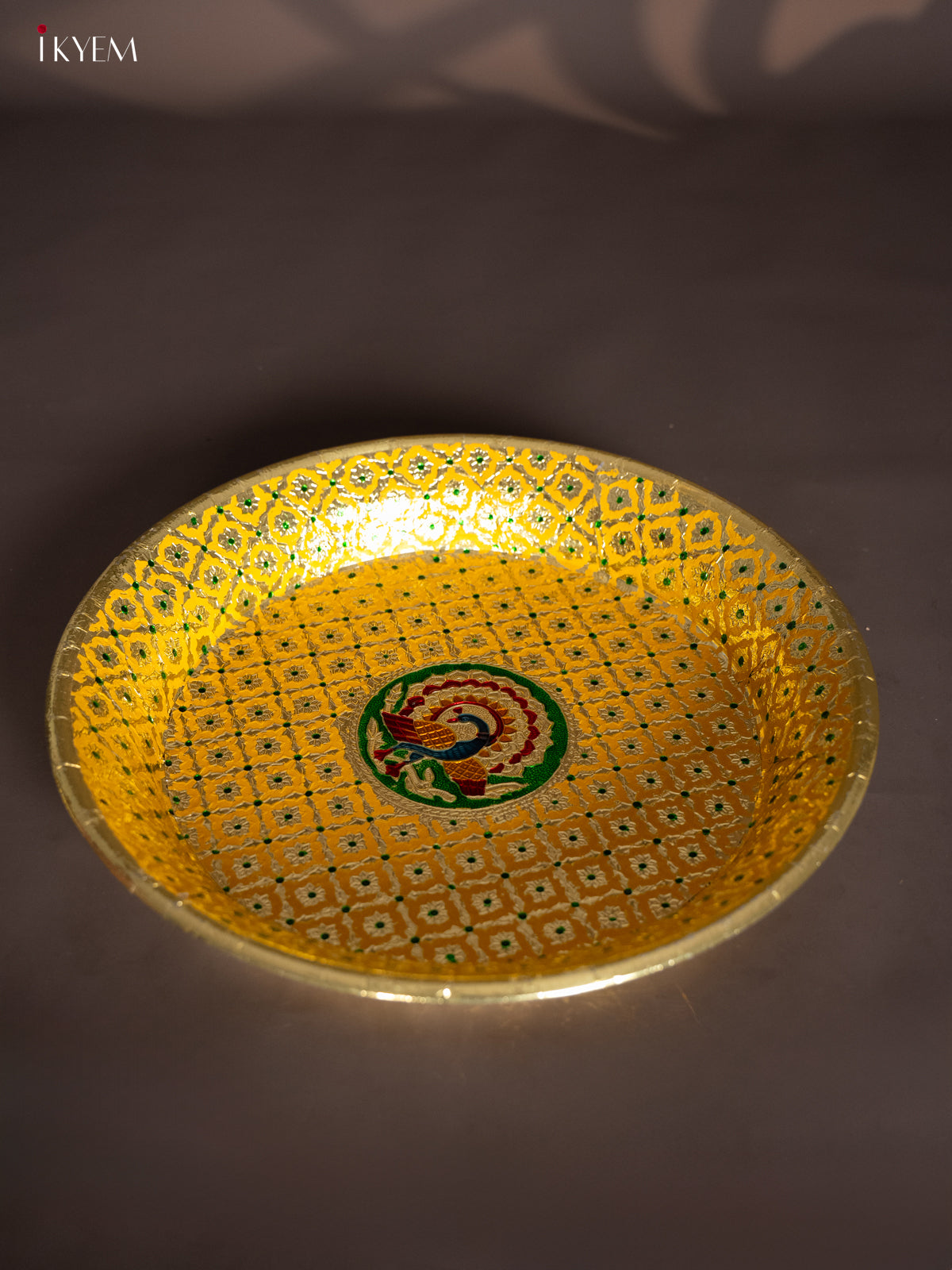 - The Meenakari Round Plate in Yellow, sized 15.5 x 15.5 inches, is perfect for pooja ceremonies or as an elegant return gift.