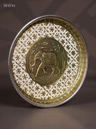 Add elegant tradition to your celebrations with this 11‑inch white Meenakari plate adorned with a beautiful oxidized elephant motif. Measuring 11″ L × 11″ W × 1″ H and weighing approximately 175 g — it’s light yet sturdy, perfect for serving sweets, dry fruits, or offerings during festivals or poojas.