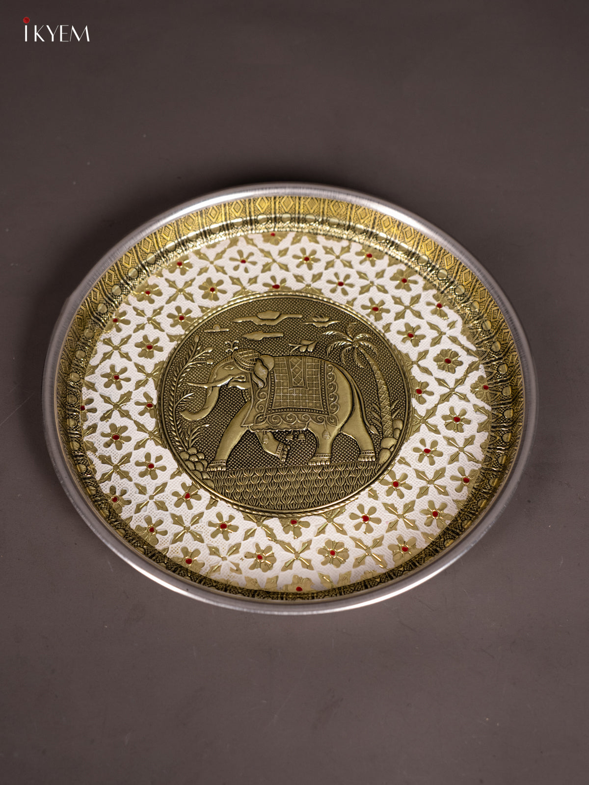 White Meenakari Plate with Oxidized Elephant Design - 11 Inch - KJ27125