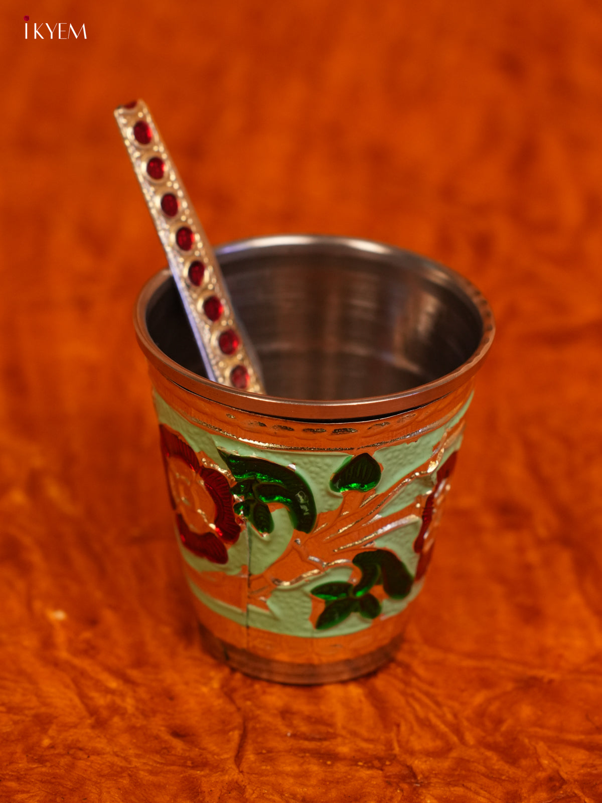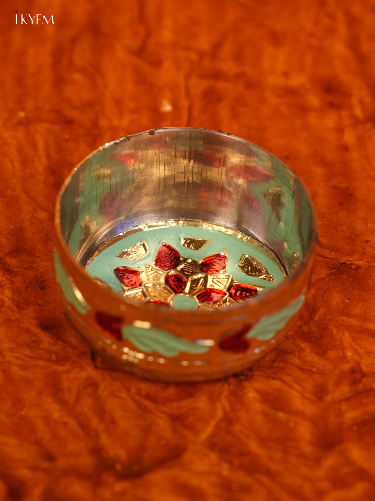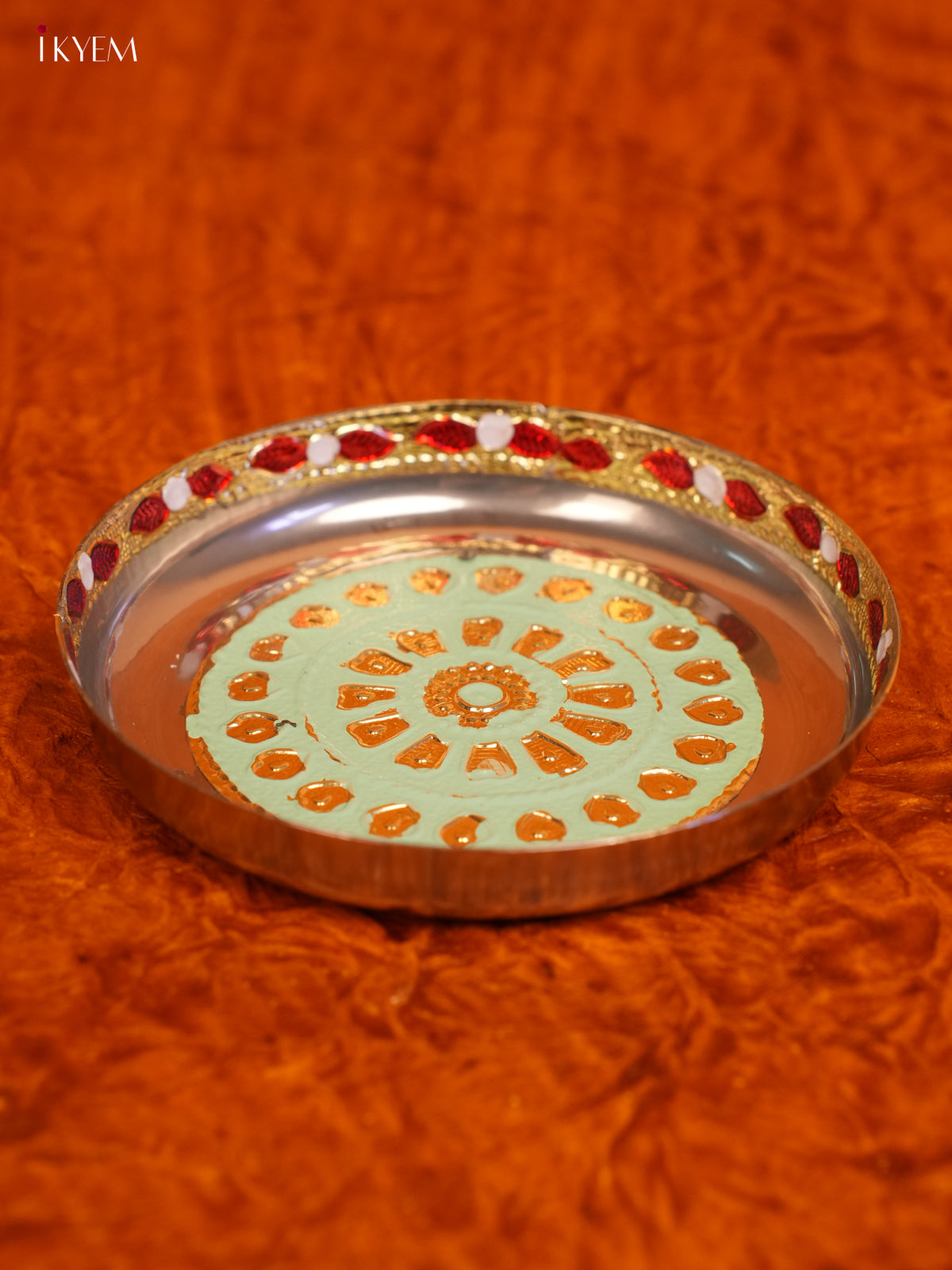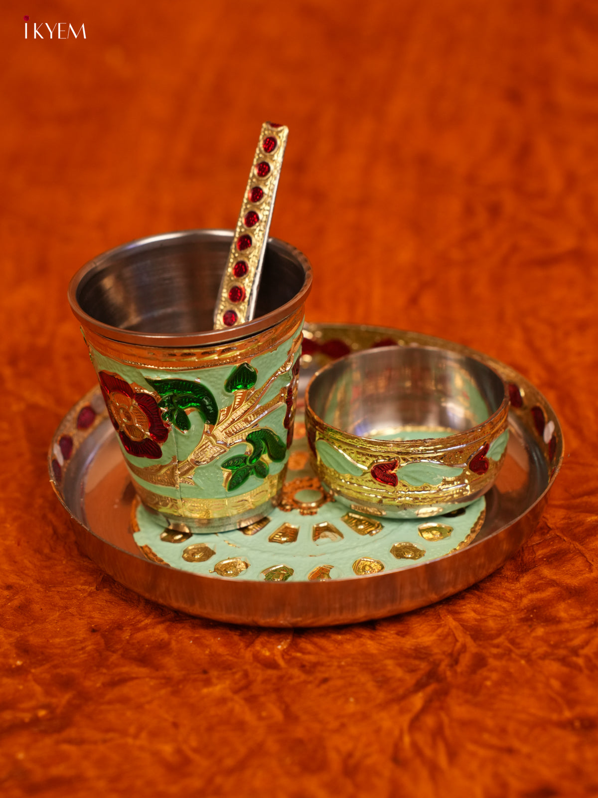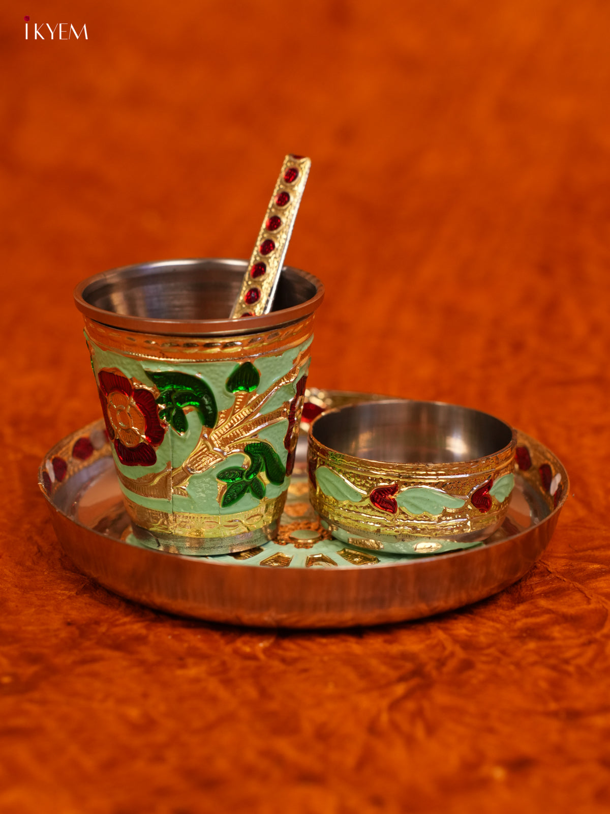 - Enhance your religious ceremonies with this traditional Meenakari Baby Thali Set in Green.
