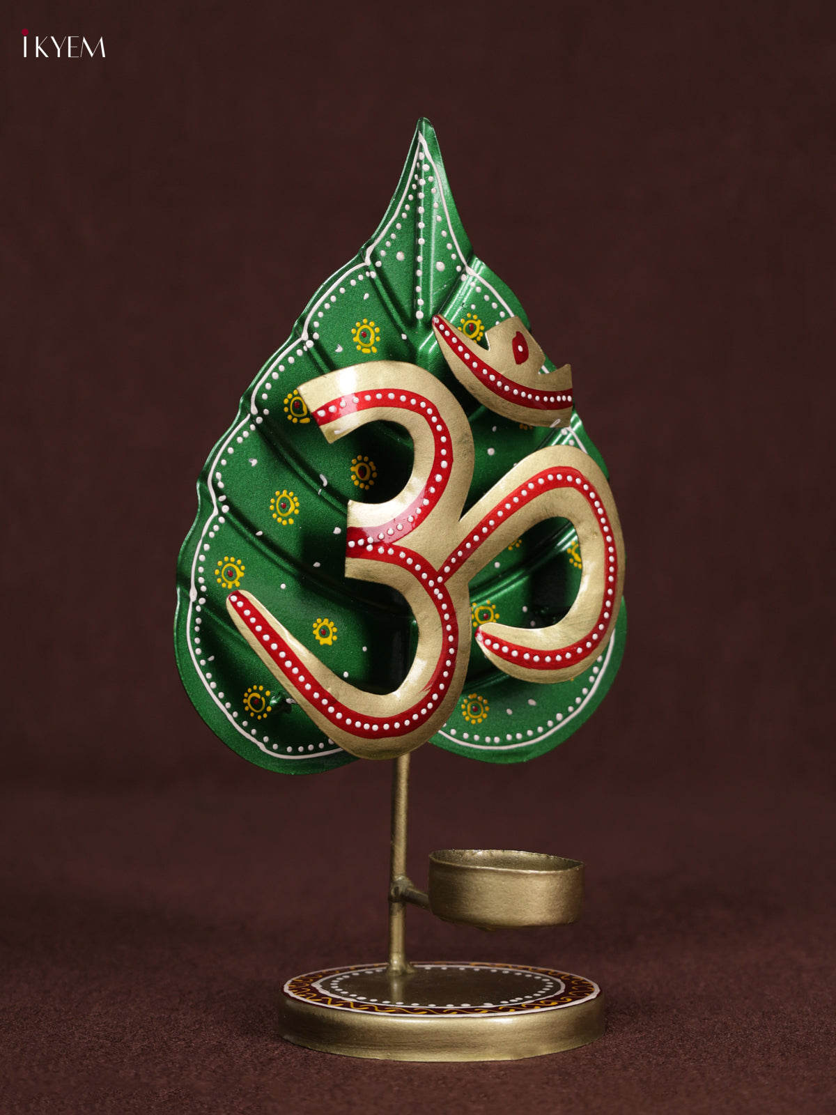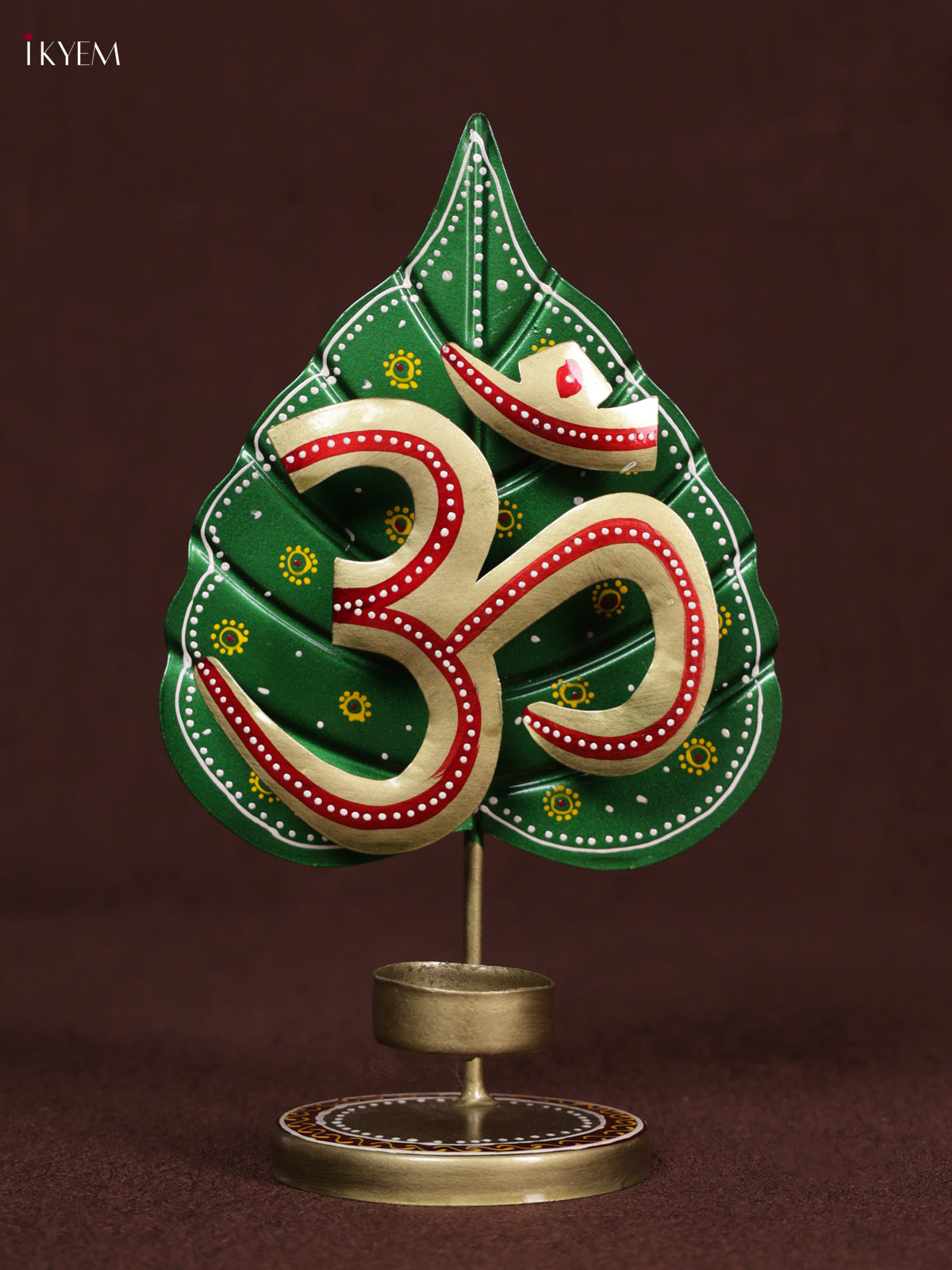 - The Metal Hand-Painted Leaf OM T-Light is a devotional décor piece featuring the sacred “Om” (ॐ) symbol mounted on a stylized leaf backdrop with a tea light holder at the base