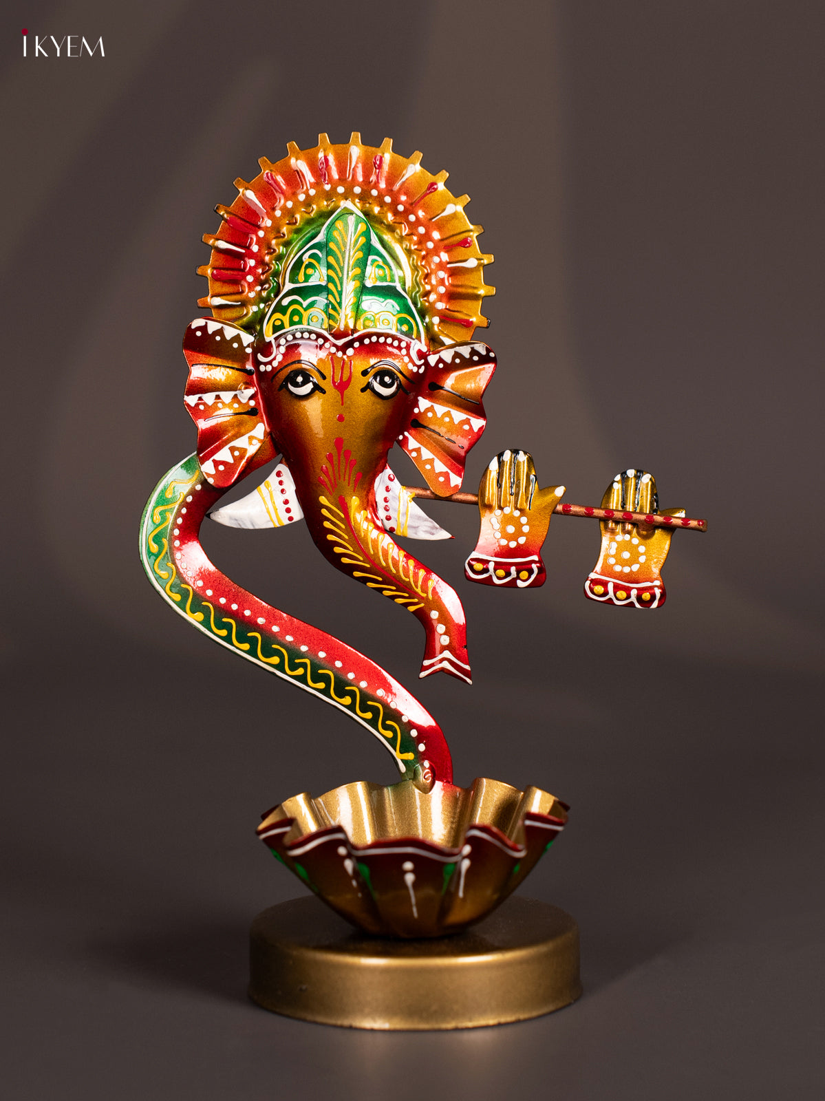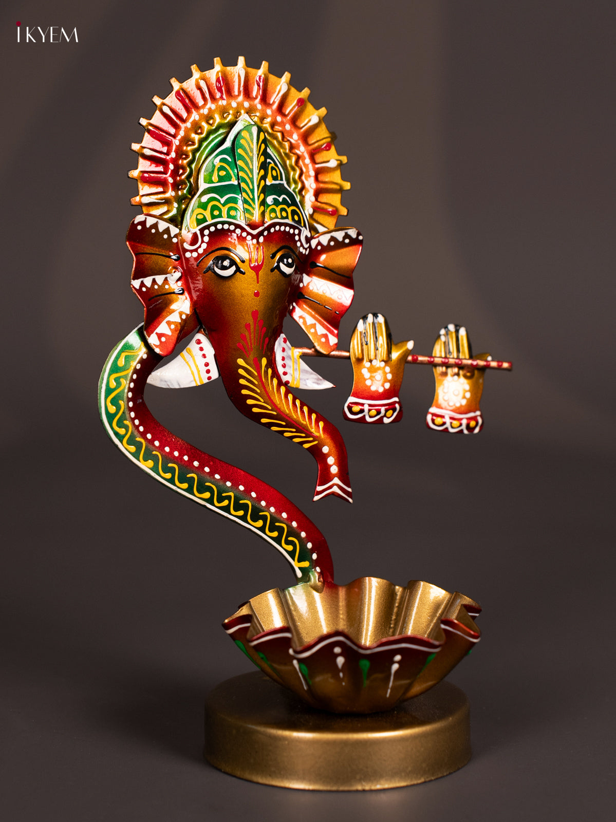 - The Metal Painted T-Light Ganesha image is to showcase a decorative and devotional artifact designed to serve both spiritual and aesthetic functions