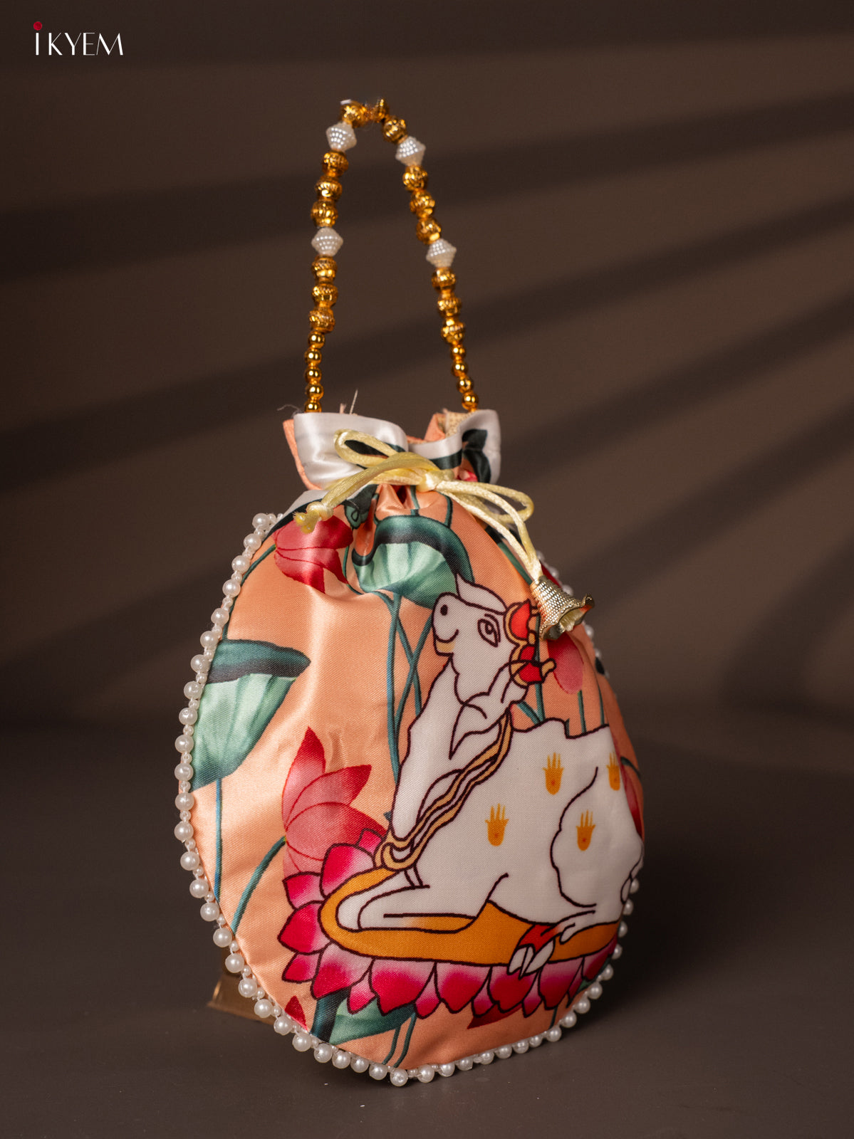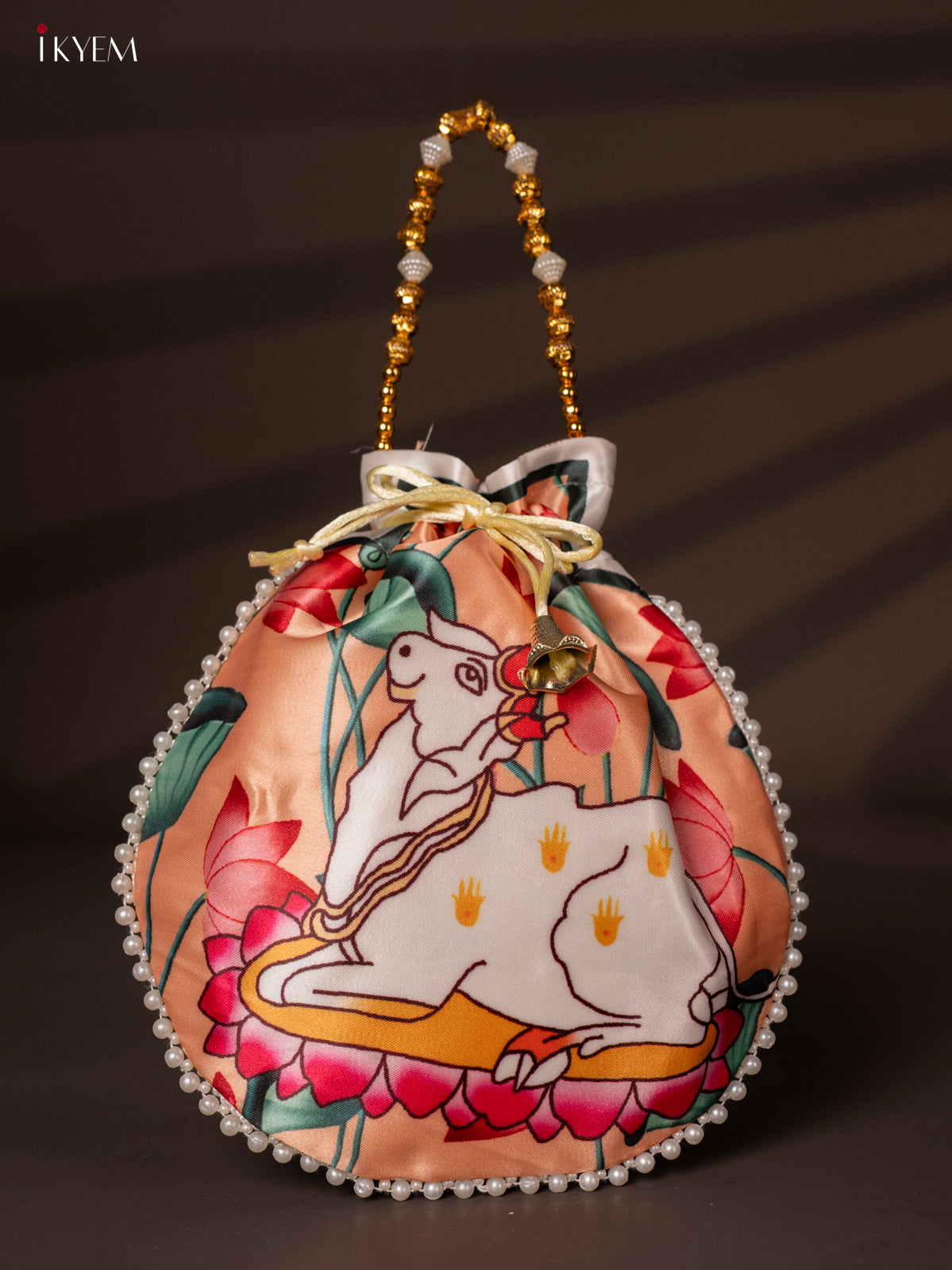 - This peach Pichwai cow digital printed potli bag combines traditional charm with practical design.