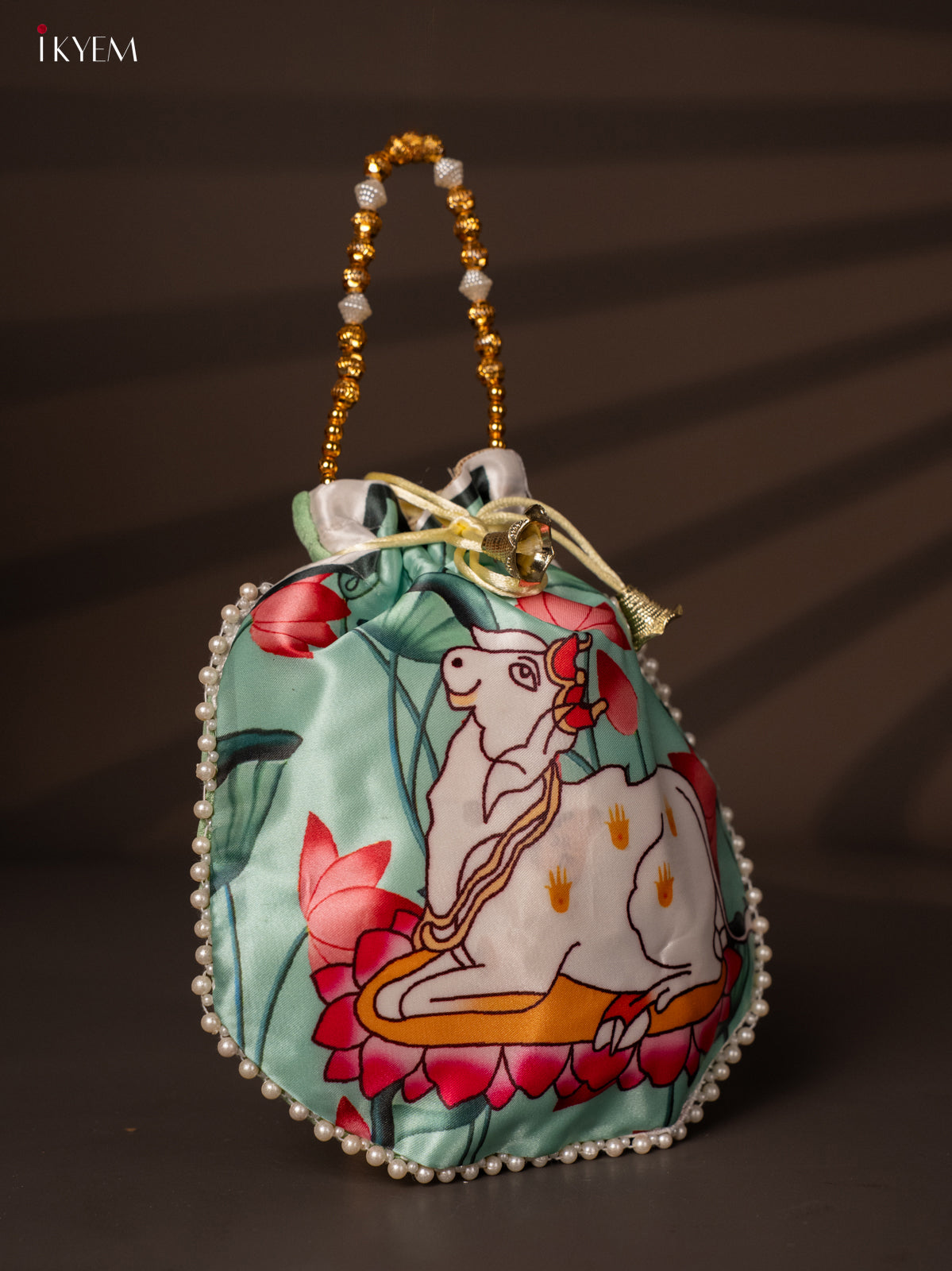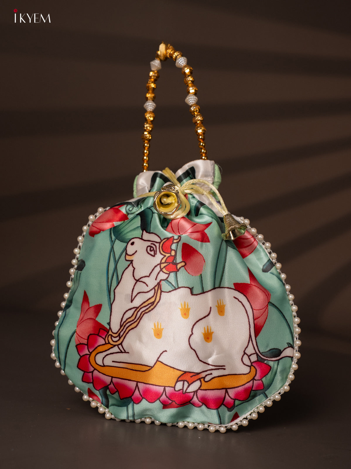 - This Green Pichwai cow digital printed potli bag combines traditional charm with practical design.