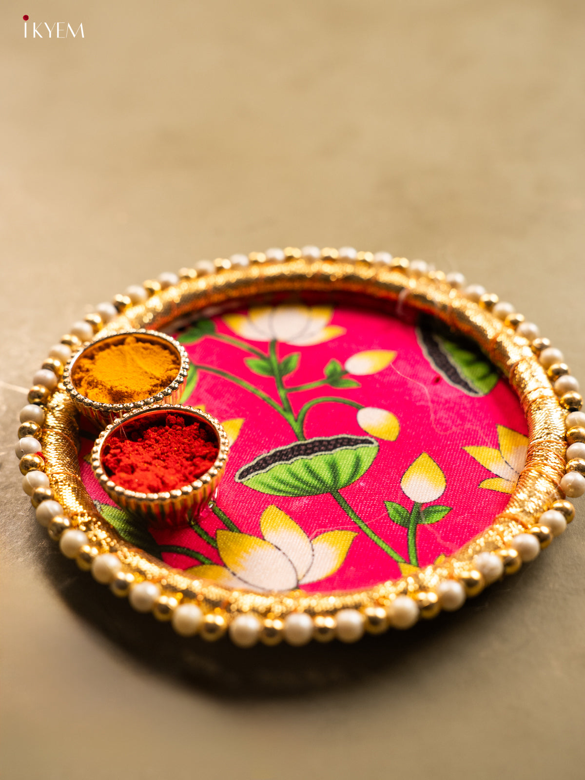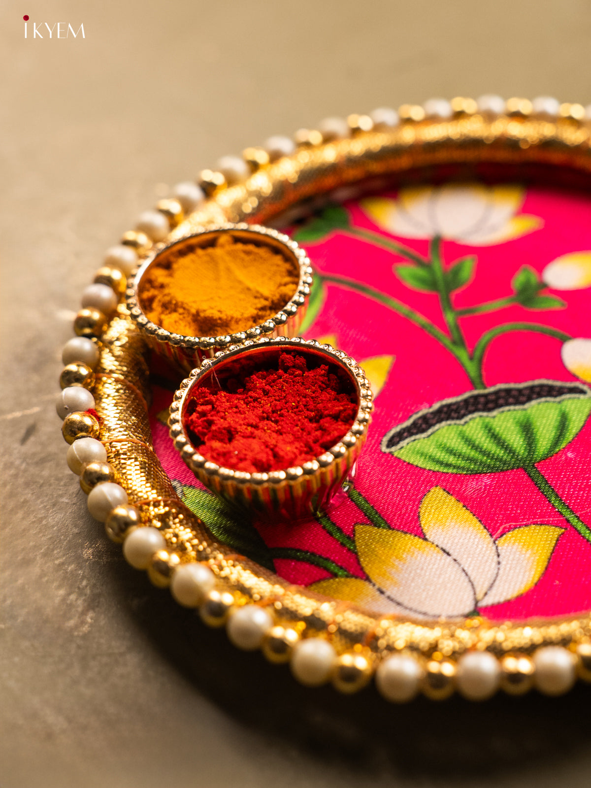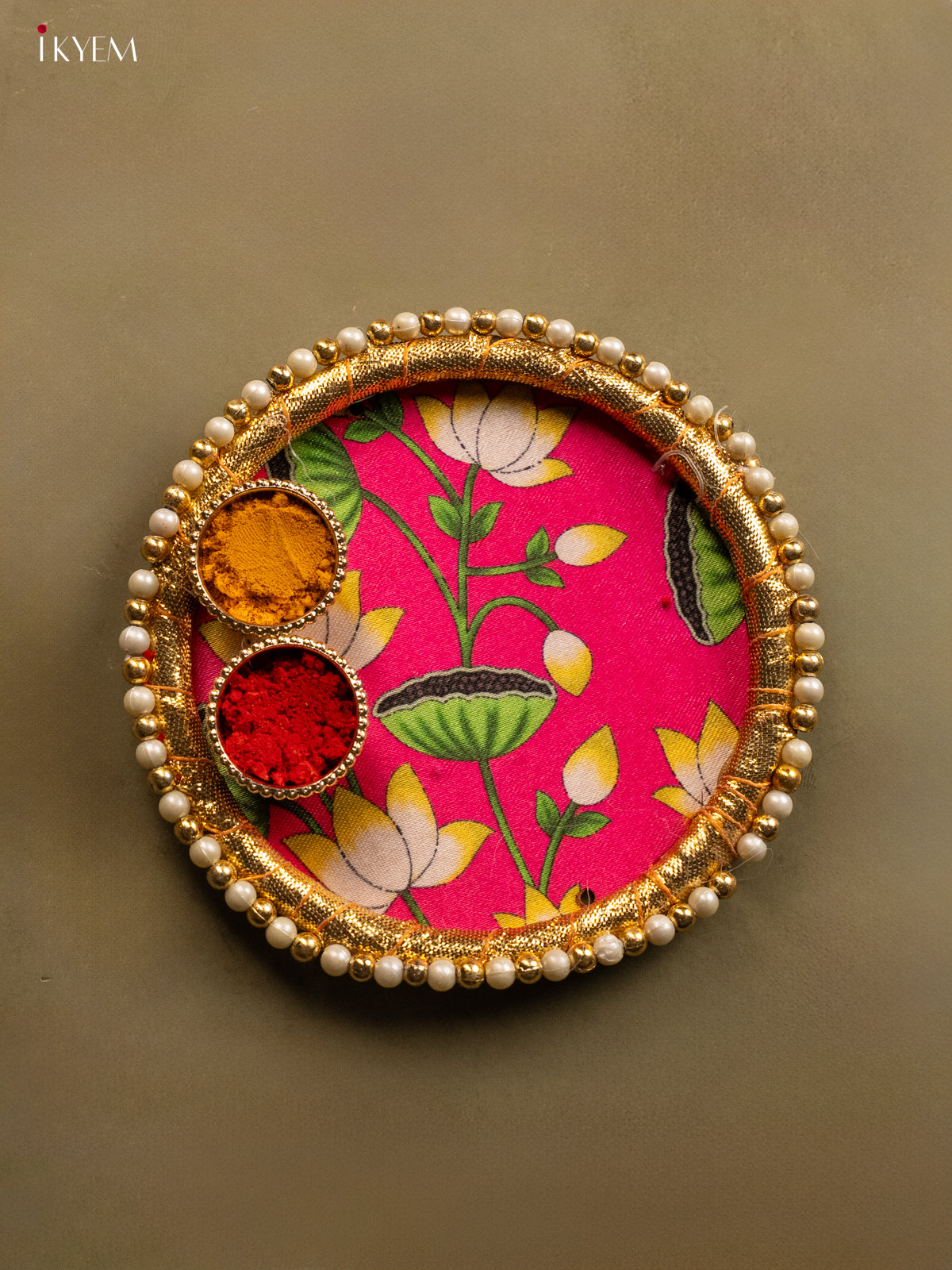Elegant Pichwai Style Lotus Printed Pink Plate with Haldi Kumkum Holder - KG31115