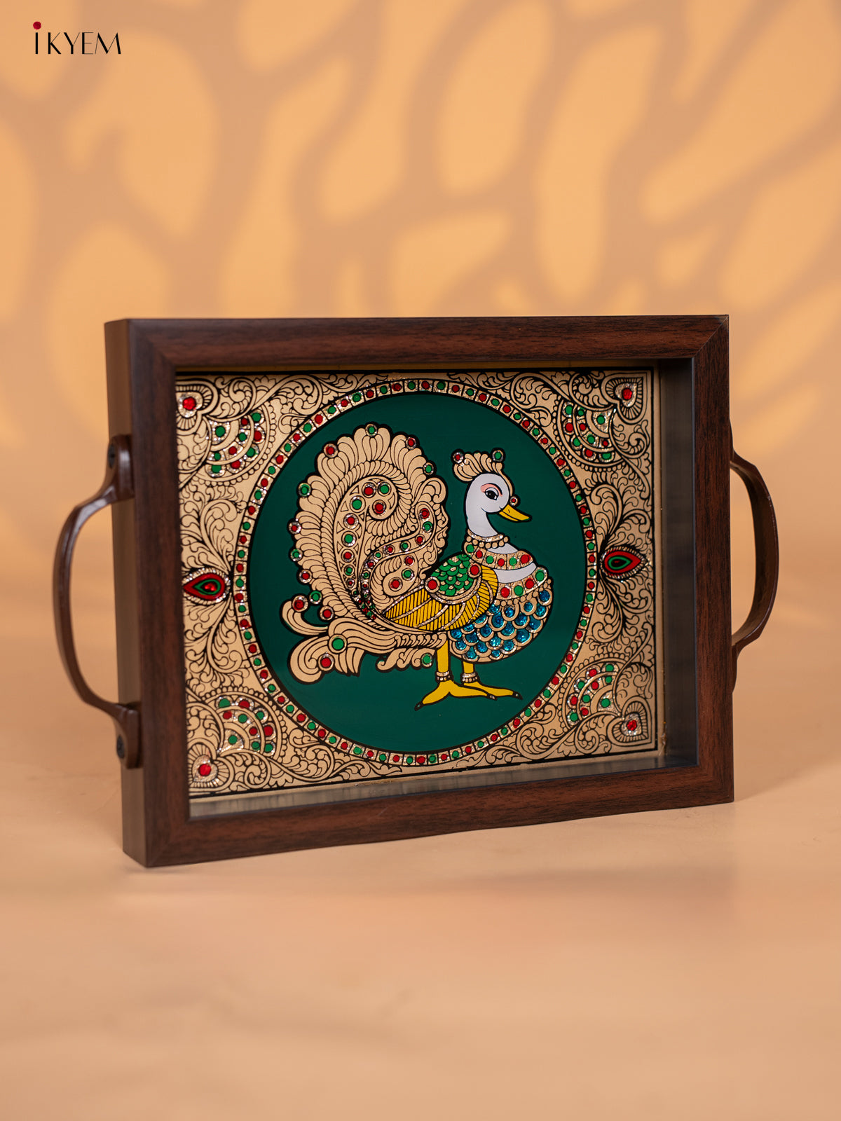 - This 9x7 inch Reverse Glass Painted Tray features a vivid green background with an intricately designed Annapakshi motif.