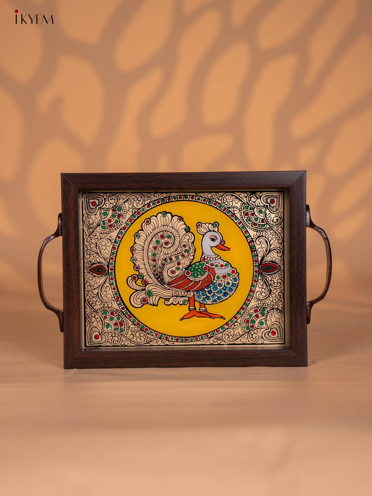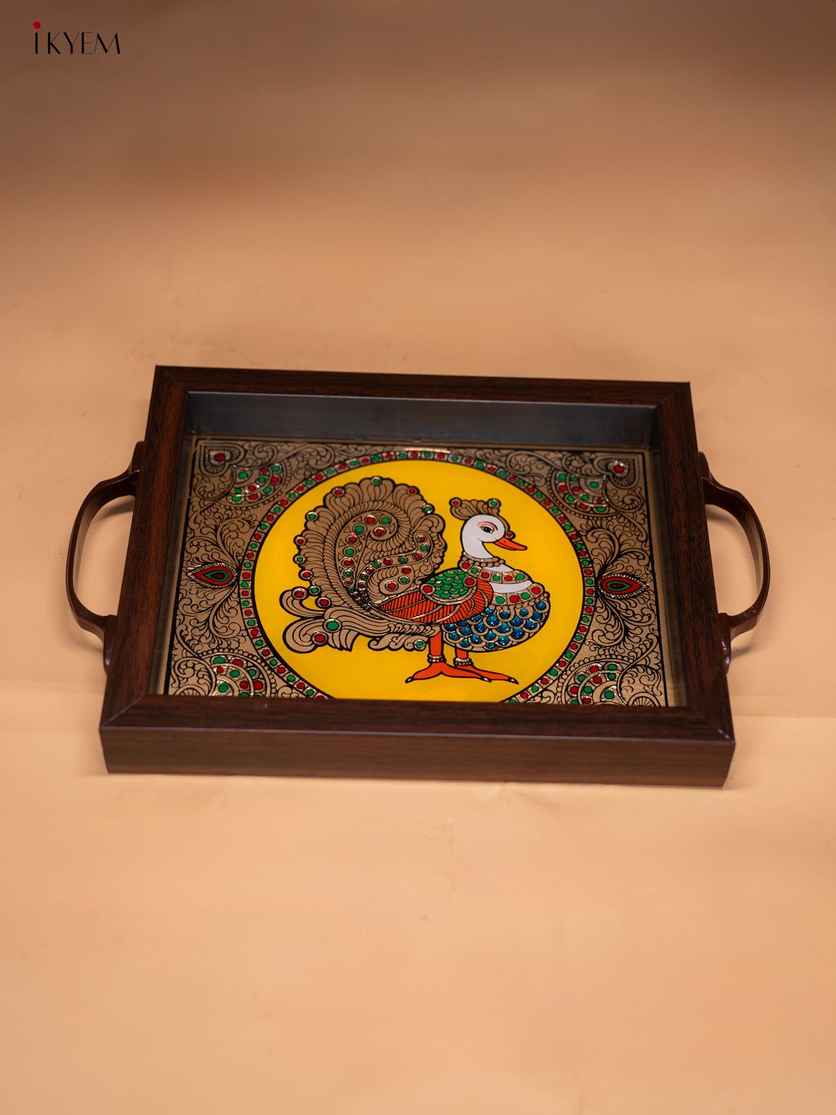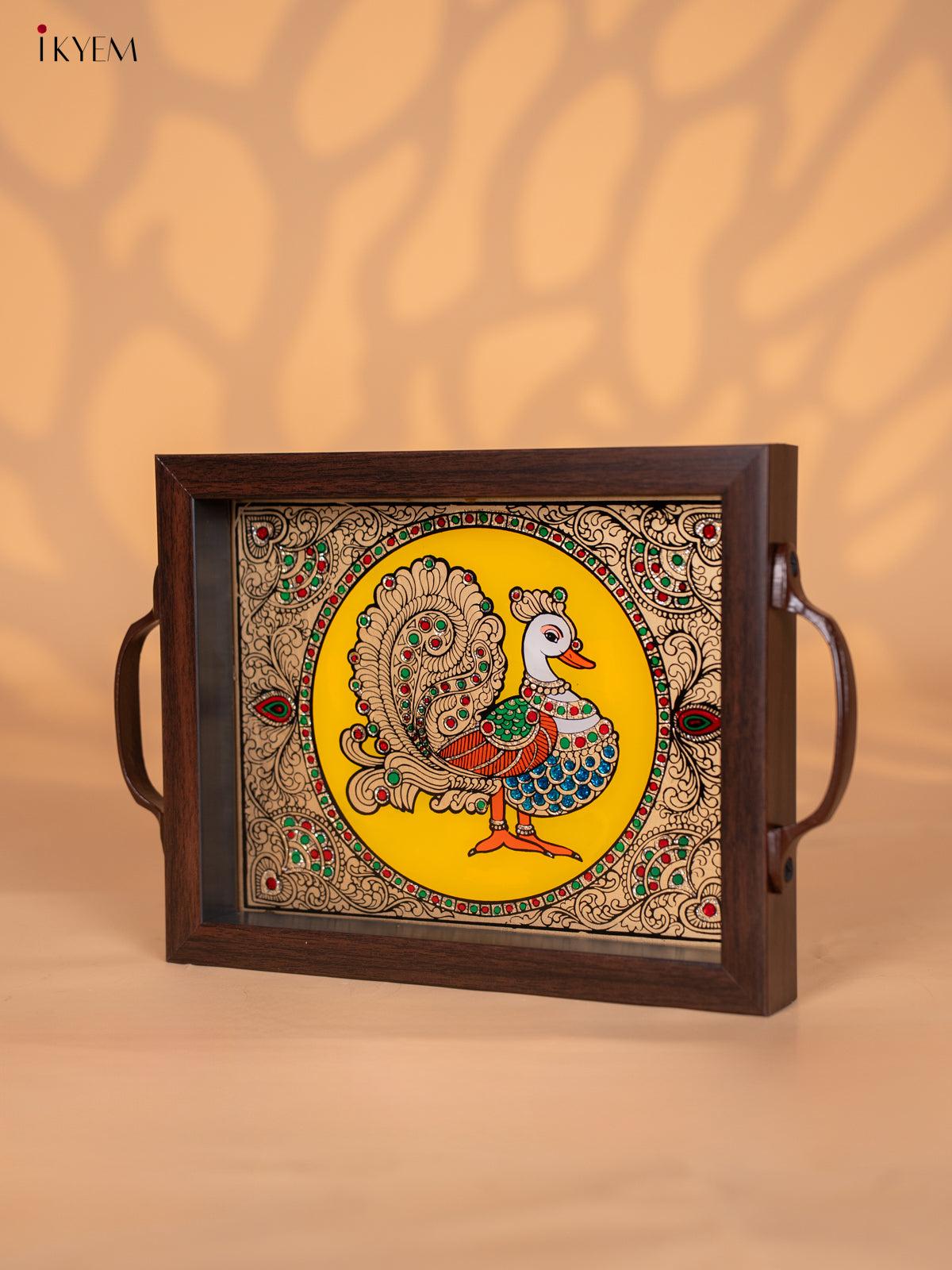 - This 9x7 inch Reverse Glass Painted Tray features a vivid yellow background with an intricately designed Annapakshi motif.