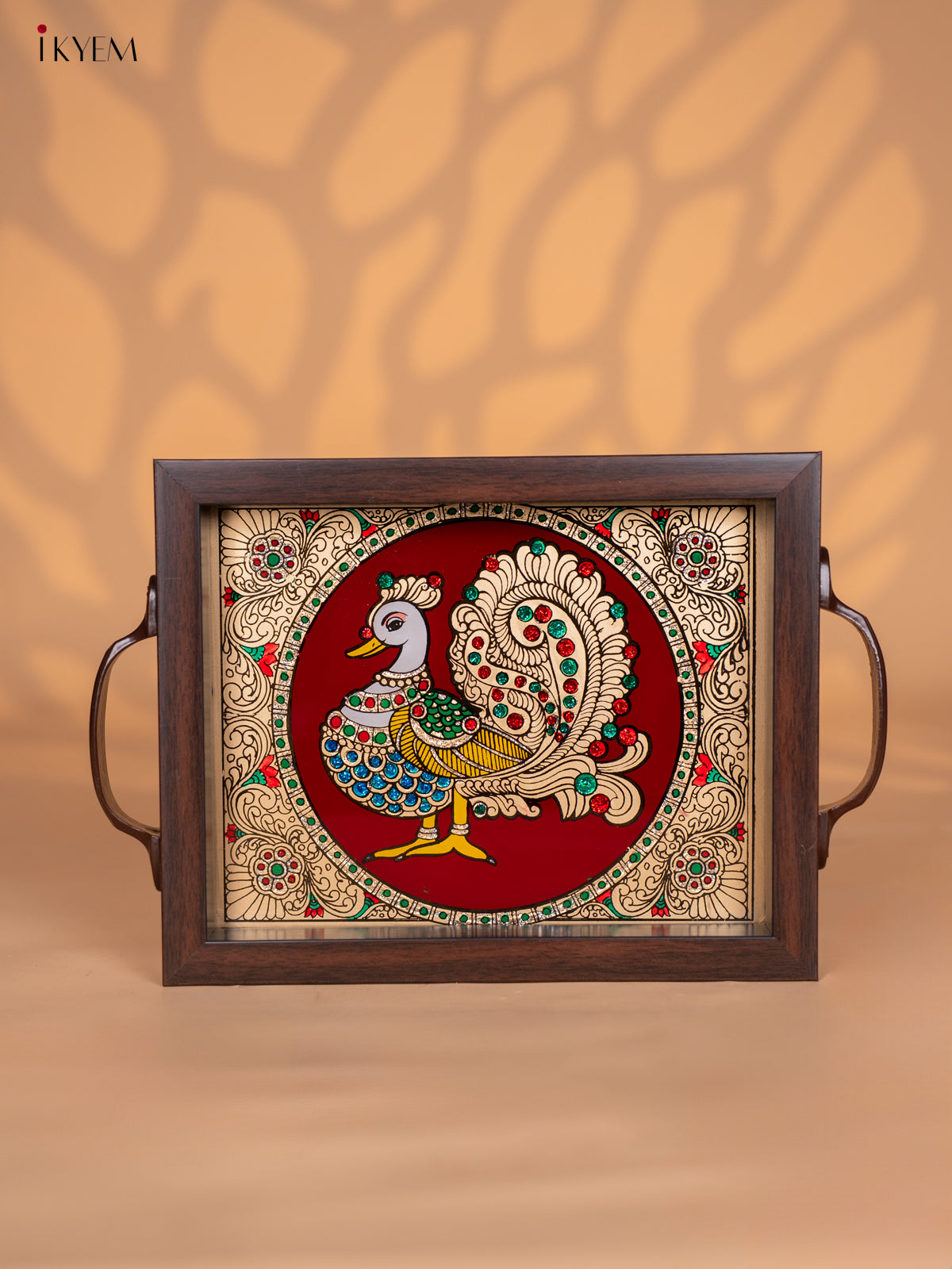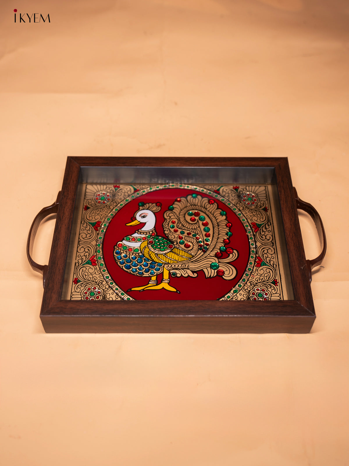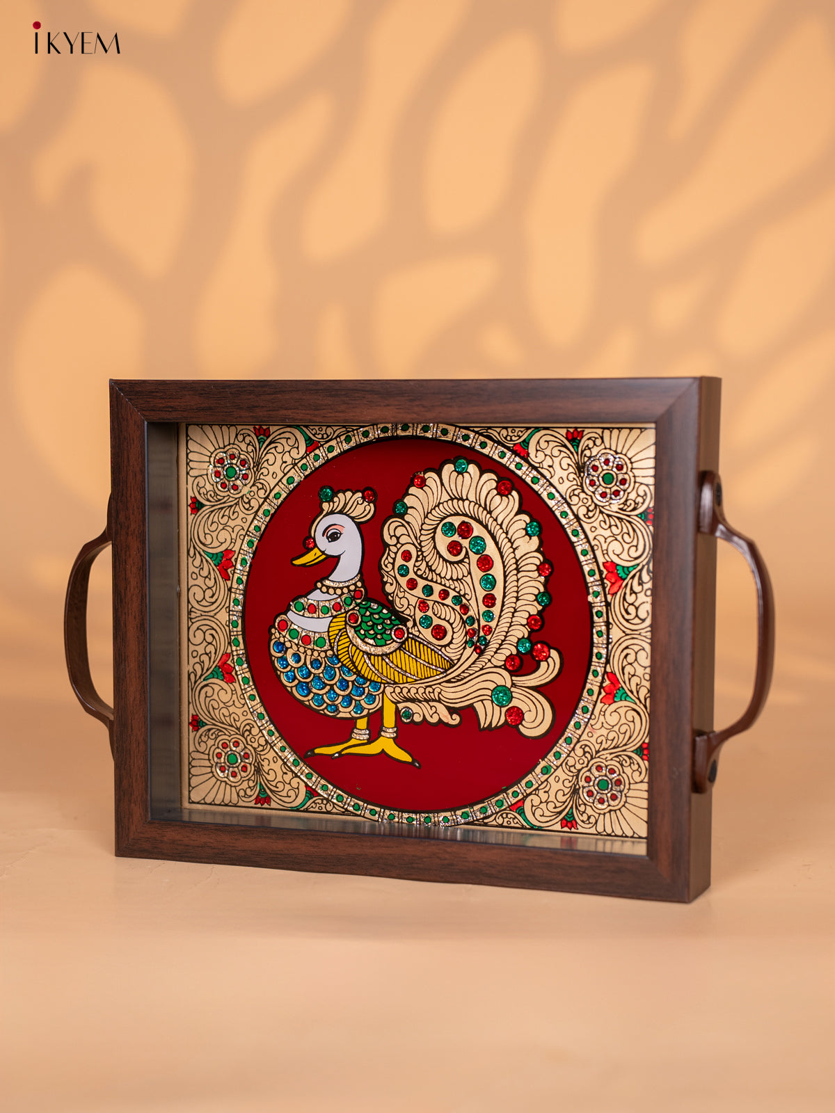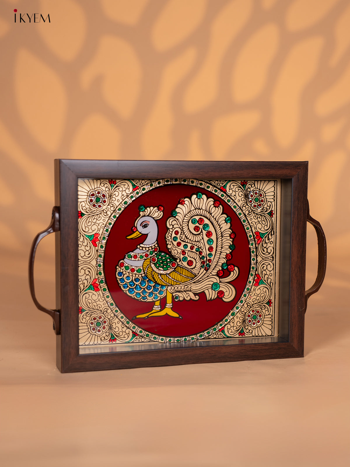 - This 9x7 inch Reverse Glass Painted Tray features a vivid maroon background with an intricately designed Annapakshi motif.
