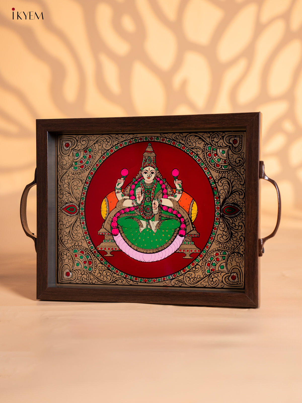 - This maroon reverse glass painted tray, measuring 11x9 inches, beautifully depicts Goddess Lakshmi, making it perfect for pooja rituals and as a meaningful return gift.