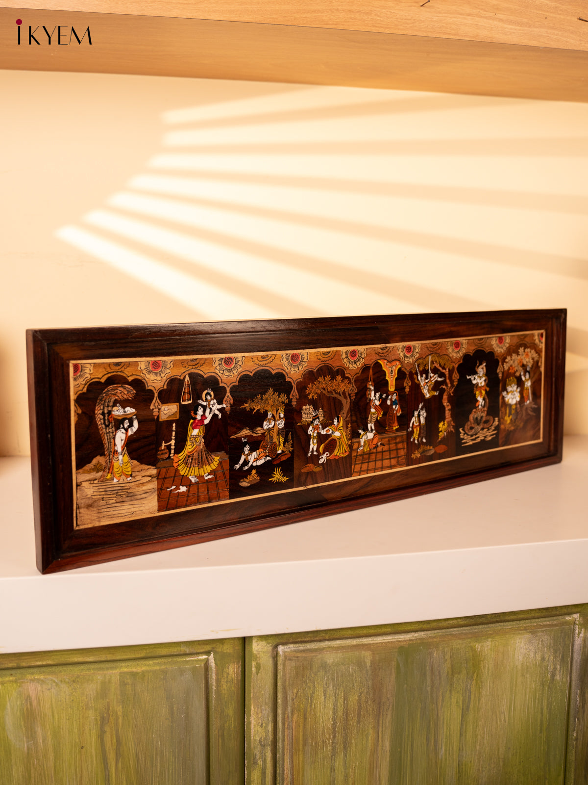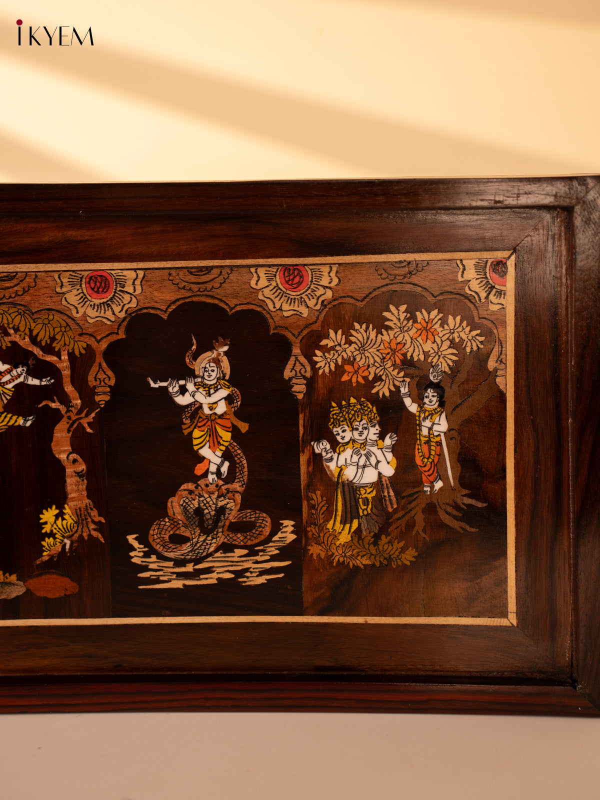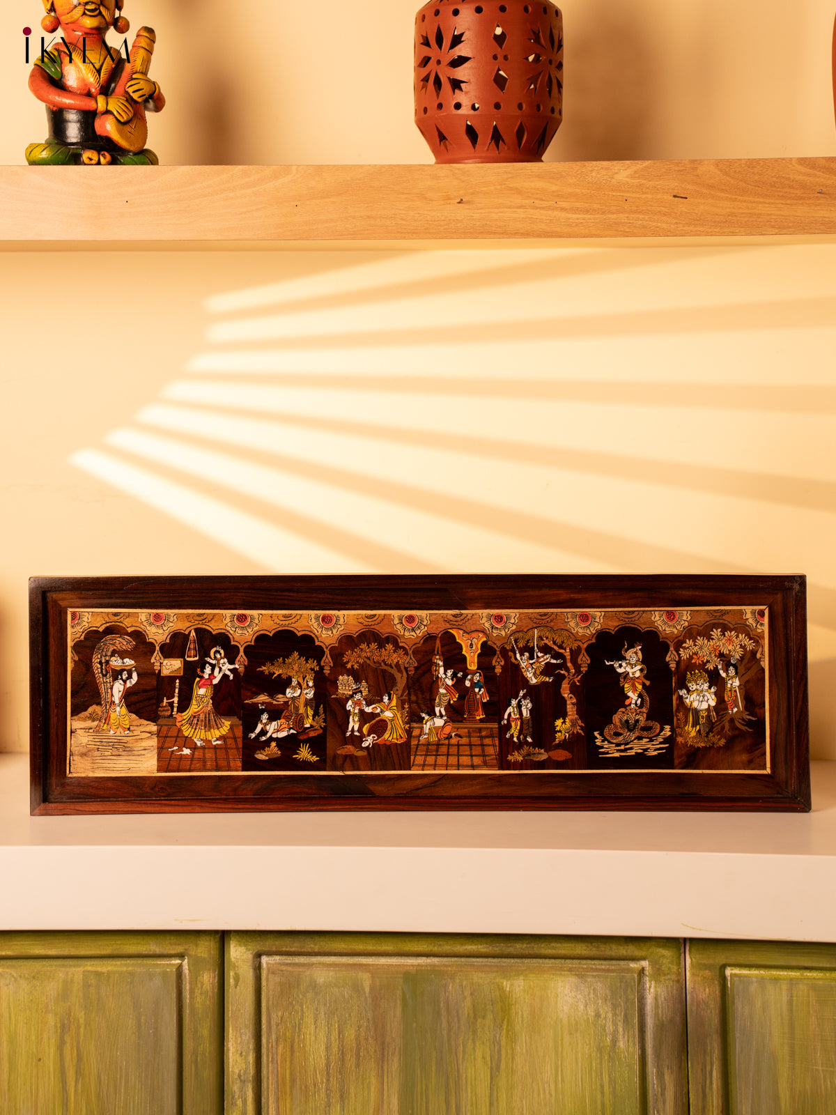 - This Mysore Rosewood Inlay Wooden inlay Frame depicts Krishna Leela with intricate hand-carved details.
