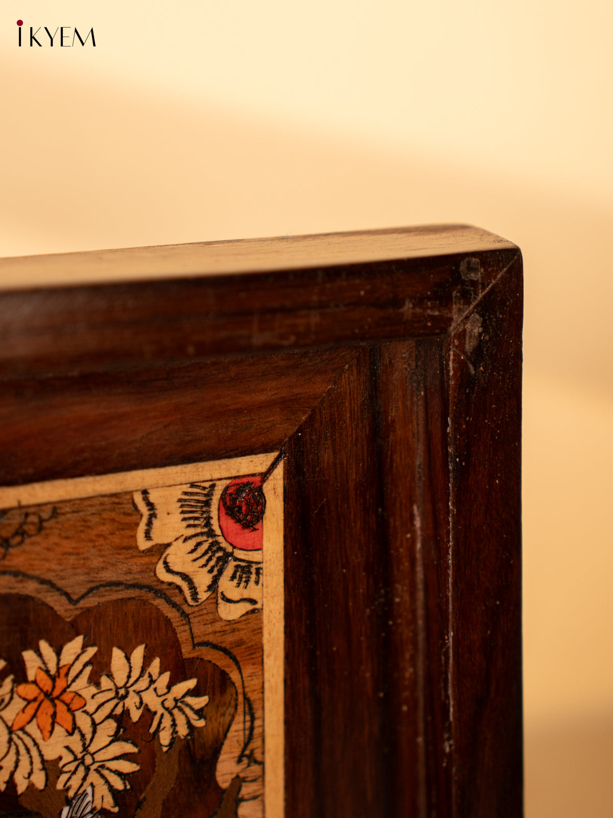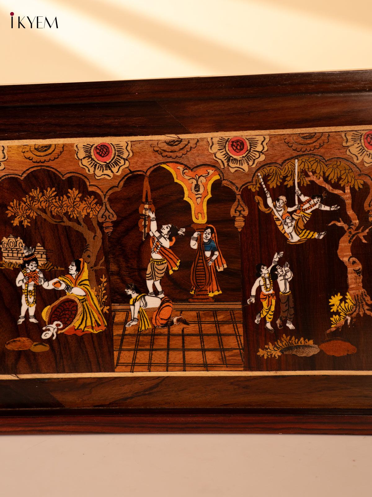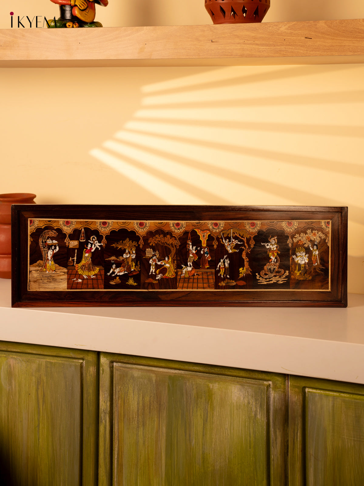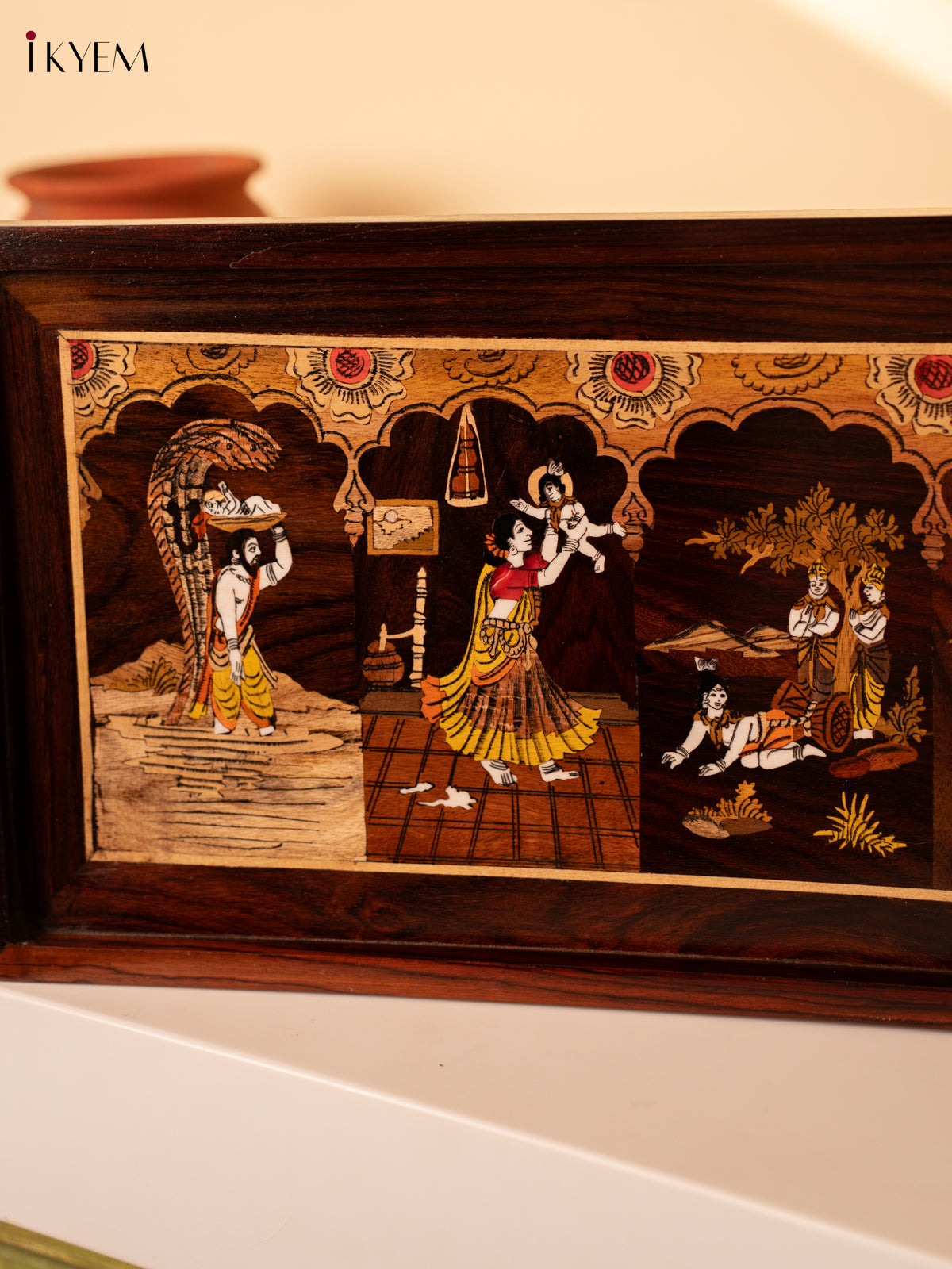 - This Mysore Rosewood Inlay Wooden inlay Frame depicts Krishna Leela with intricate hand-carved details.