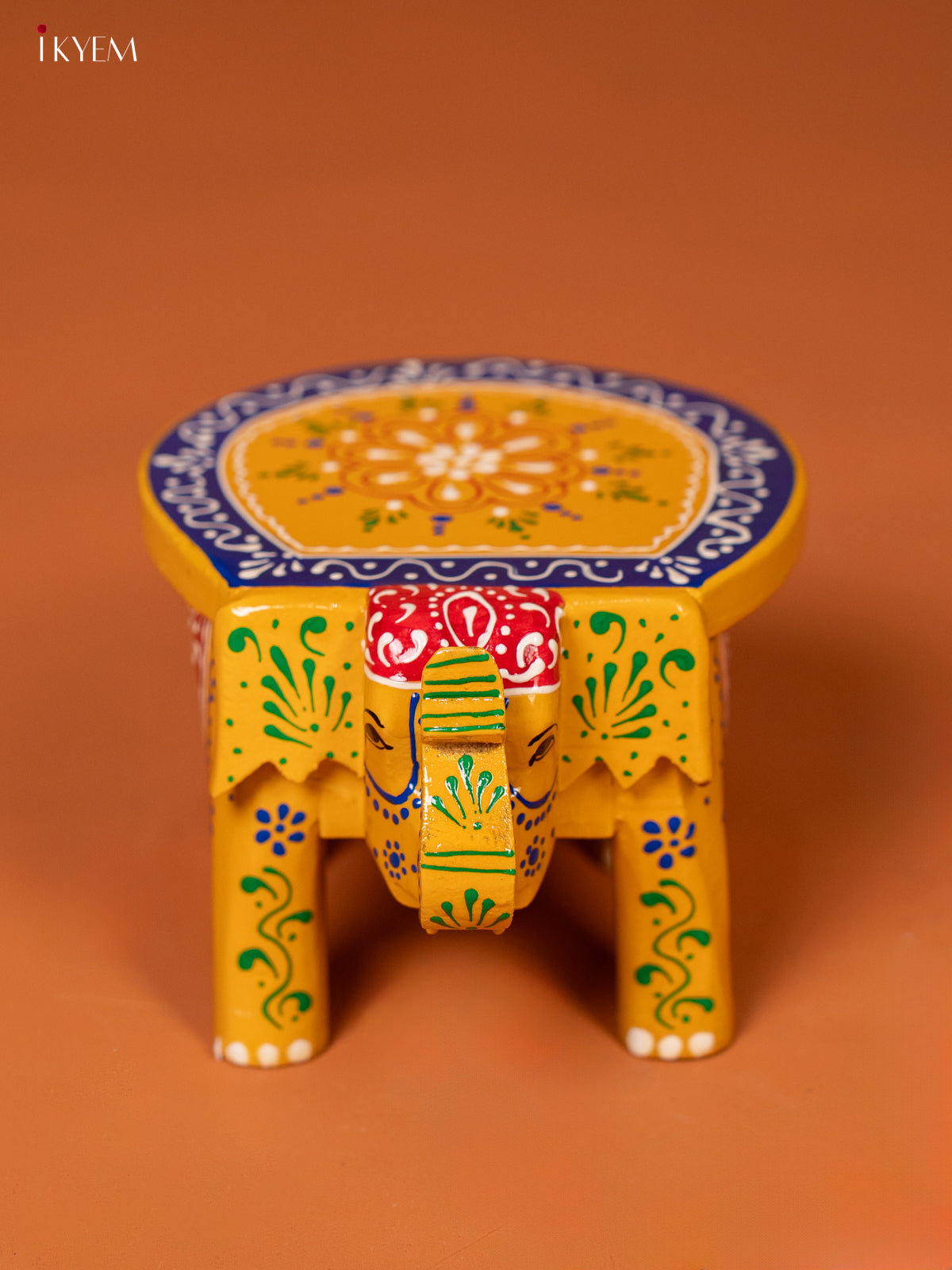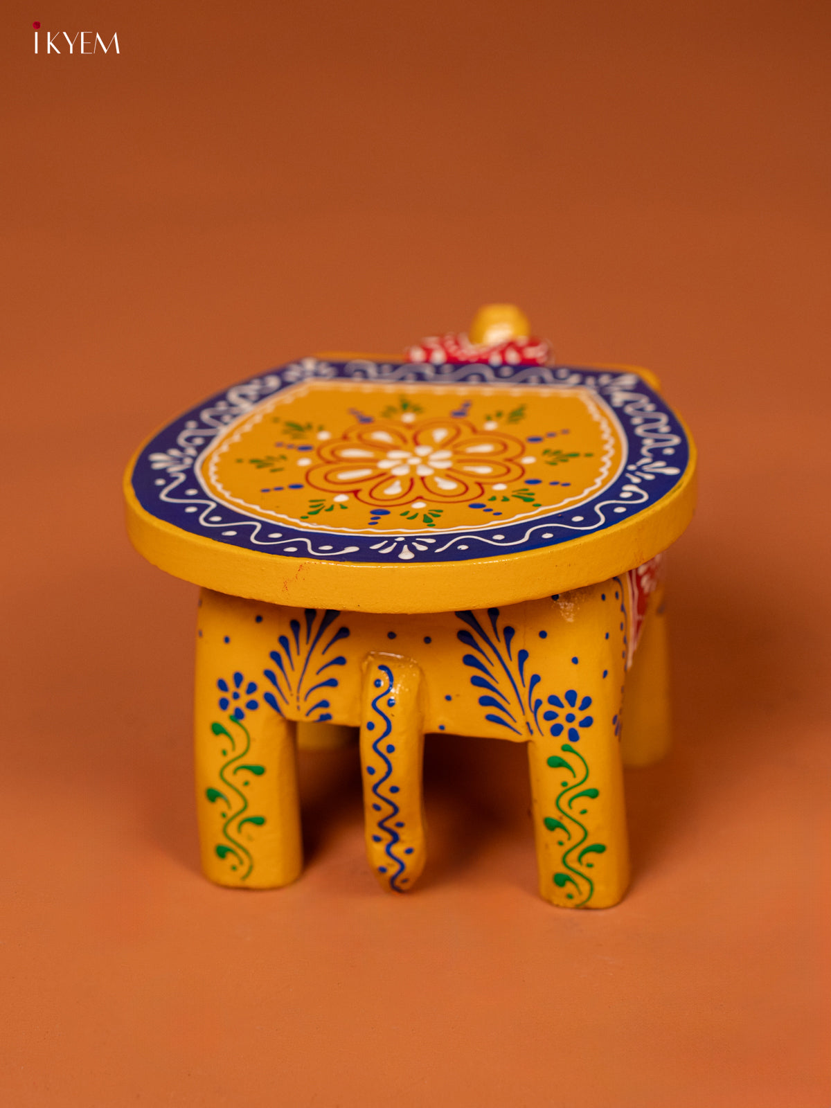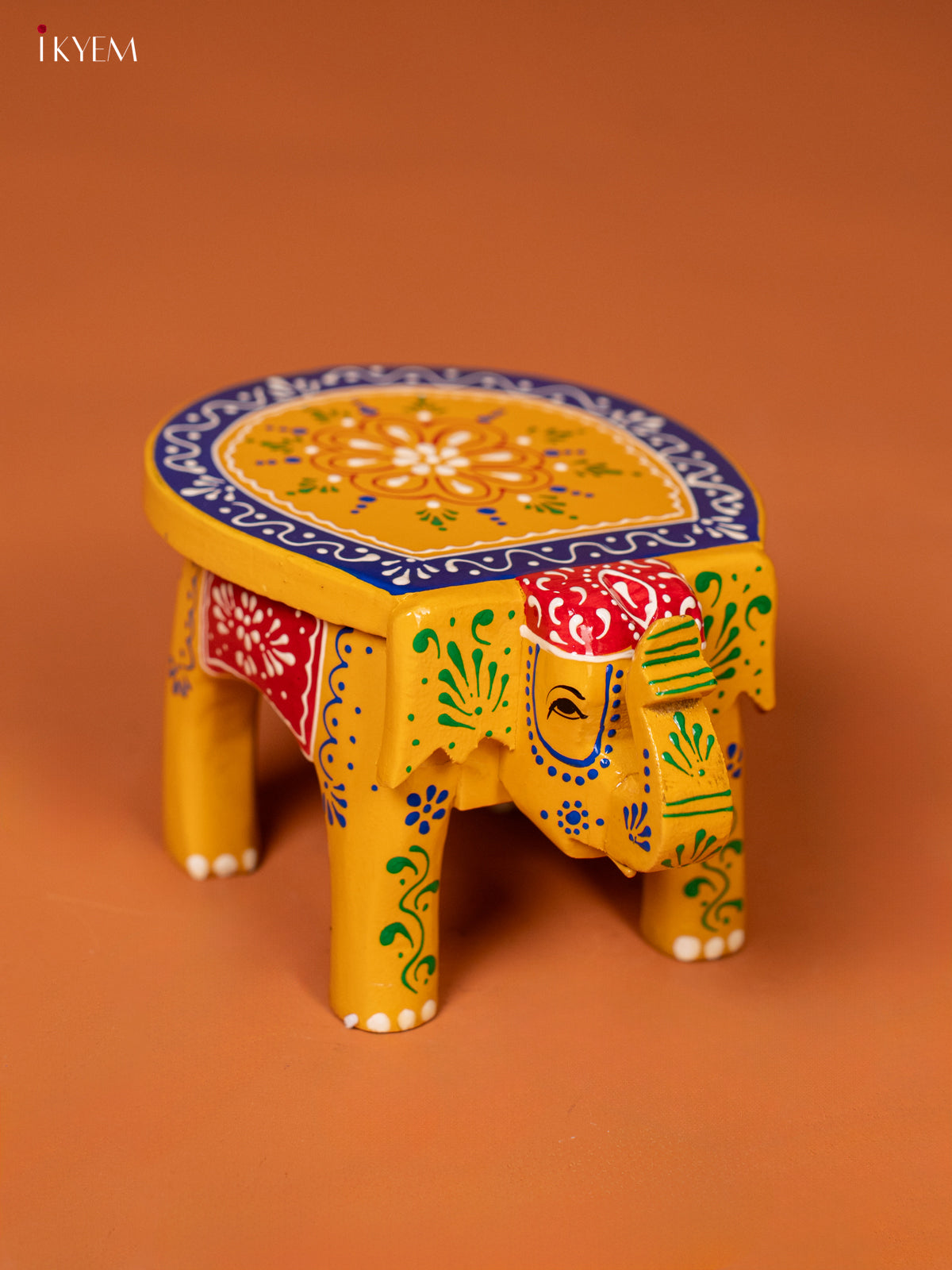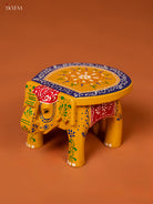 - This 4-inch yellow wooden elephant stool features intricate hand-painted details that showcase traditional artistry.