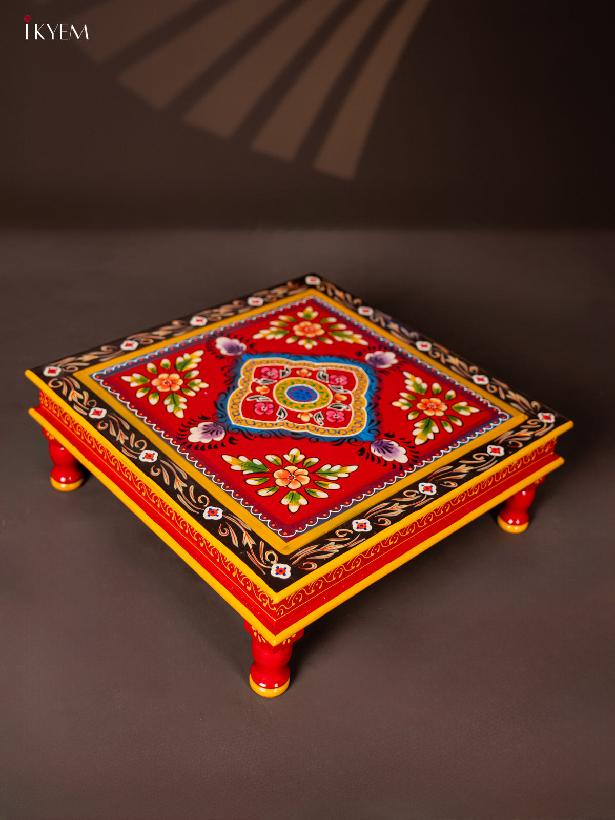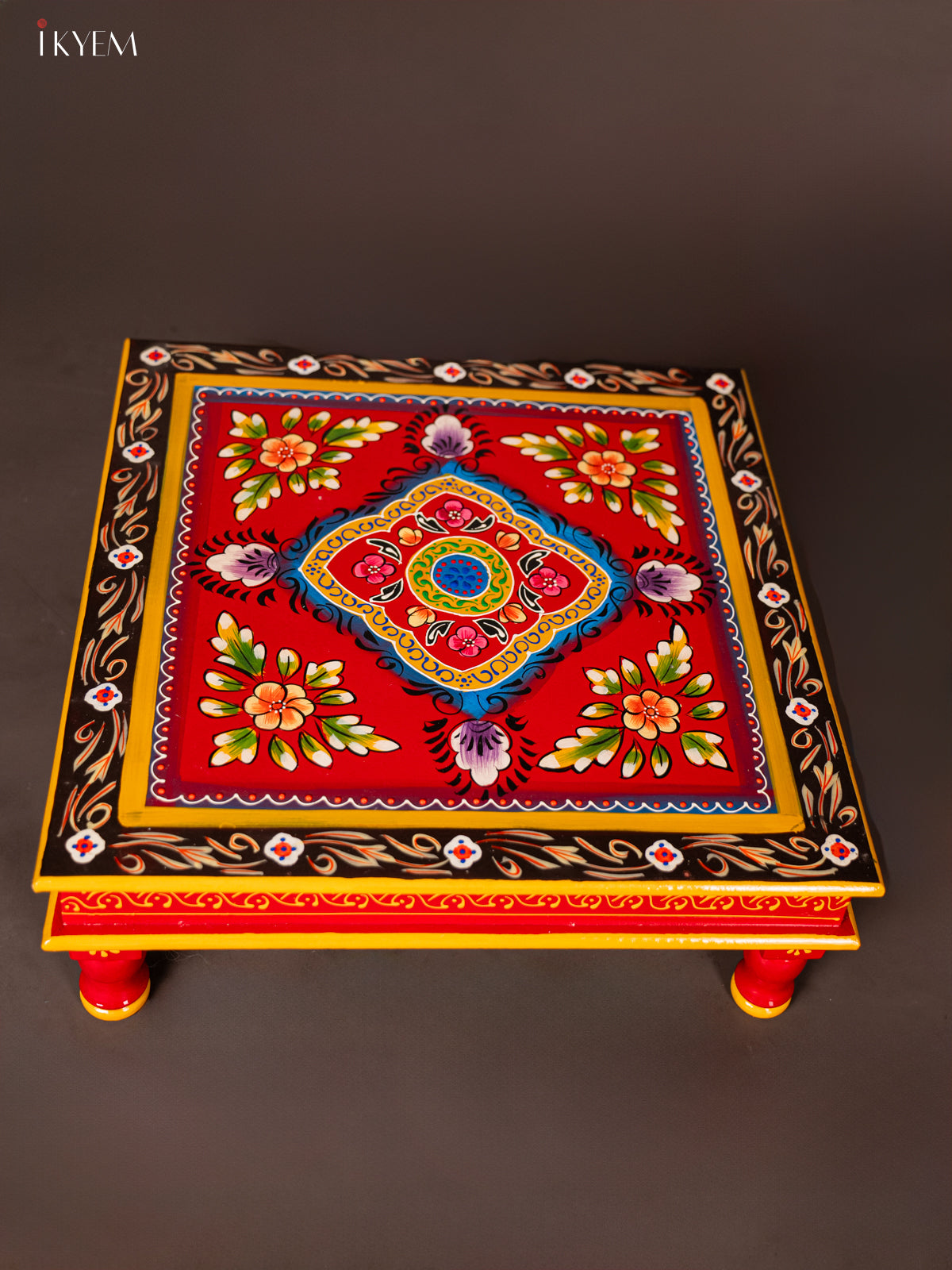 - This 18-inch Wooden Hand Painted Manai/Bajot Stand in red is ideal for pooja rituals and enhances any home decor with its traditional craftsmanship.