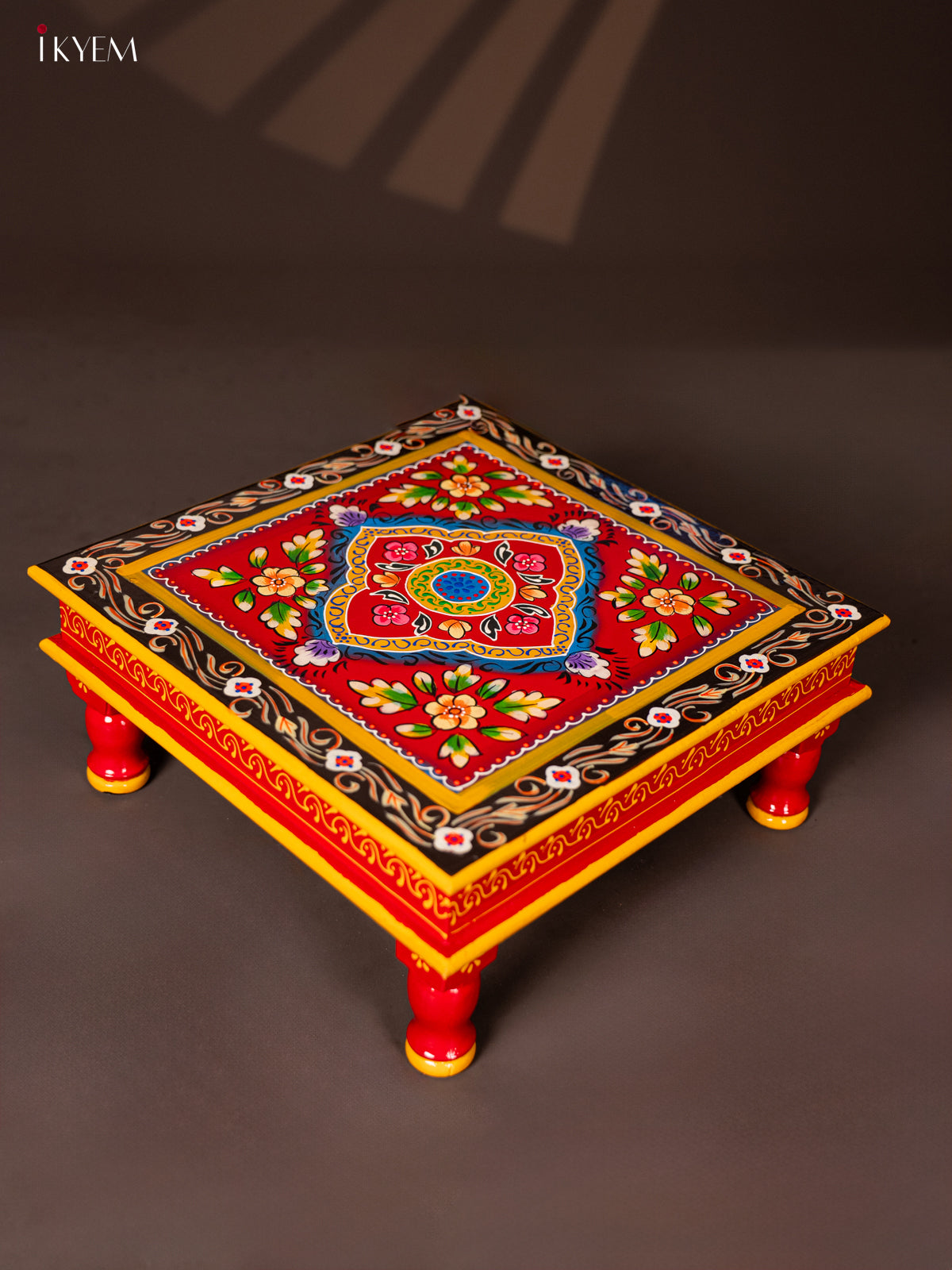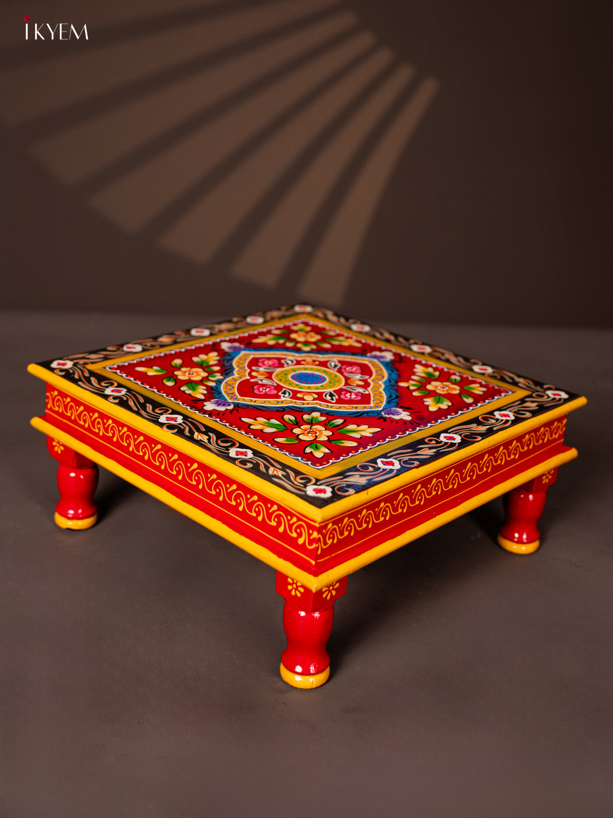 - This 15-inch Wooden Hand Painted Manai/Bajot Stand in red is ideal for pooja rituals and enhances any home decor with its traditional craftsmanship.