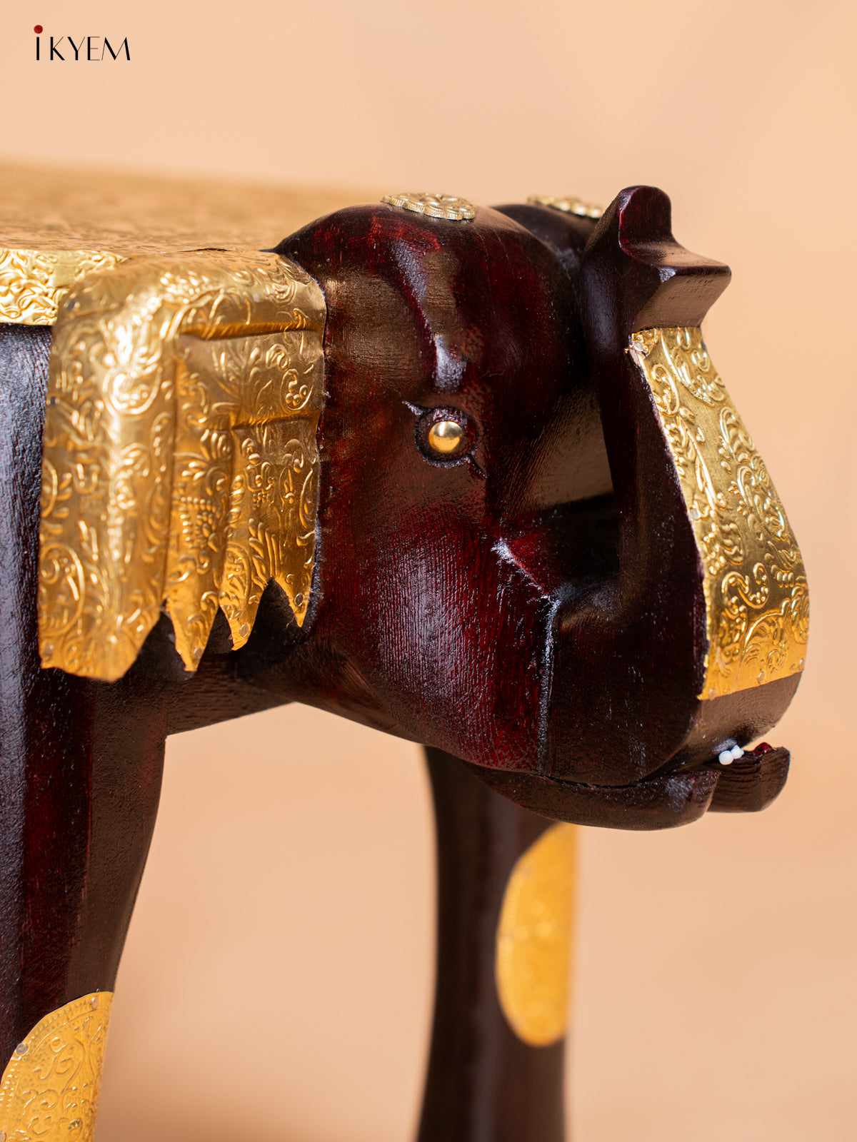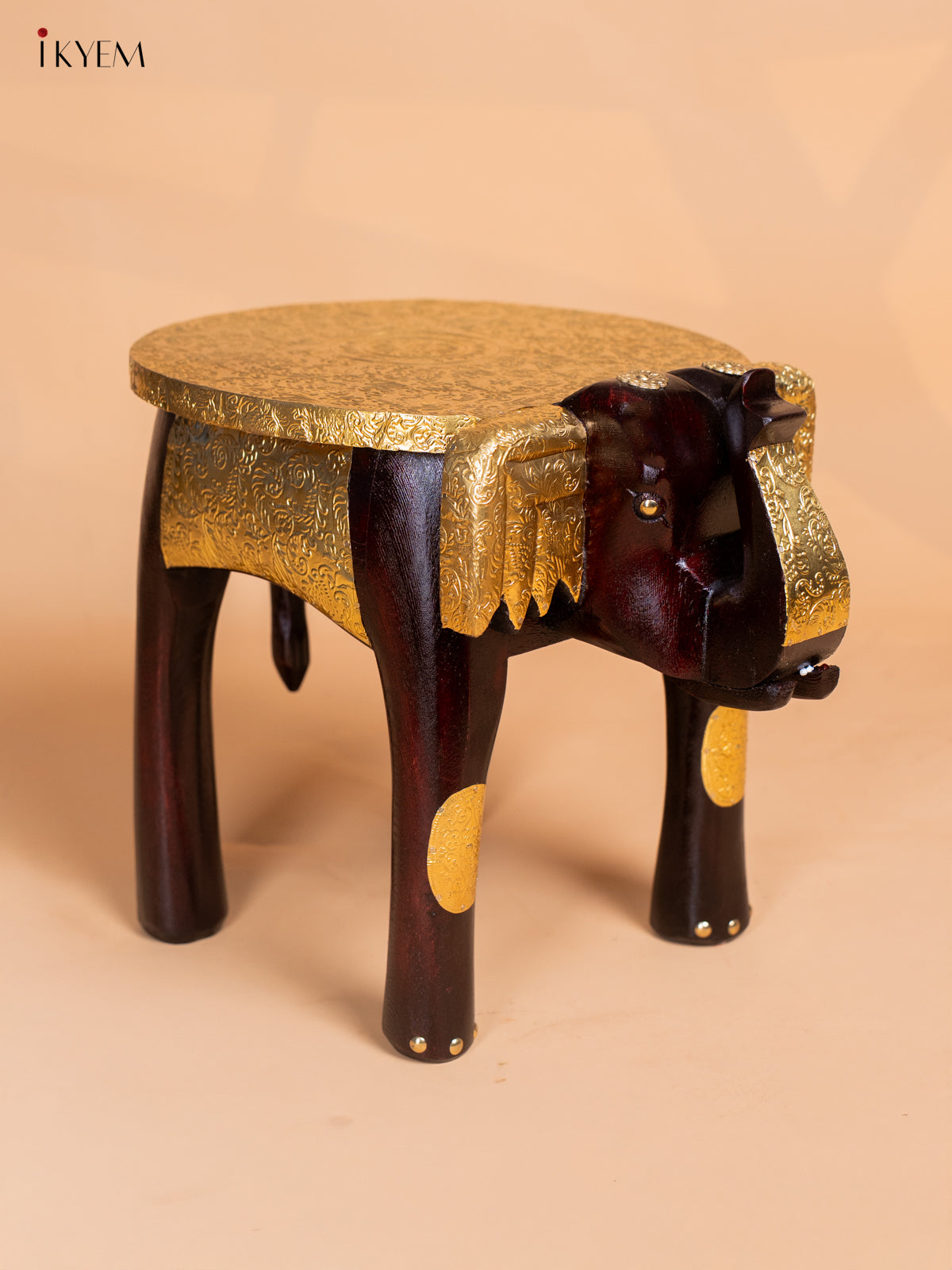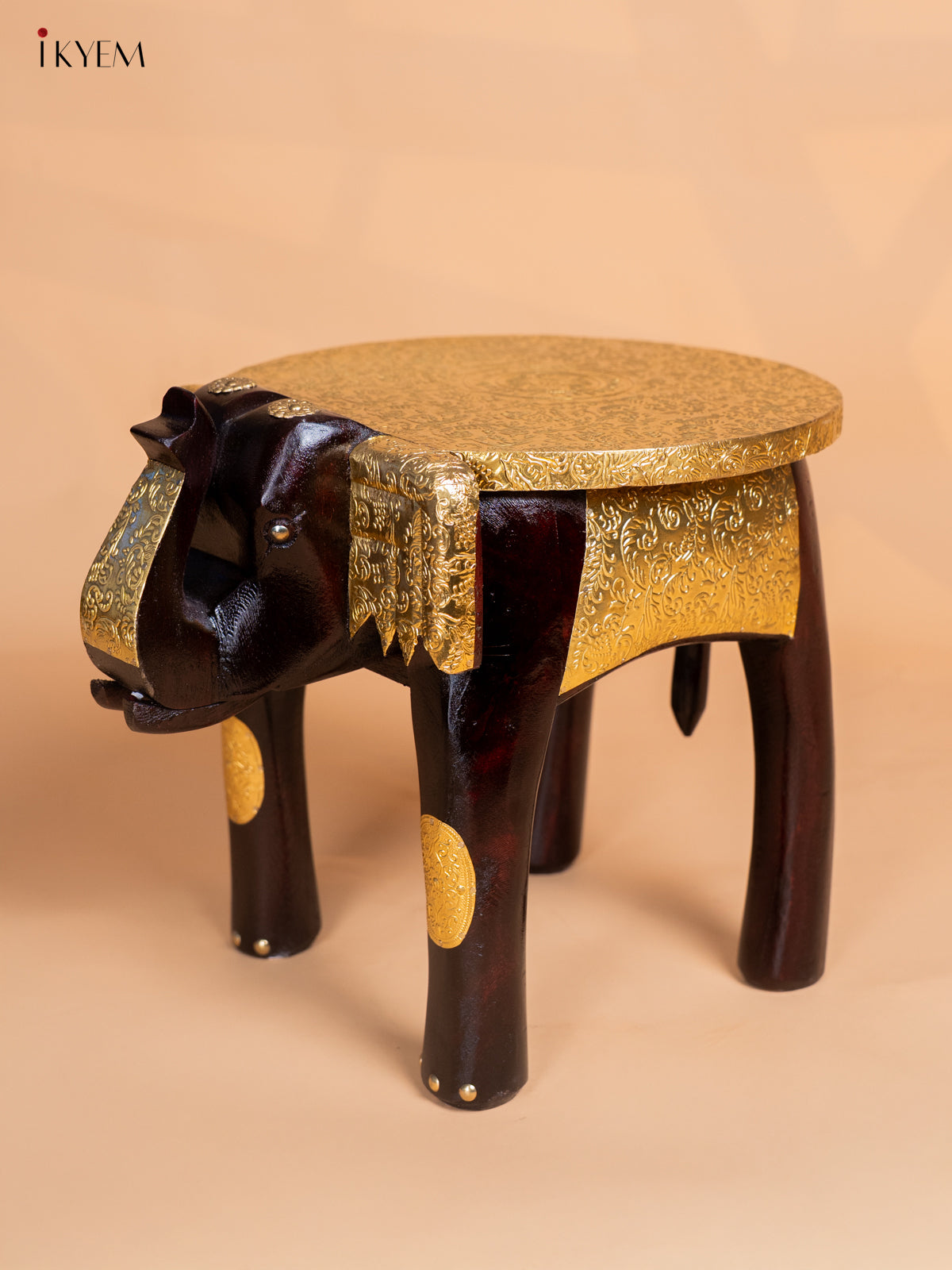 - Expertly handcrafted, this decorative stool features a beautifully carved wooden elephant base adorned with detailed brass fittings that showcase exceptional craftsmanship.