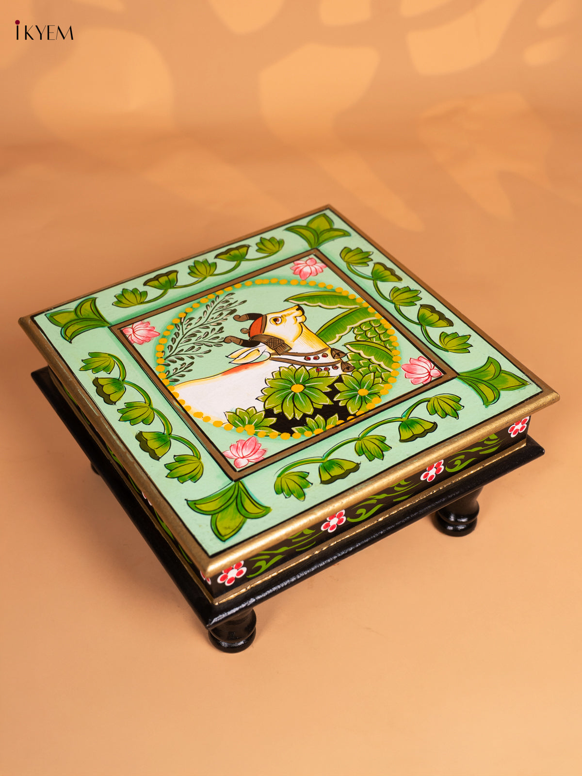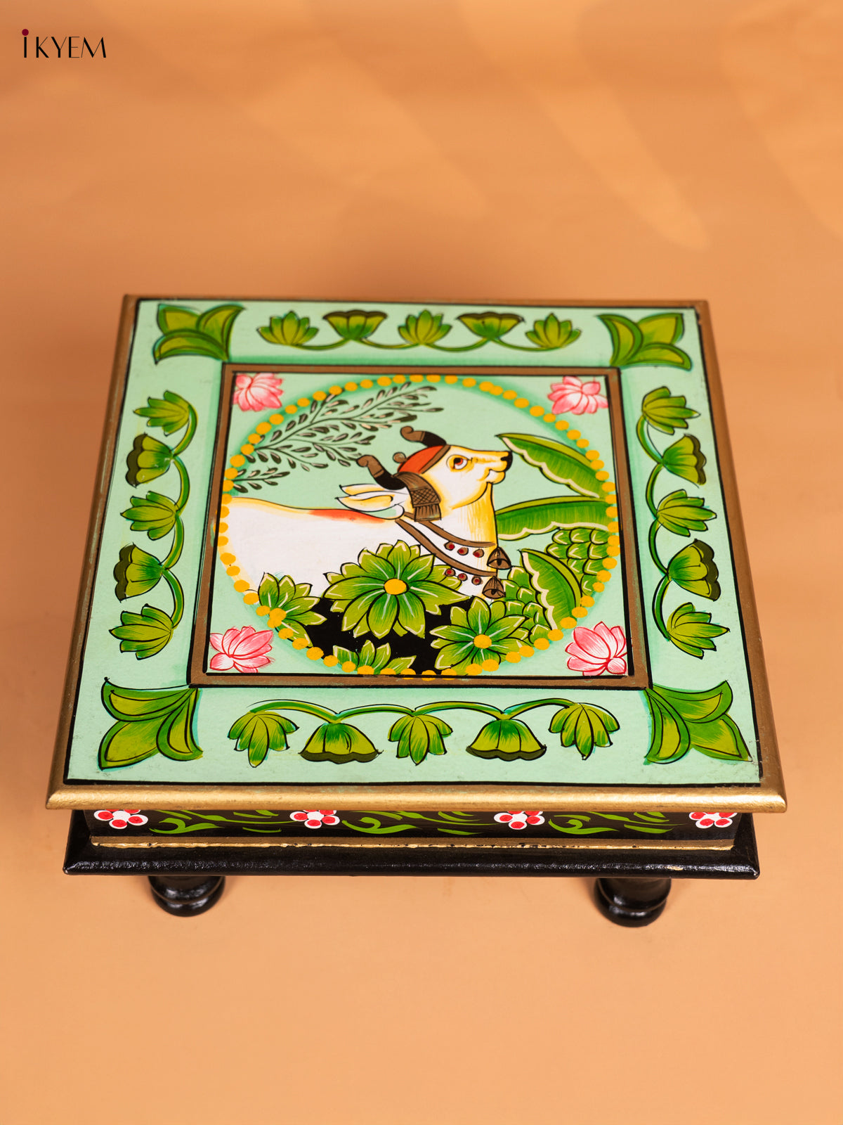 Cow Hand-Painted Wooden Bajot - Green - 12 Inches - KN15112